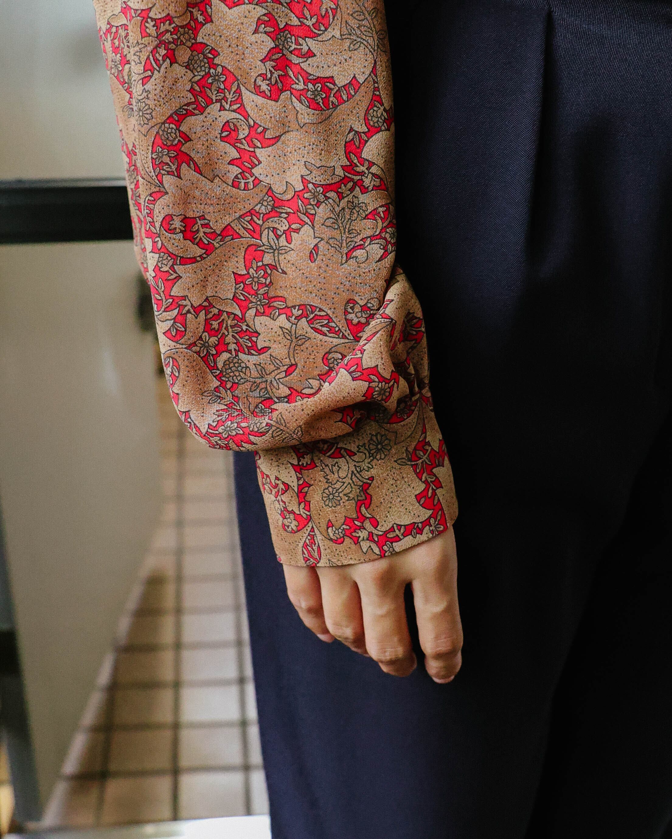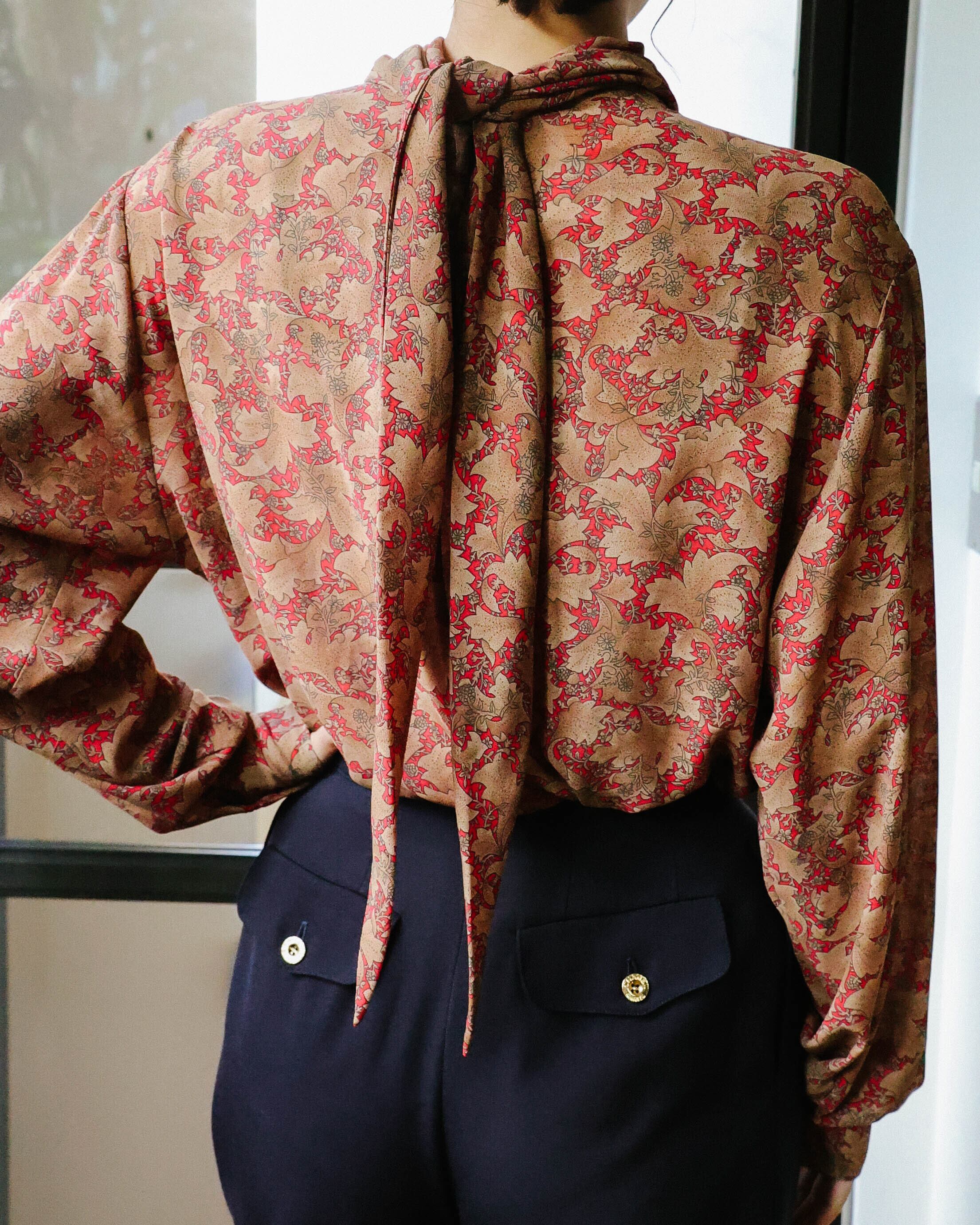 ボリューミーなボウタイの存在は今季かかせないアイテムのひとつですが、こちらのブラウスはフロントタイではなくバックタイという珍しいタイプ。シックな色合いと個性のある柄、コーデの楽しみが増えます。