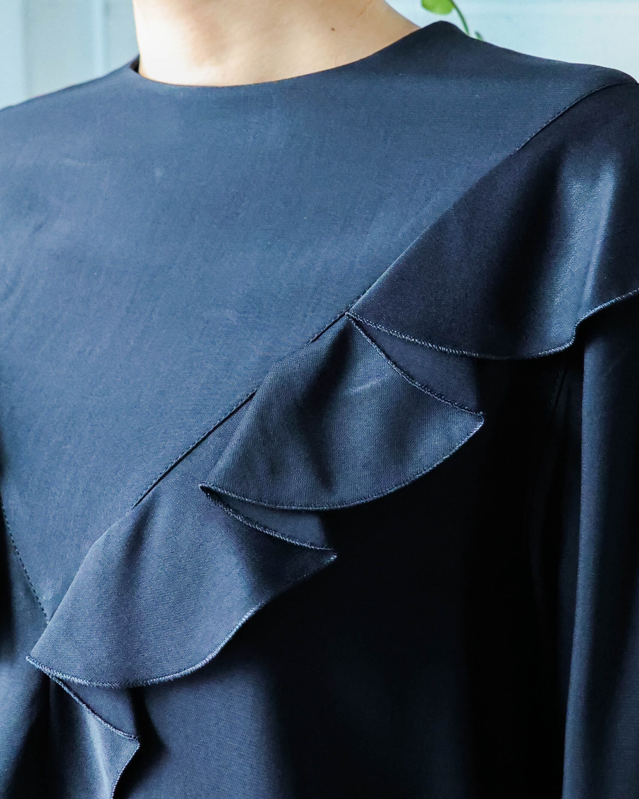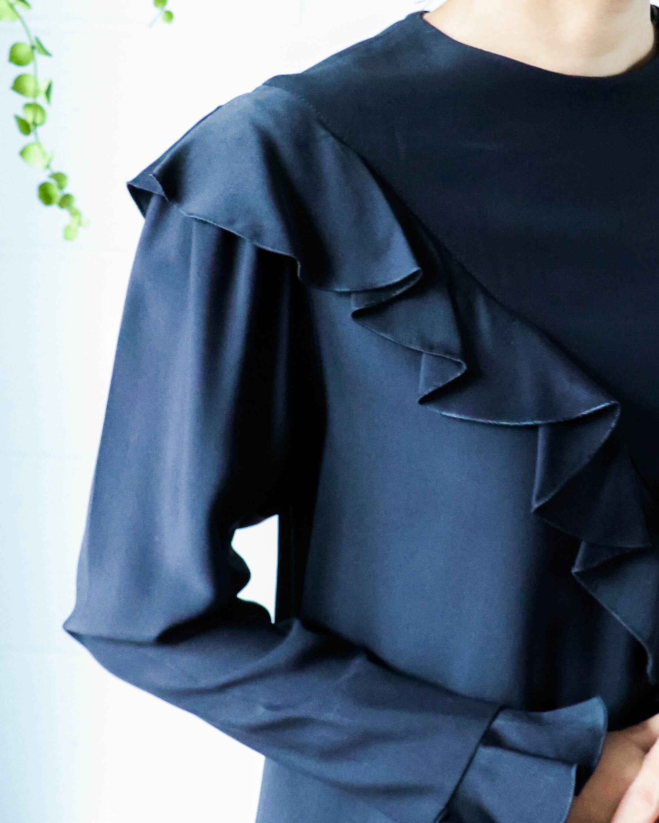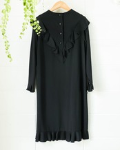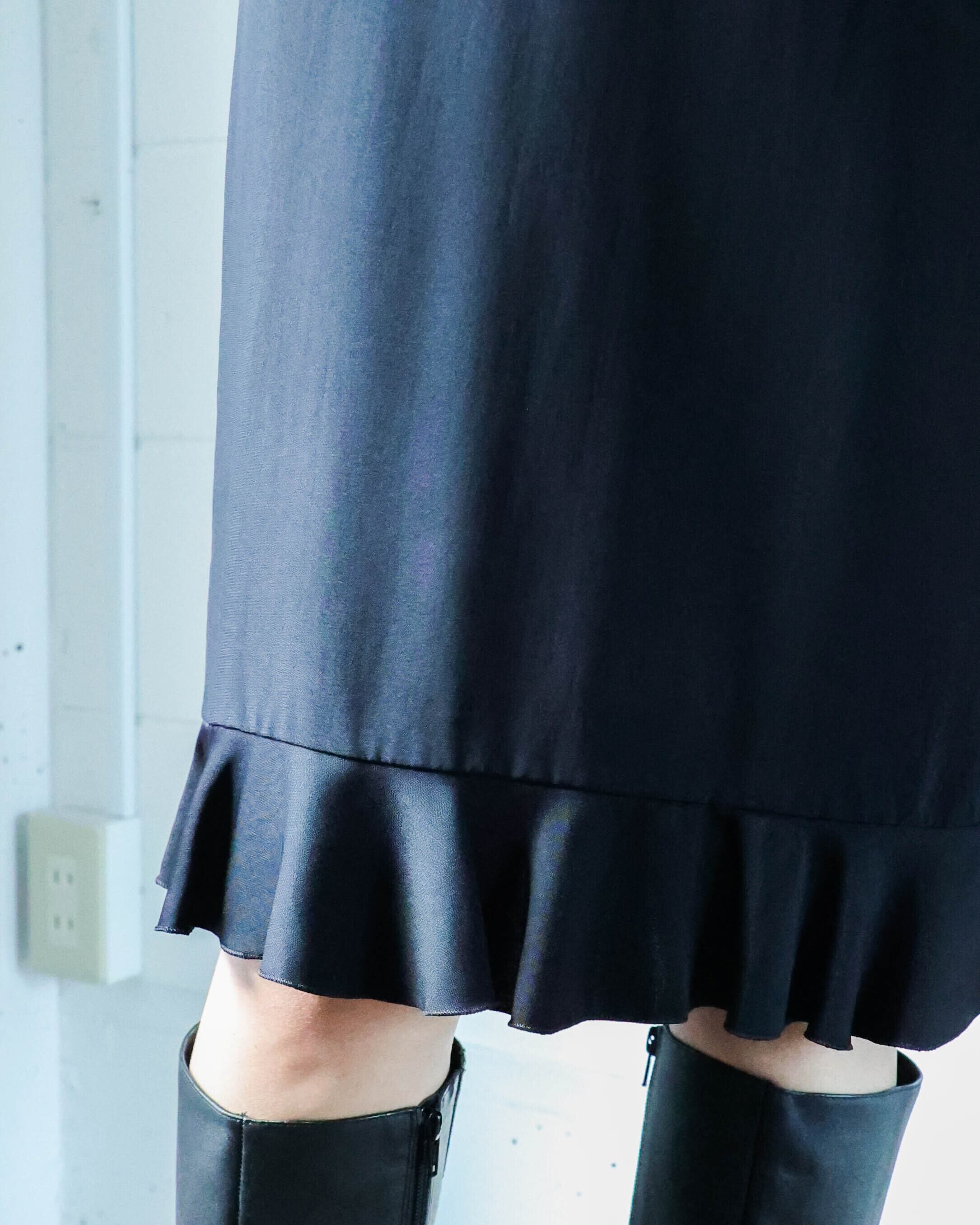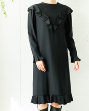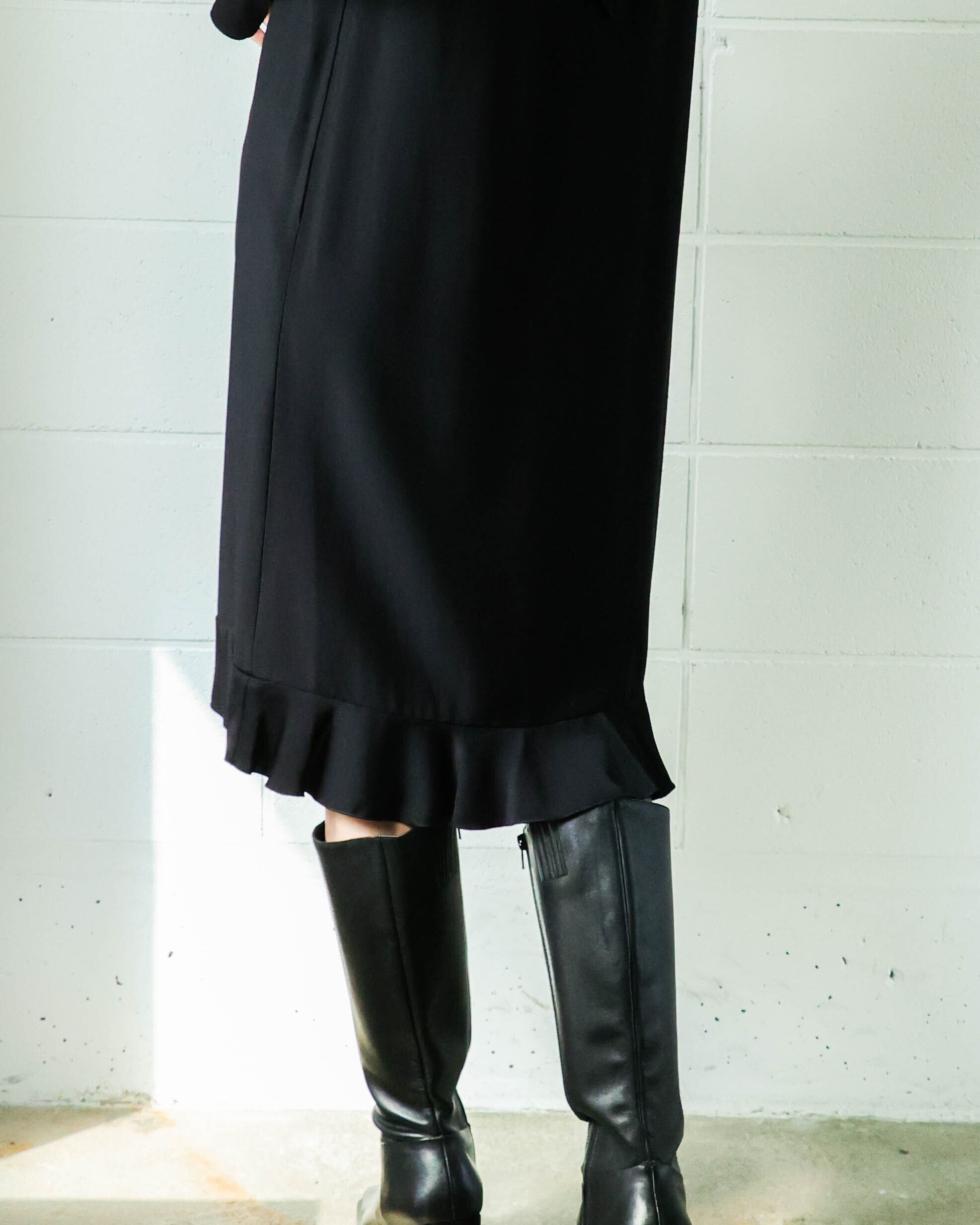 艶やかなブラックと程よく甘さをプラスする控えめなフリルが大人の女性らしさを演出。着心地滑らかな上質素材が上品でしなやかな印象に。ロングブーツやレイヤードとも相性の良い丈に加え、体型カバーもしてくれるシルエットは様々なシーンで重宝します。