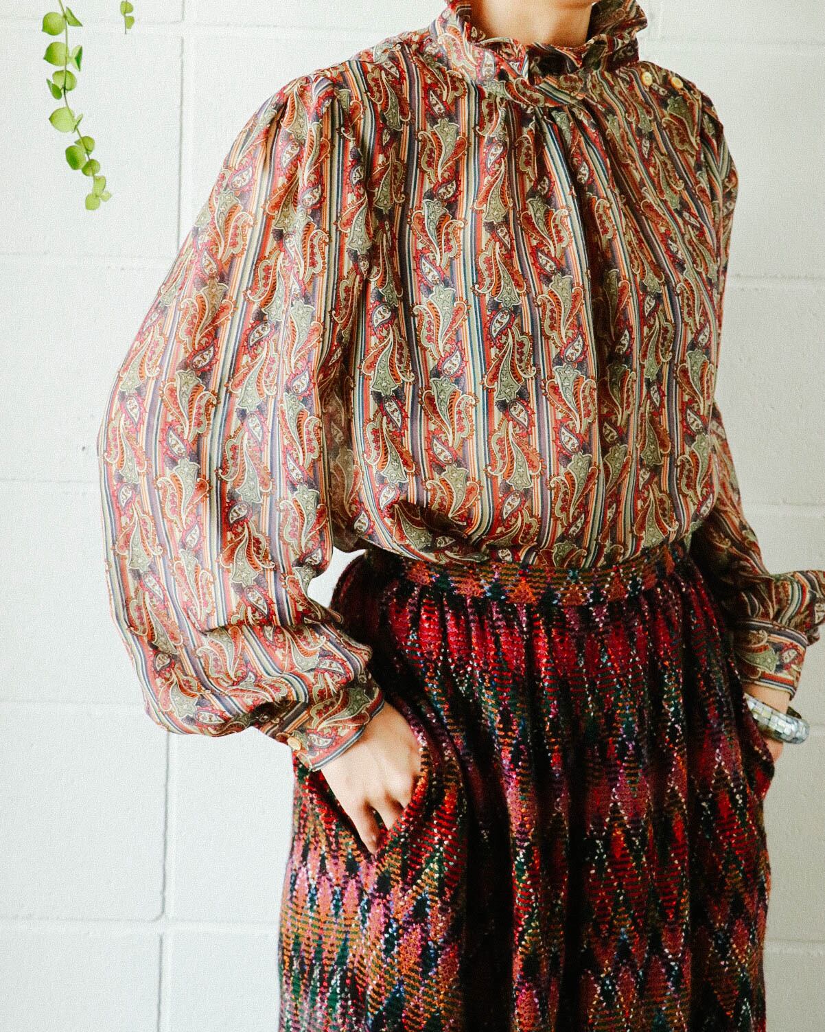 フリルのスタンドカラーと多色な柄がかわいいブラウス。