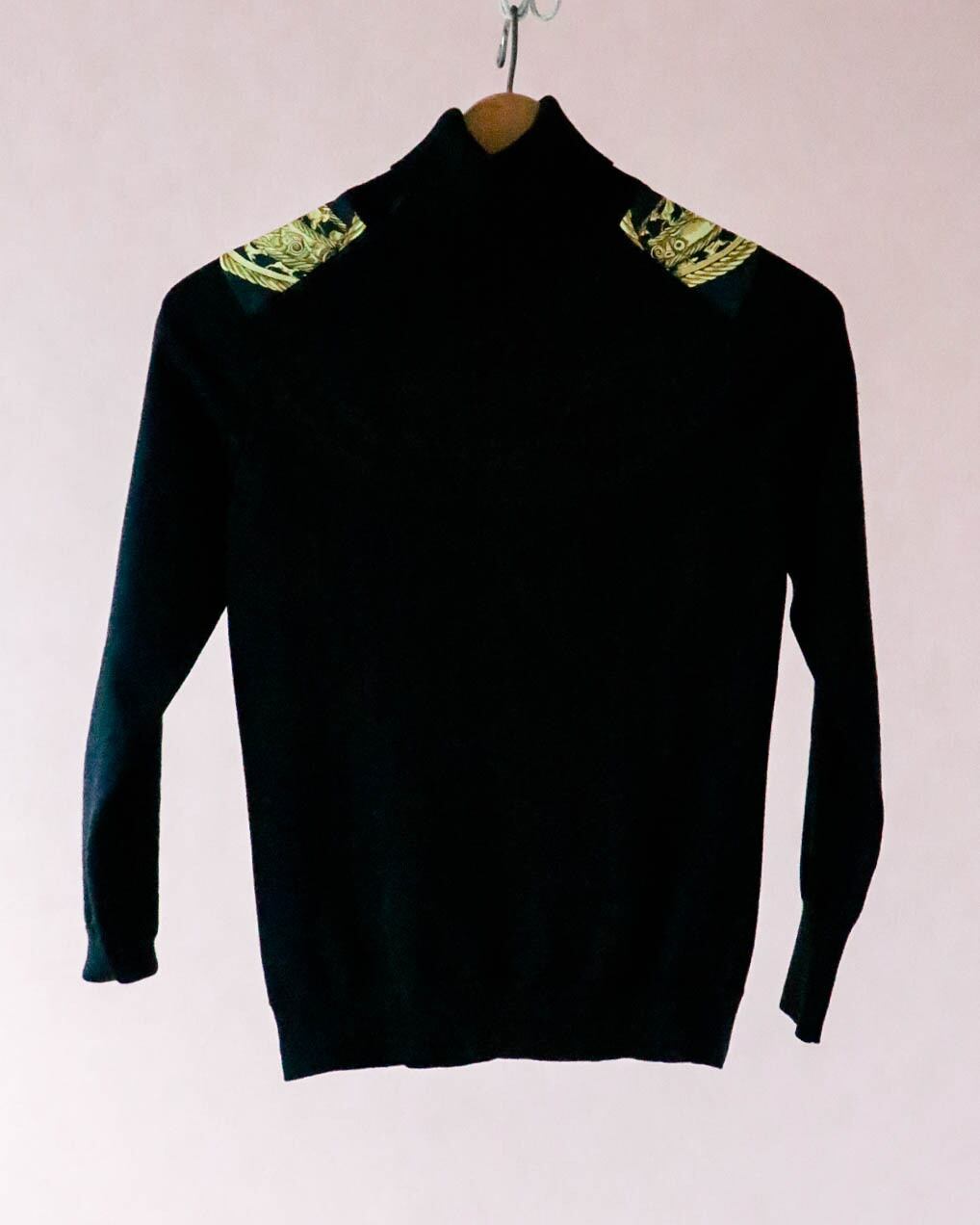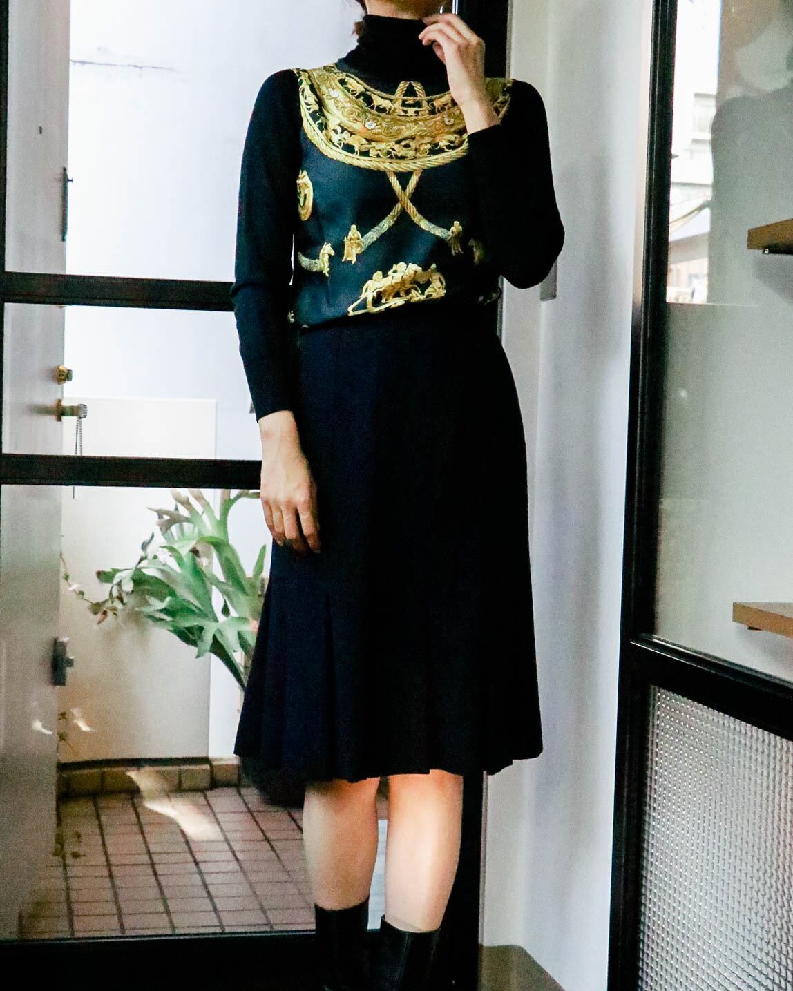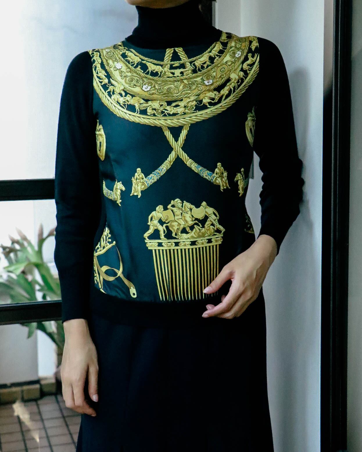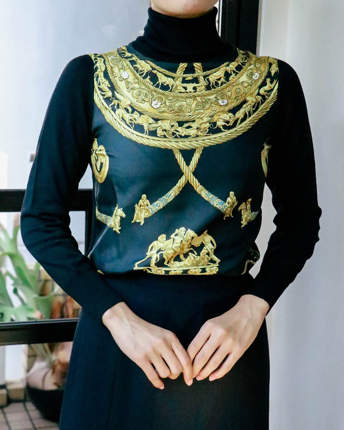 1980年代エルメスのトップス。フロントはオールシルク!エルメスらしい圧倒的なデザインでさりげないブルーのアクセントも美しい。インパクトのある柄もタートルネックで首元までブラックが締めてくれるのでバランスをとりやすい。冬に向けて、高品質なウールと高級感だけでなく保温力も高いシルク素材のコンビネーションは有難いです。