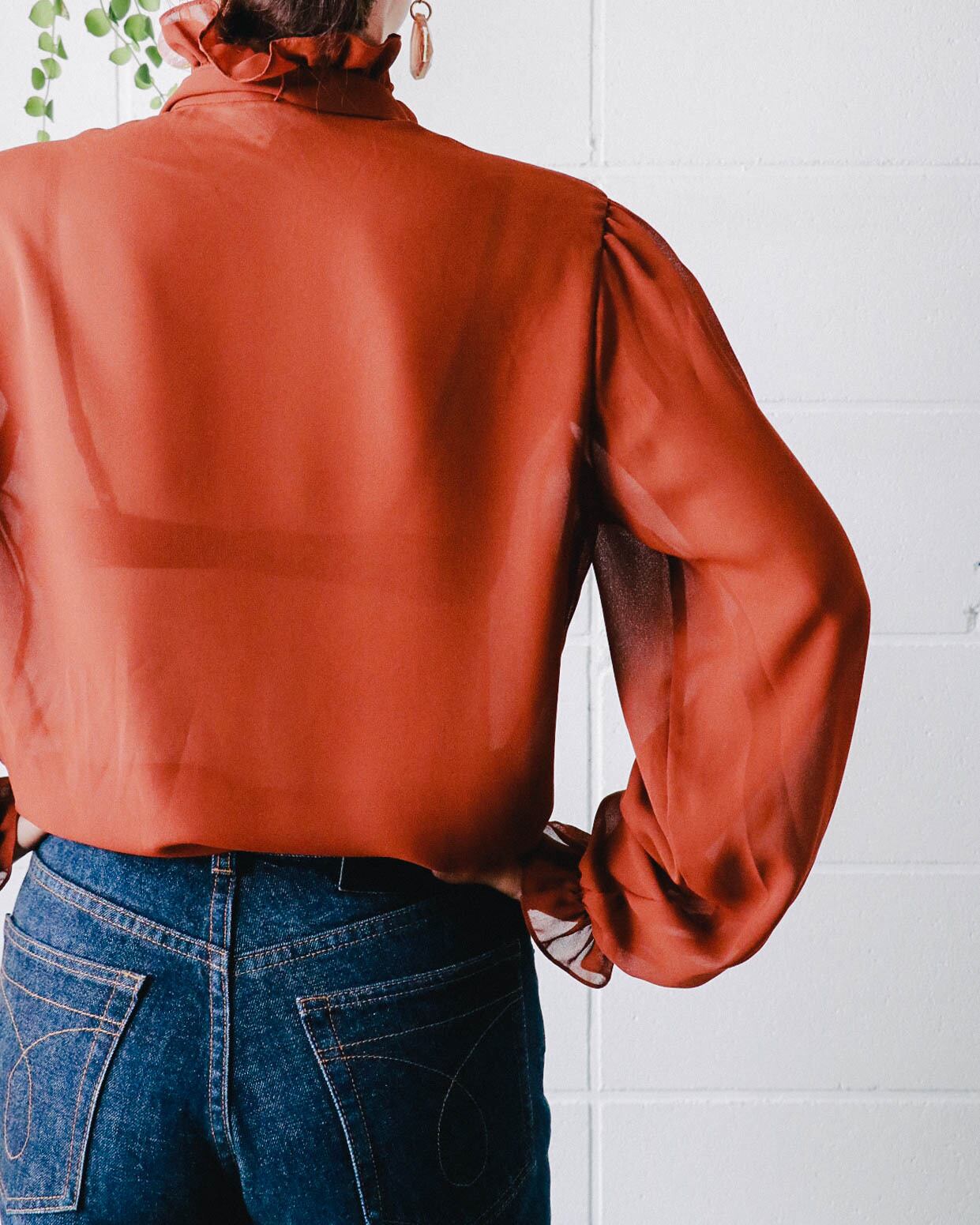 ブリックオレンジに近いブラウンカラーで甘いディテールをカジュアルにもっていくバランスがとてもいいブラウスです。