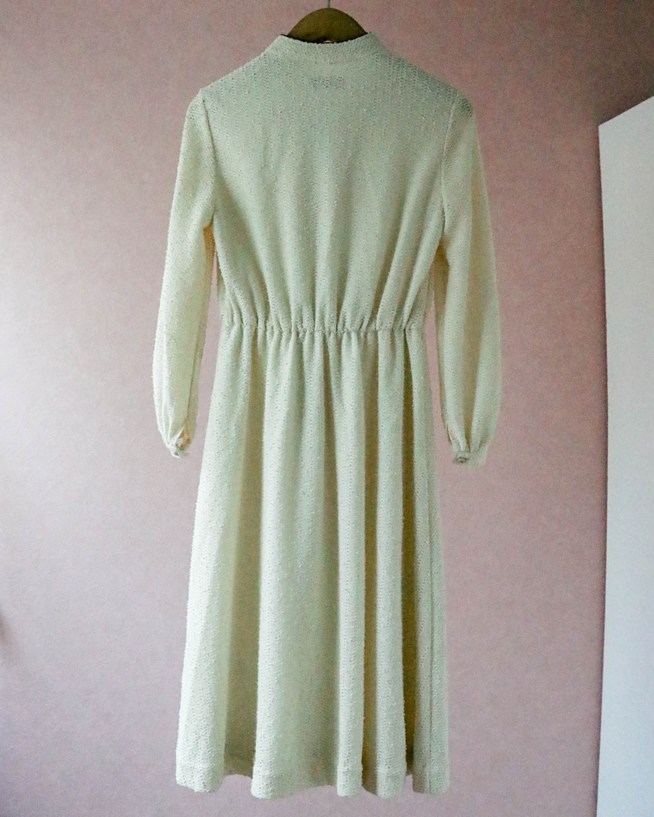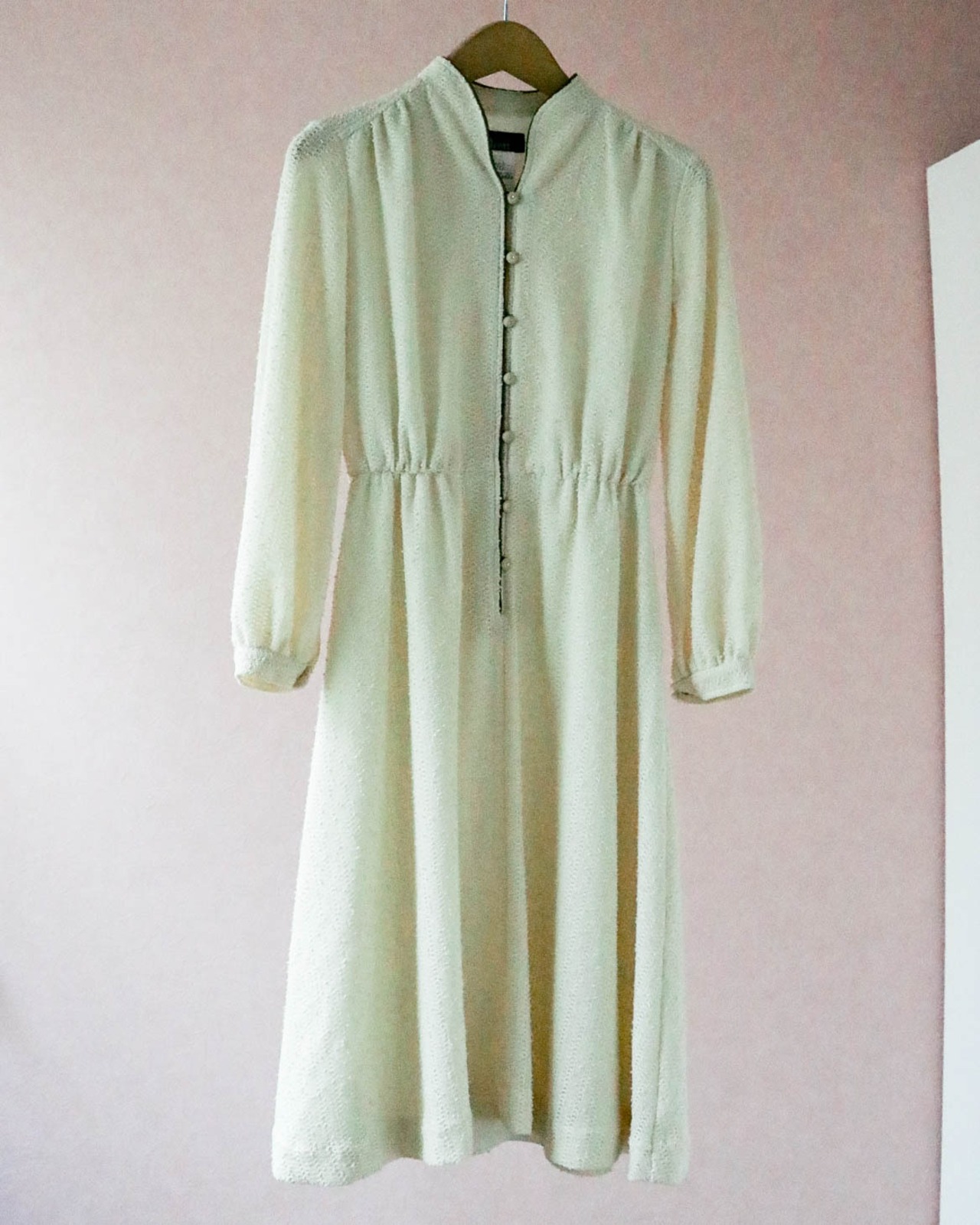 優しいホワイト地に、ブラウンのパイピングとリズム良く並ぶボタンがアクセントになったこちらのワンピースは、1970年代のもの。