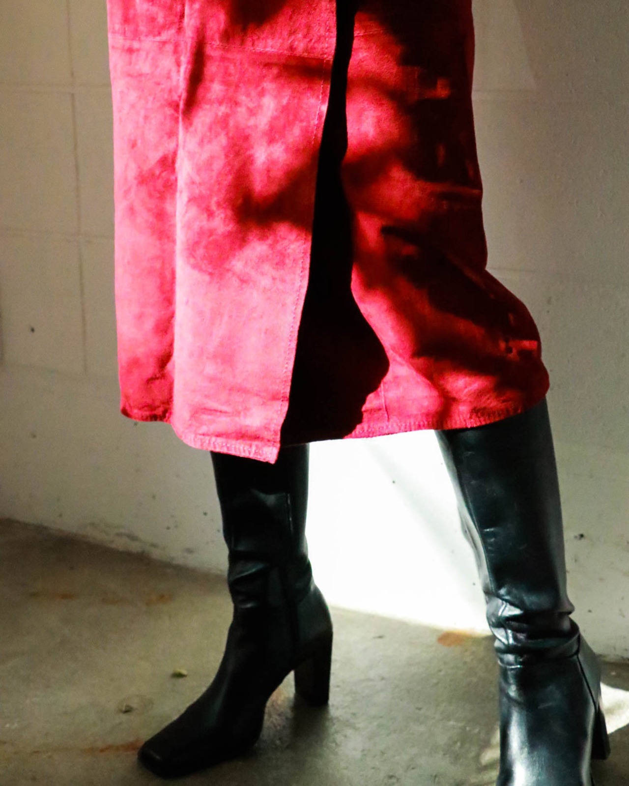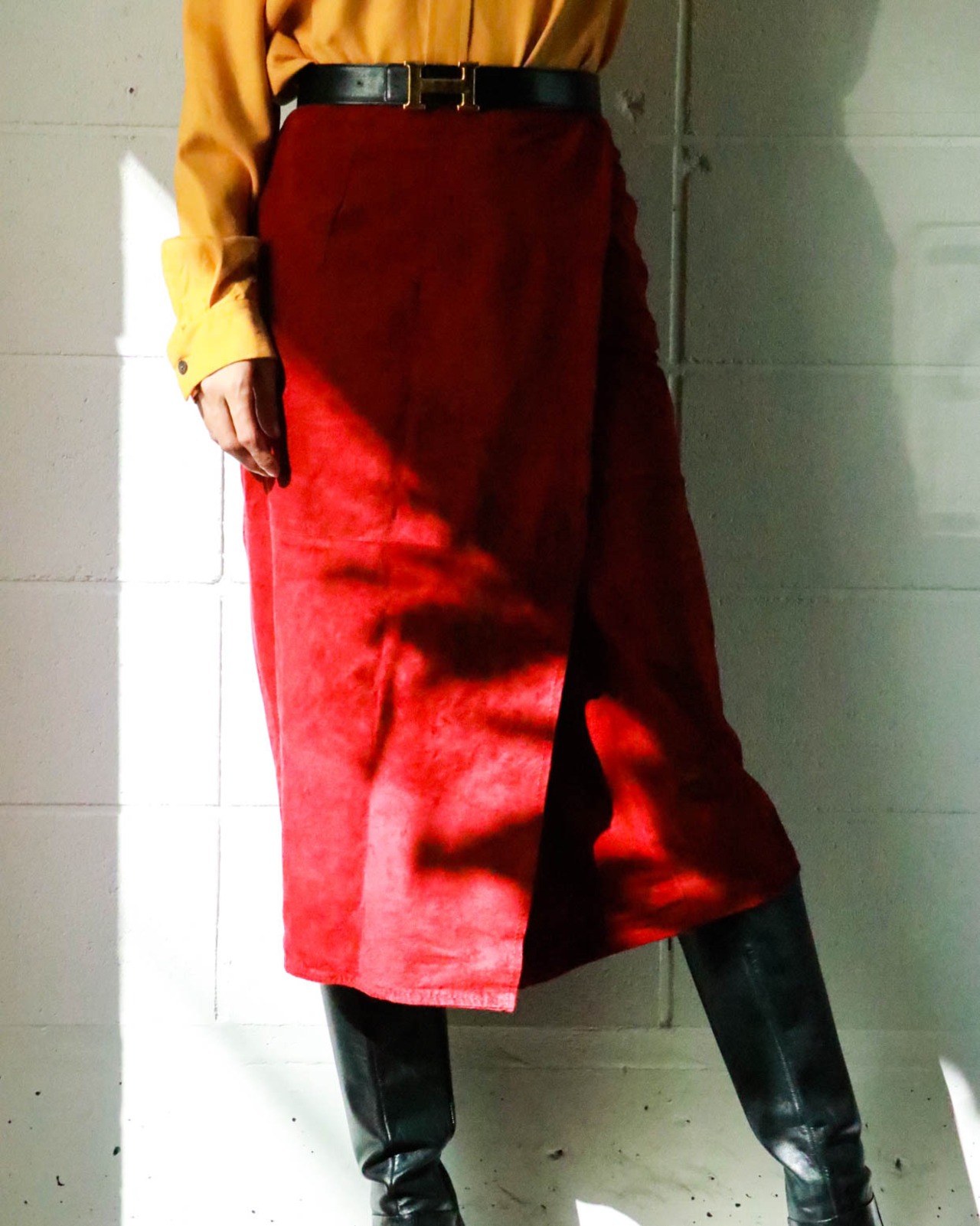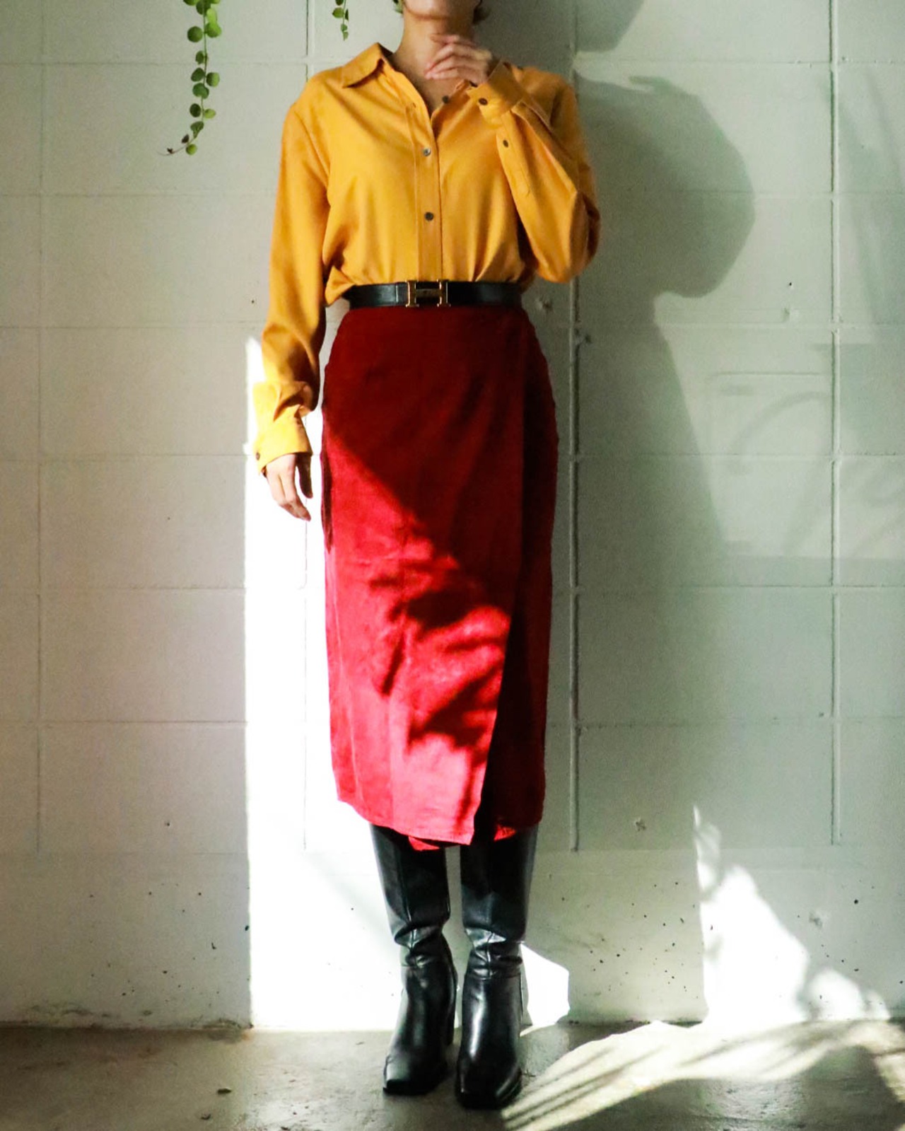 シンプルな巻きスカートでミドルブーツやロングブーツと合わせたくなる丈もいい感じです。