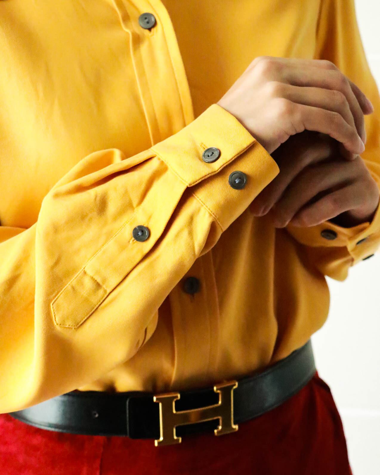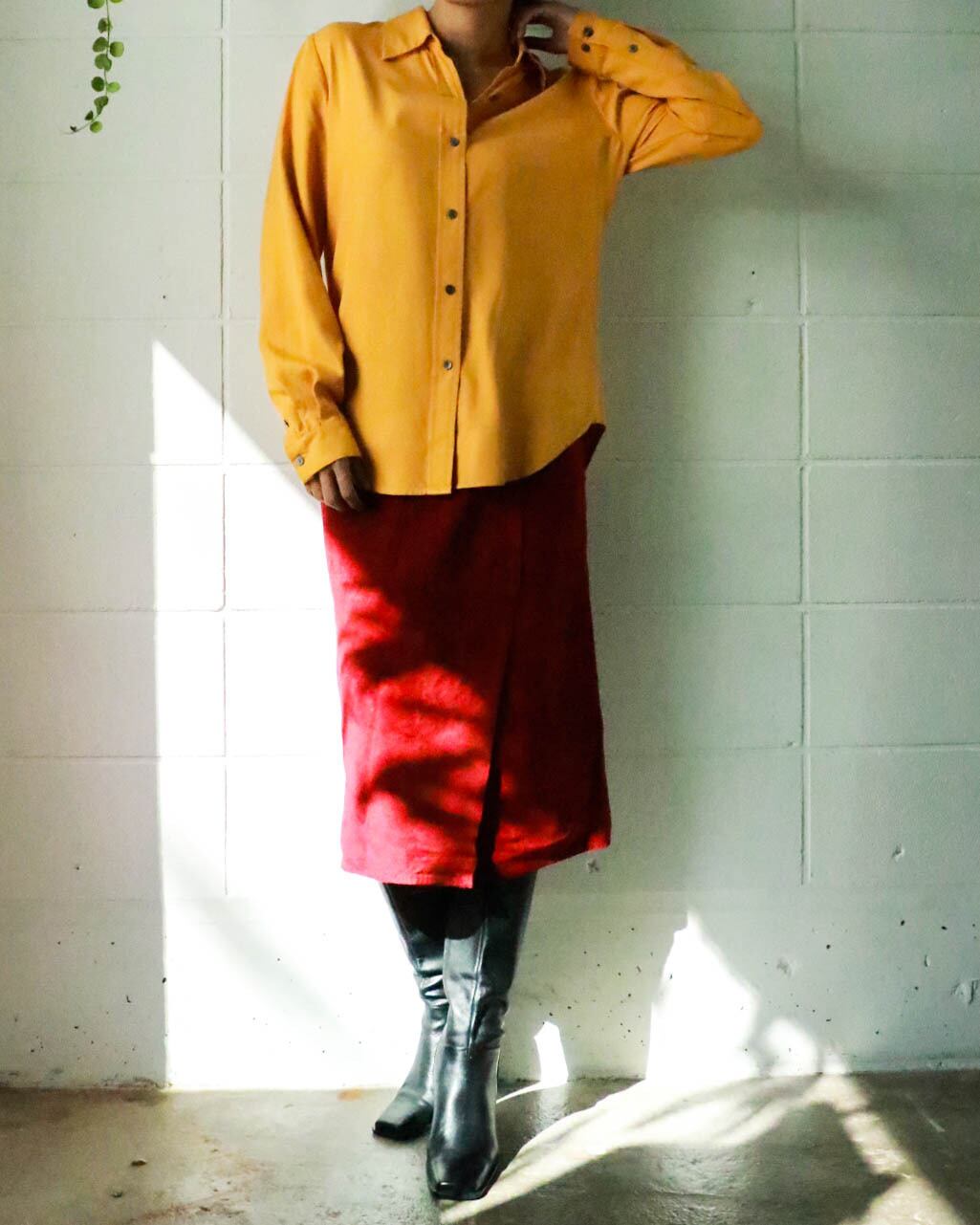 落ち着きのあるマスタードイエローはどんなボトムスとも相性抜群。