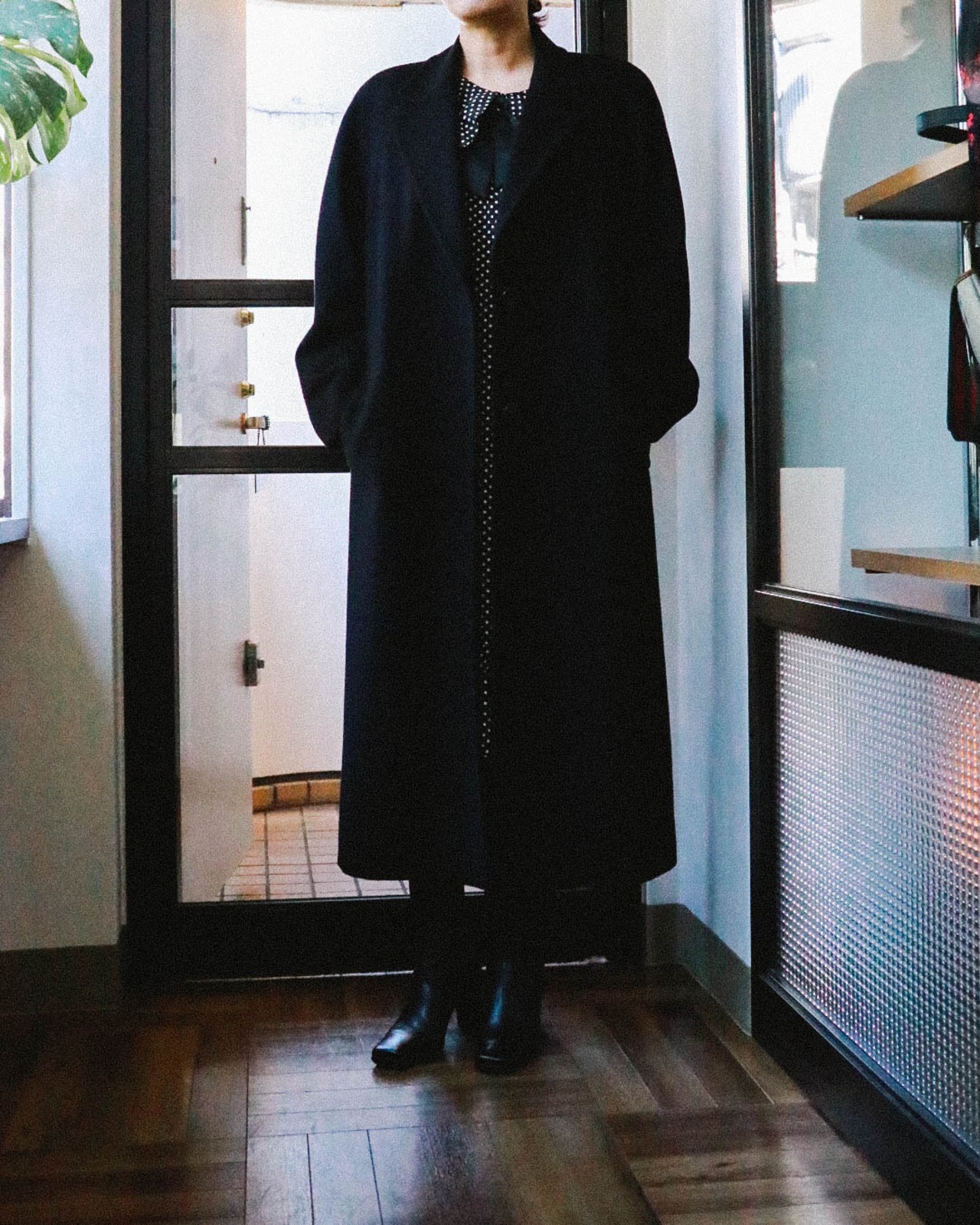 計算されたシンプルさが優美なウンガロのブラックロングコート