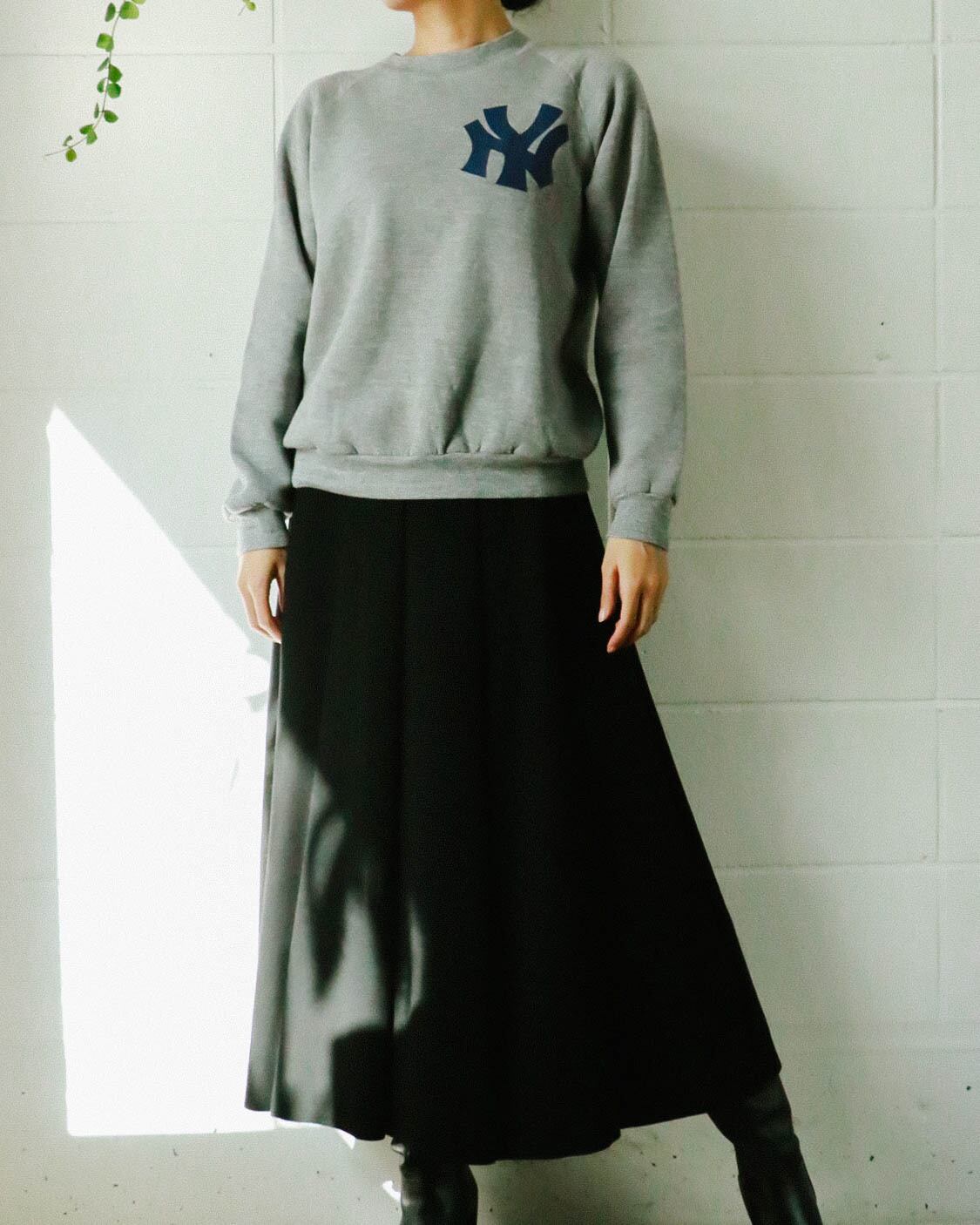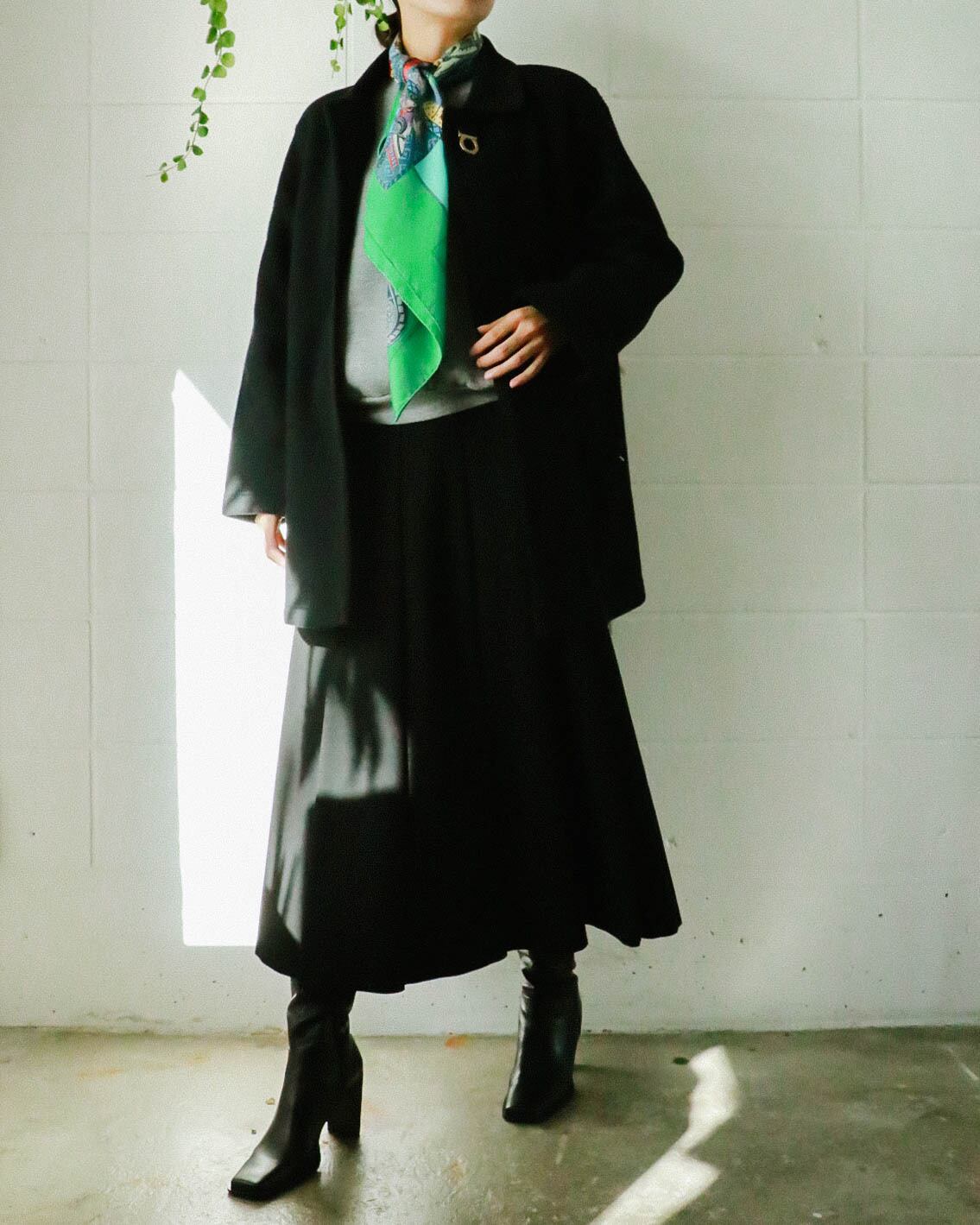 入荷したてのウールのブラックスカートはプリーツが入っているように見えるデザイン。