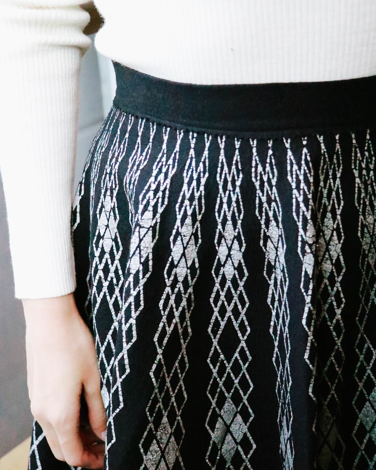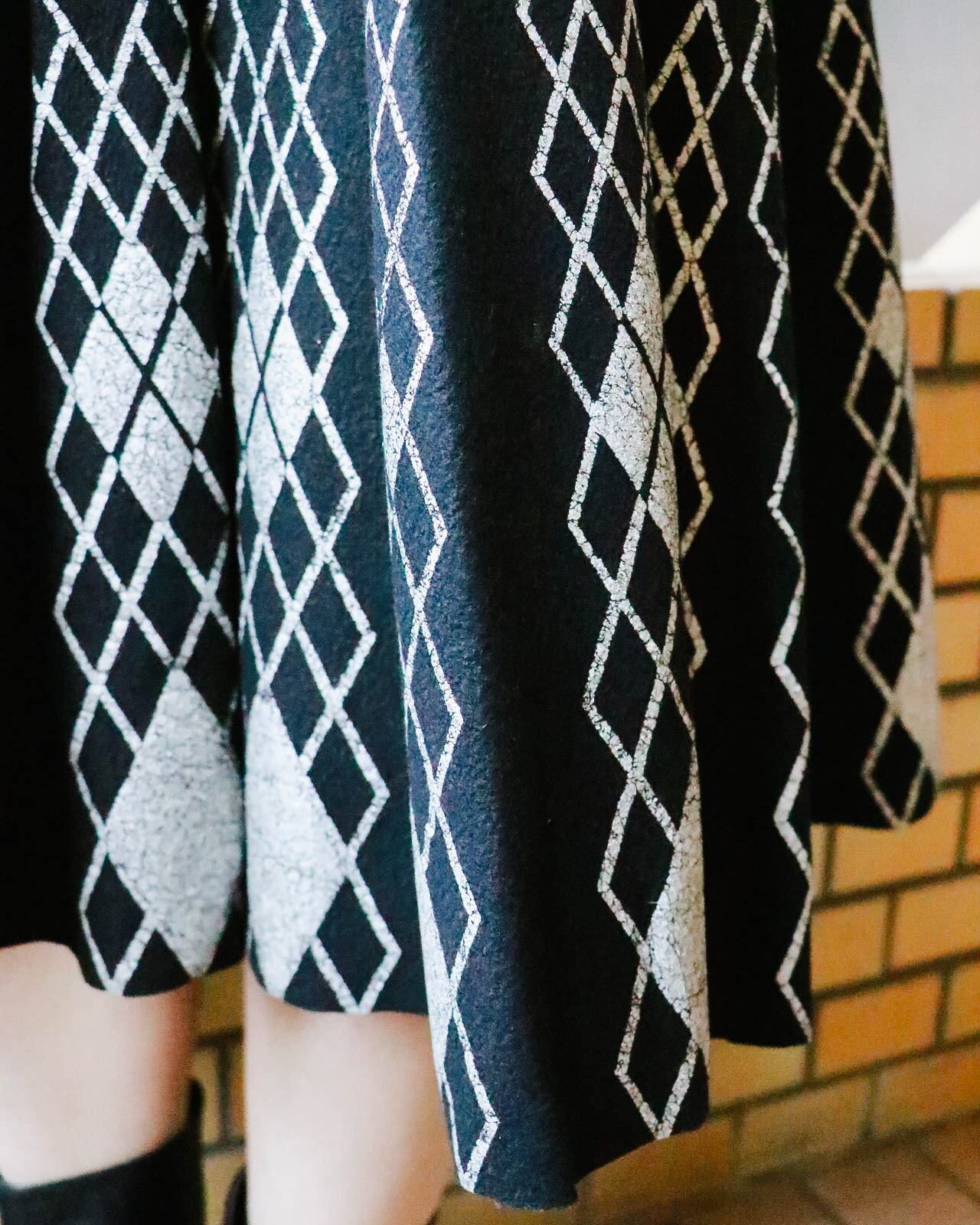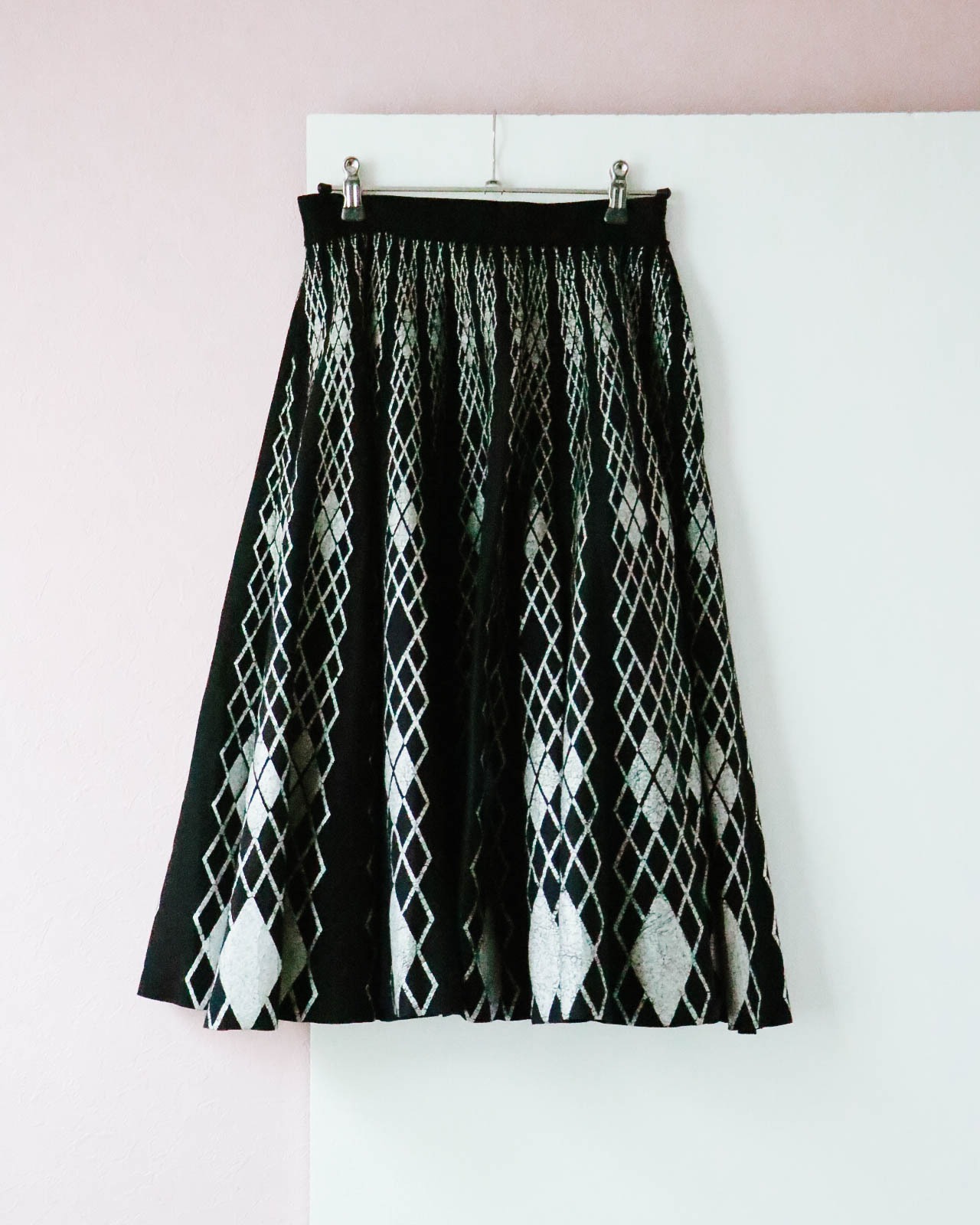 フェルト生地にシルバーの箔プリントが張りをプラス。ブラックカラーとのコントラストが美しい。キュッと閉まるウエストから広がる1950年代を象徴するフレアシルエット、縦に落ちる変形デザインのチェック柄はスタイルアップを叶えてくれる。生地を贅沢にたっぷりと使用した魅力的な一着です。