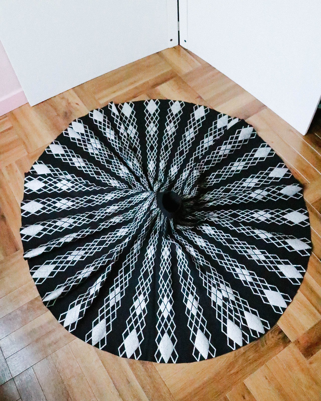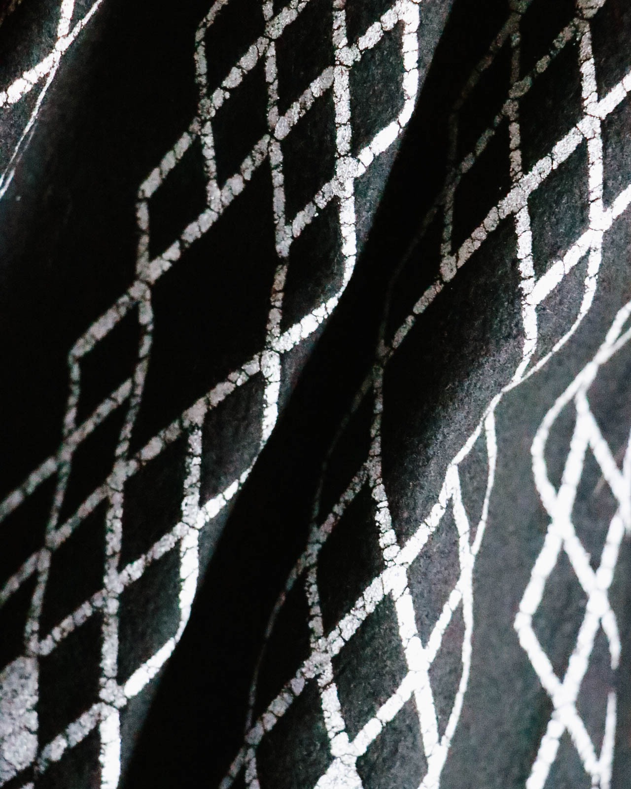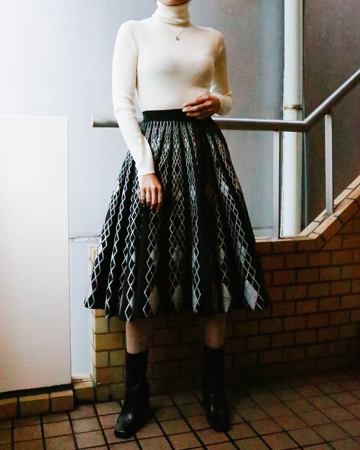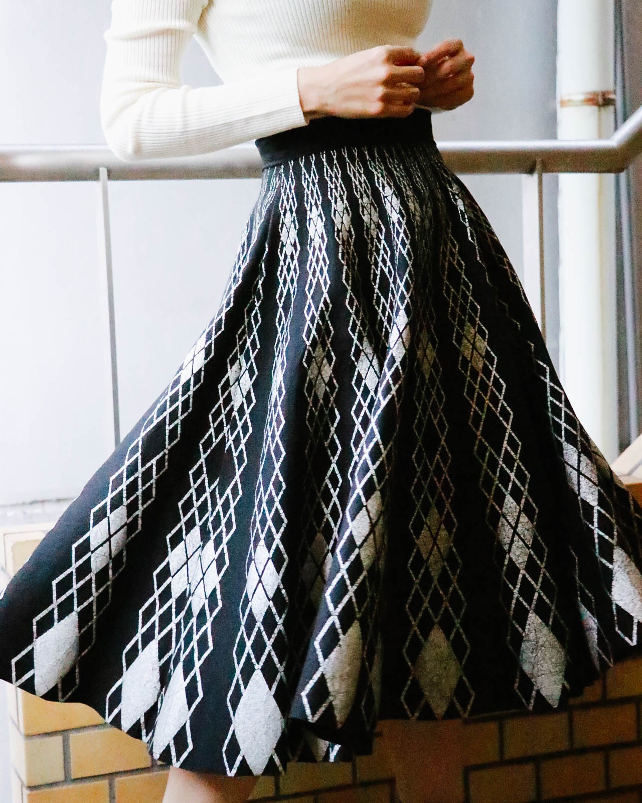 フェルト生地にシルバーの箔プリントが張りをプラス。ブラックカラーとのコントラストが美しい。キュッと閉まるウエストから広がる1950年代を象徴するフレアシルエット、縦に落ちる変形デザインのチェック柄はスタイルアップを叶えてくれる。生地を贅沢にたっぷりと使用した魅力的な一着です。