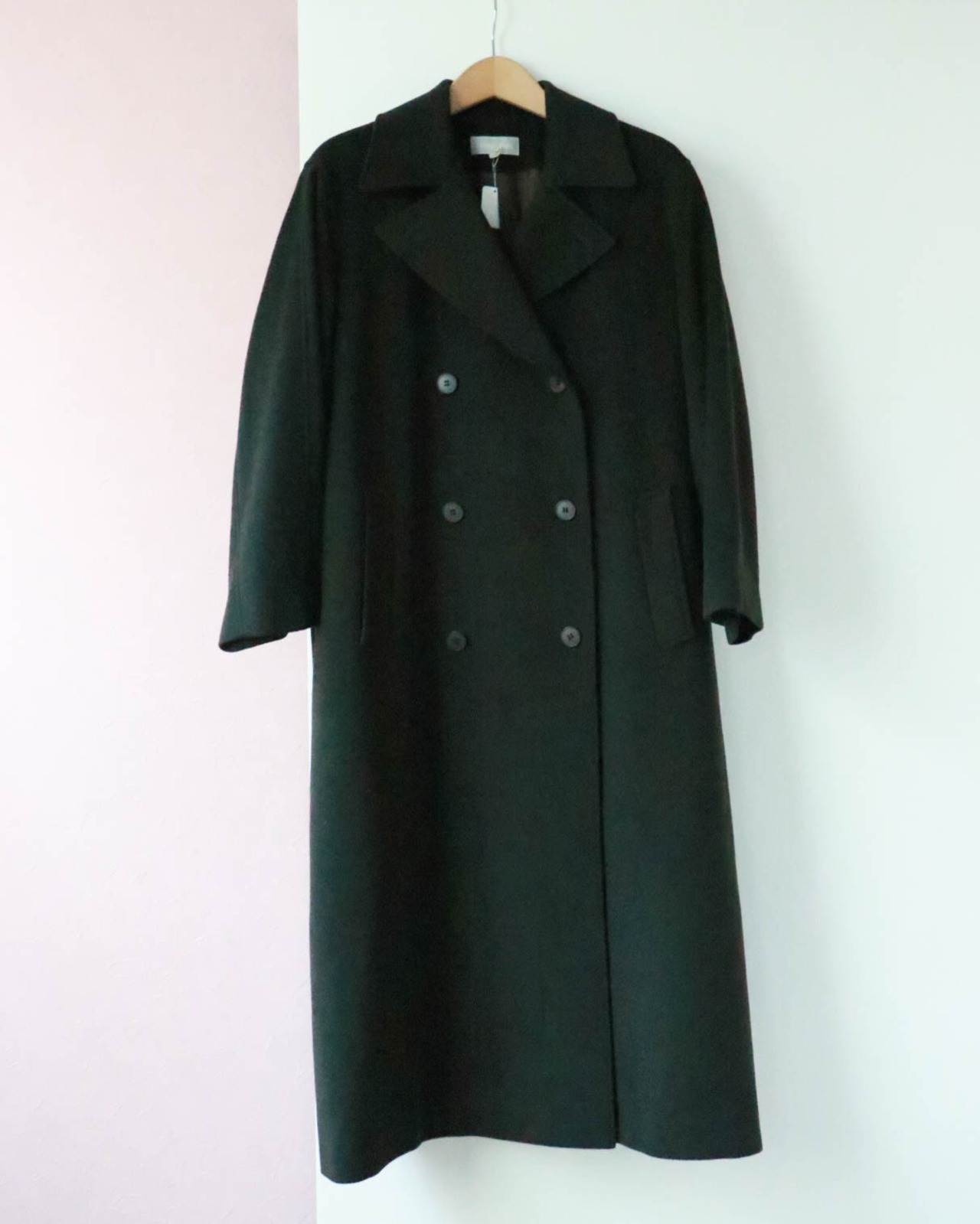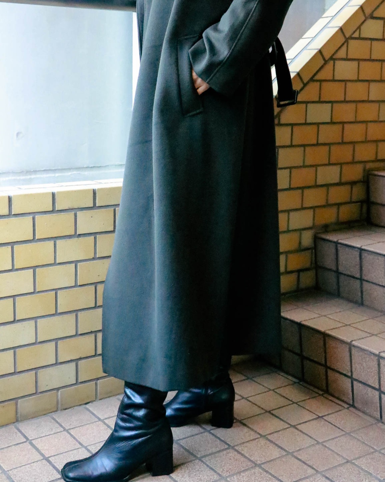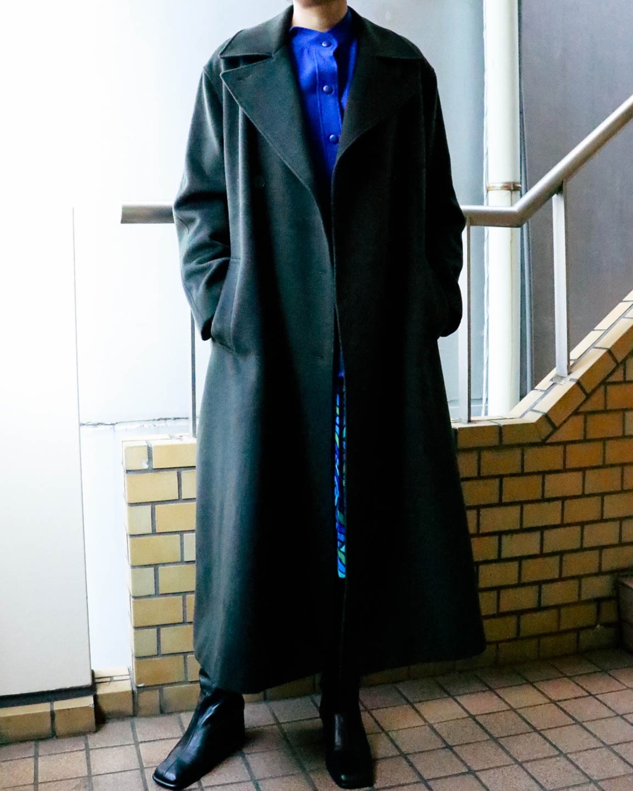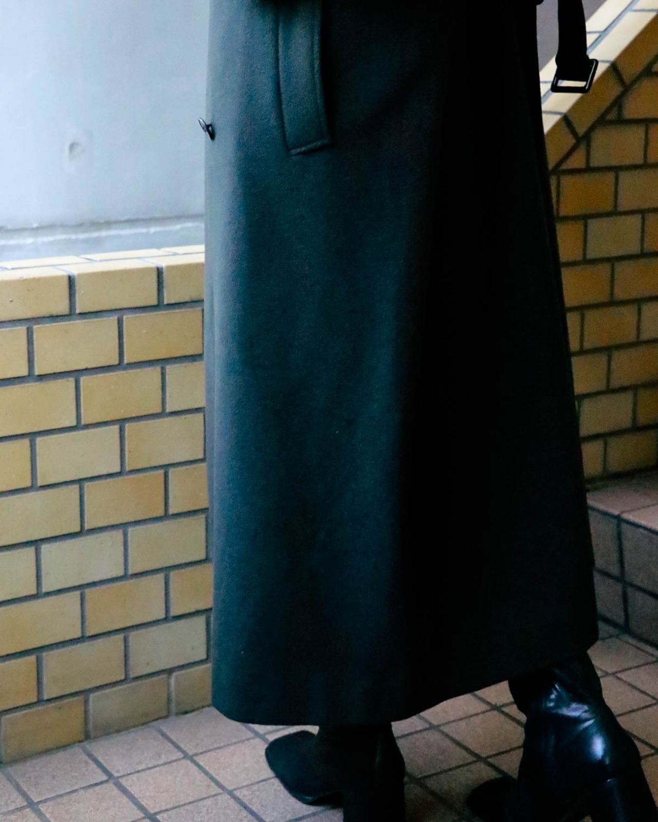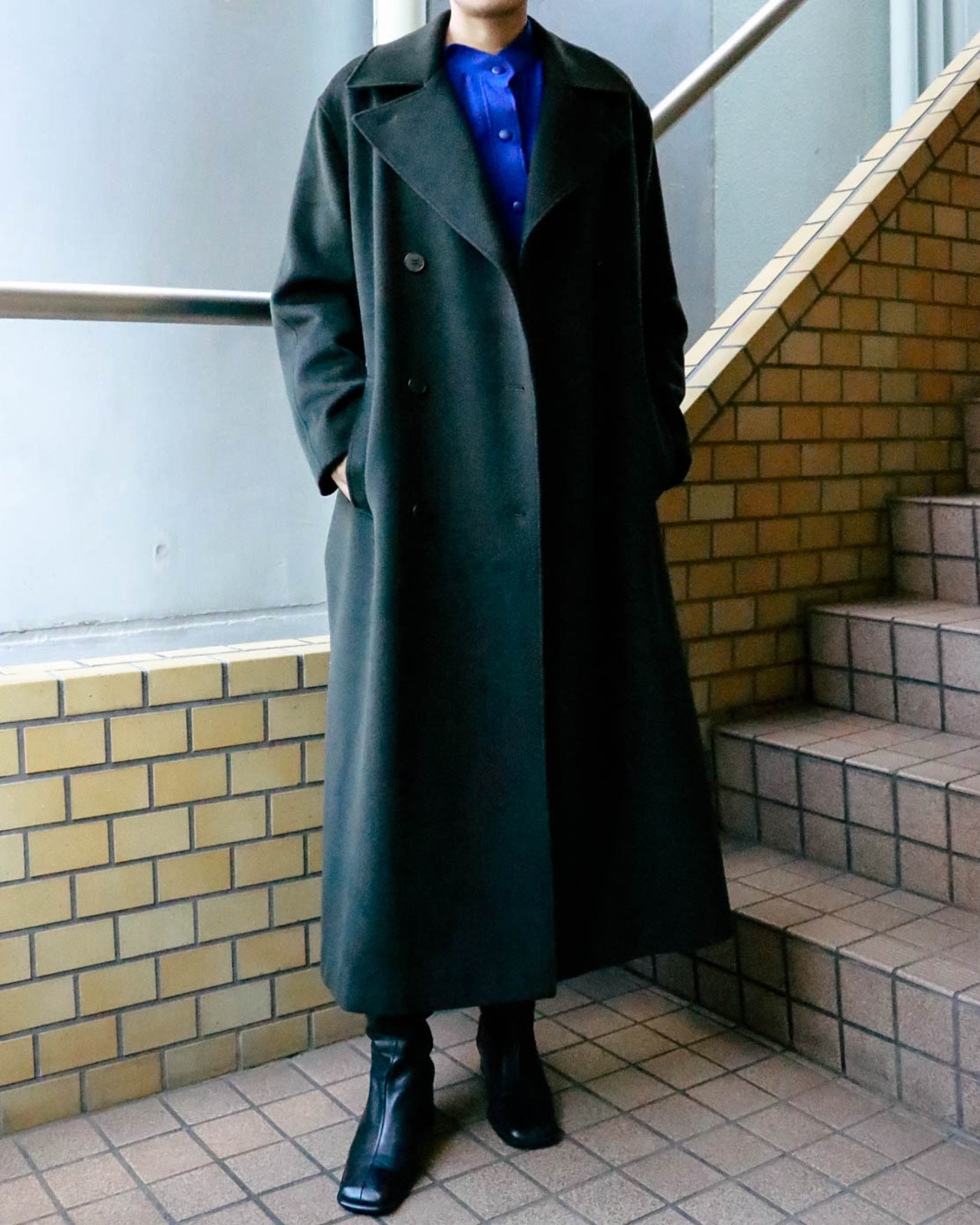 ボリューム感のあるゆったりとしたシルエットでしっかりと長さのあるロングコートは、どんなコーディネートにも合わせやすい。深みのあるカーキがぐっとオシャレ度をあげてくれます。