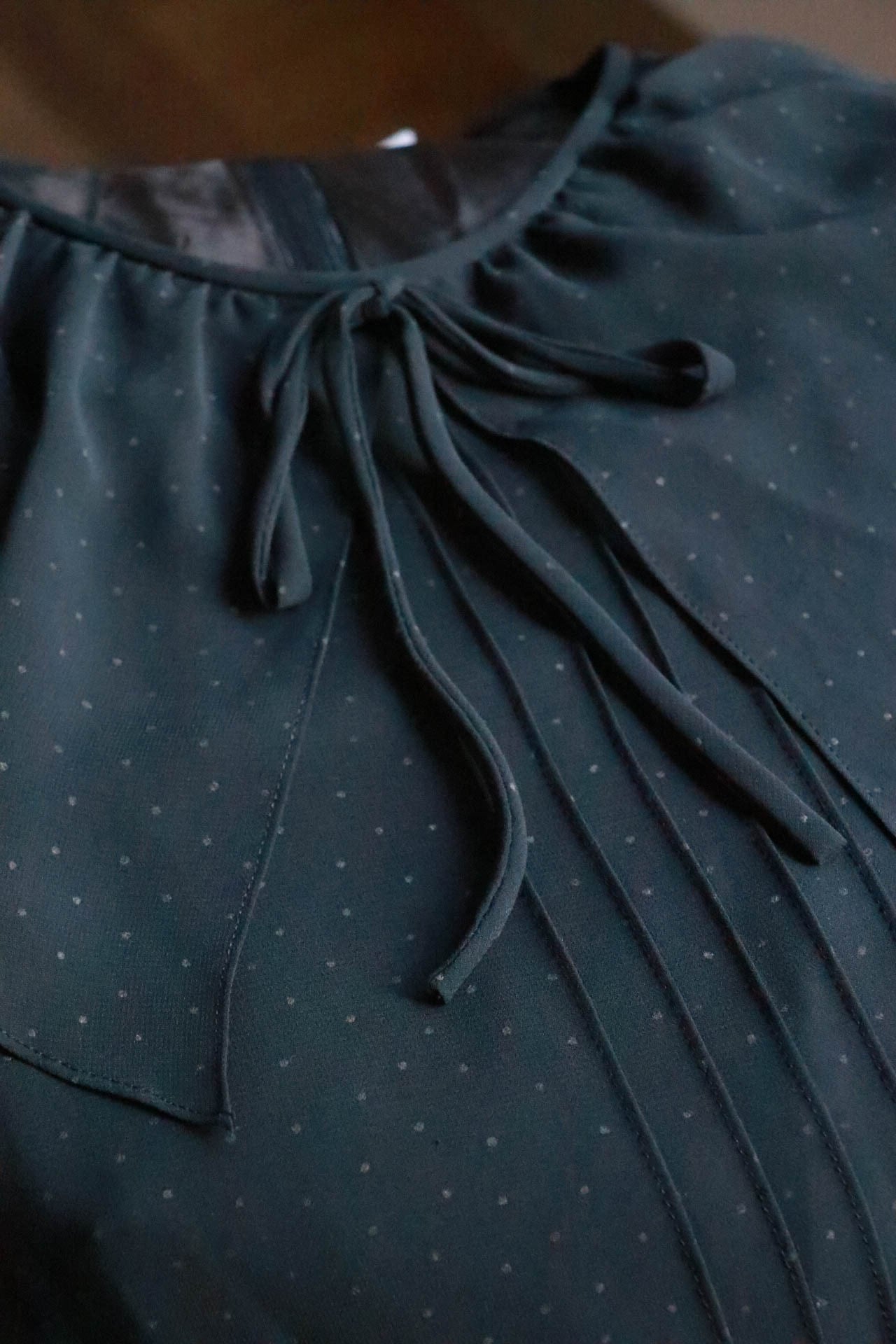 首元のディテールが女性らしく、袖部分はシアーな素材で軽やかな気品をプラス。