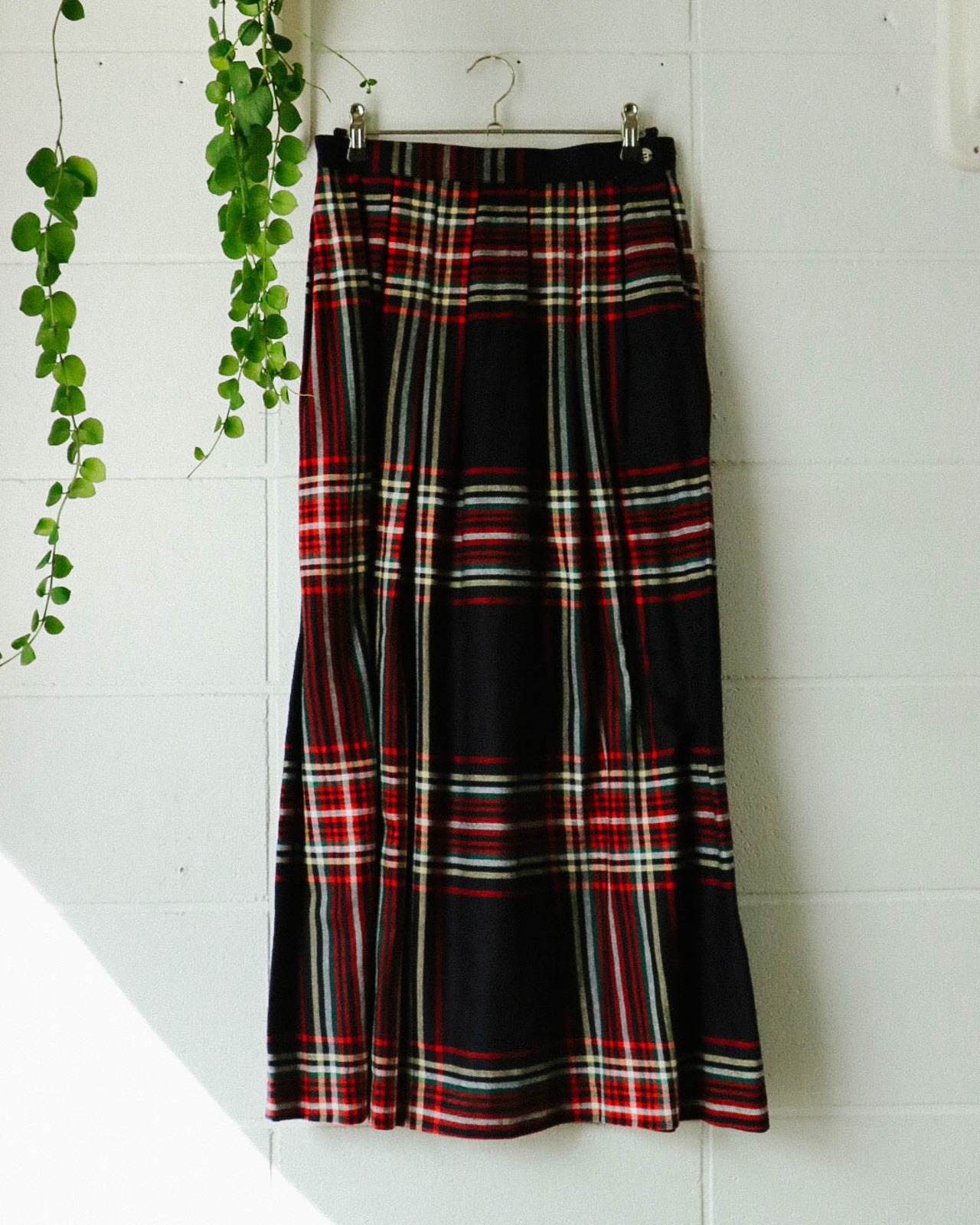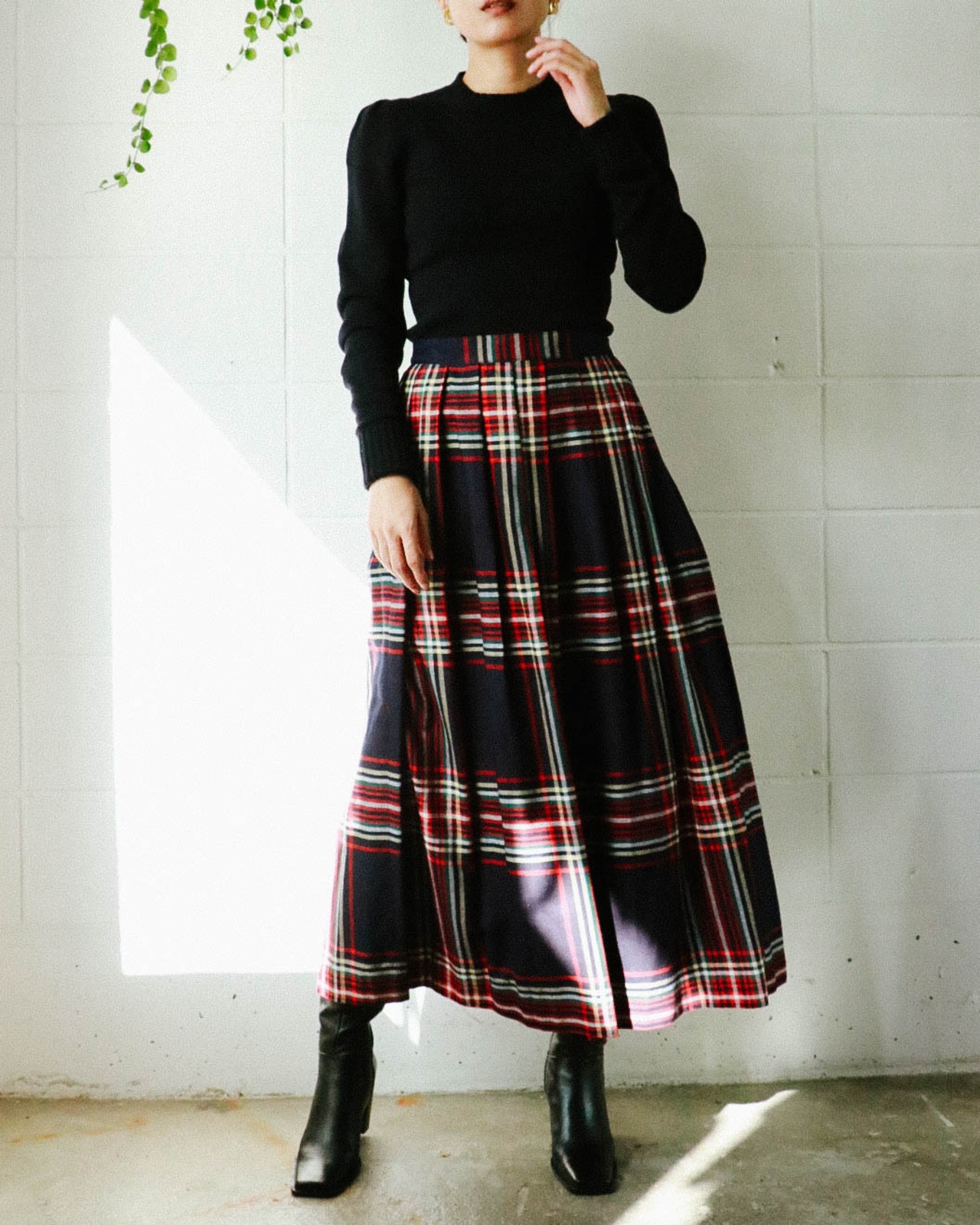 ヴィンテージならではのレトロなチェックと色合いに心惹かれるロングプリーツ スカートが入荷。写真のように同系色のトップスを合わせて、スカートを主役にしたコーディネートを一年中楽しめます。しっかりとした素材ですが、ライナーが付いていないので、真冬はストッキングとブーツを合わせたコーデがおすすめです。