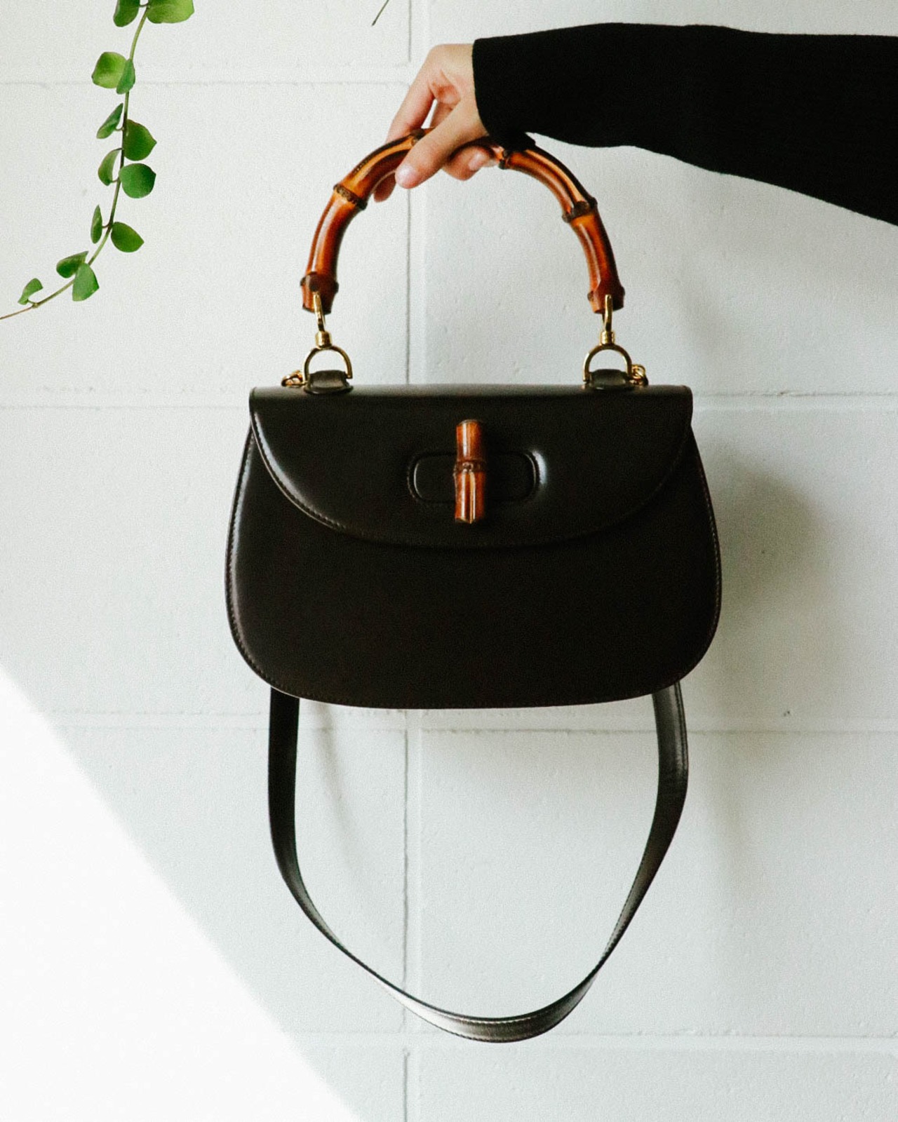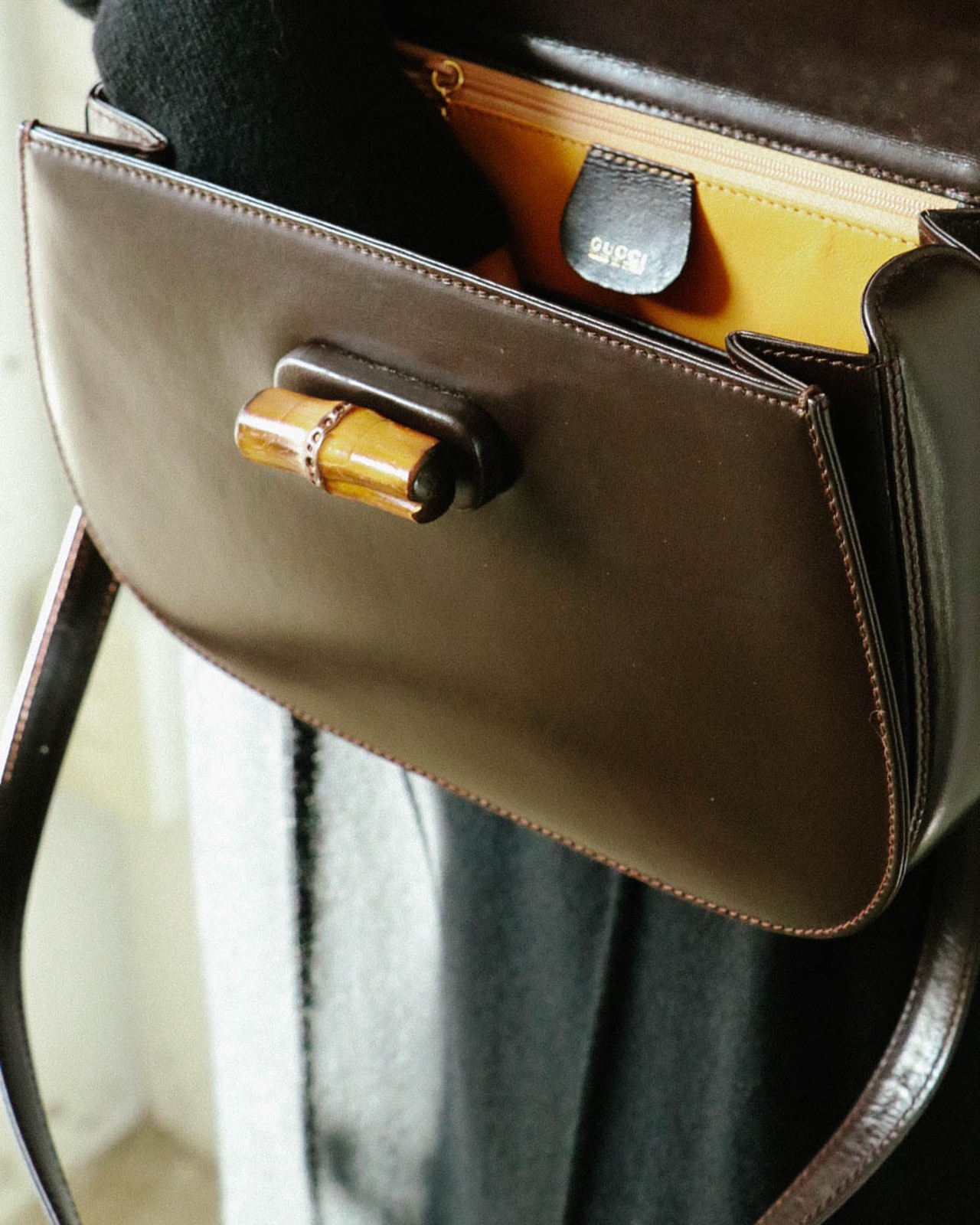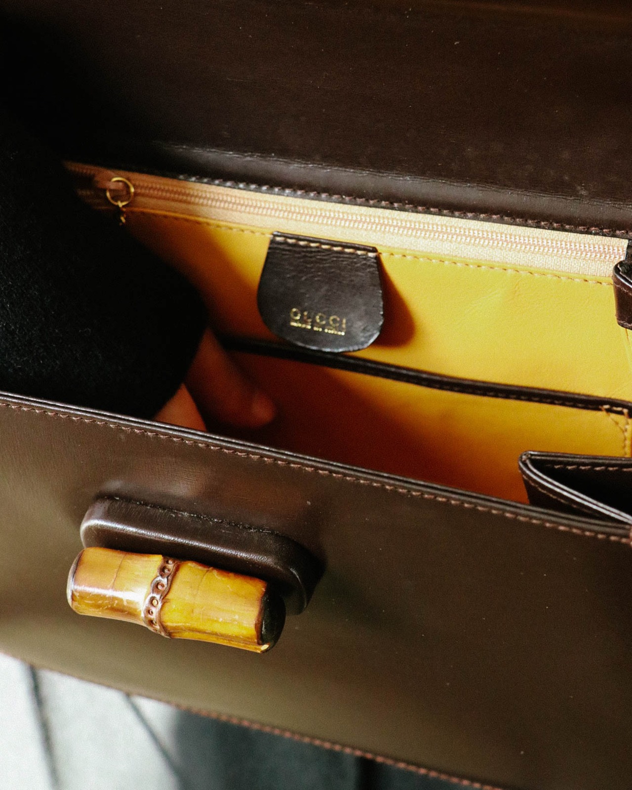 シンプルながら王道のバンブーがアクセントになったシックなデザイン。外側はダークブラウン、インサイドはベージュの組み合わせがとっても上品。全体的にコンディションもとっても綺麗。オールラウンダーで永年つかえる優良なバッグです。