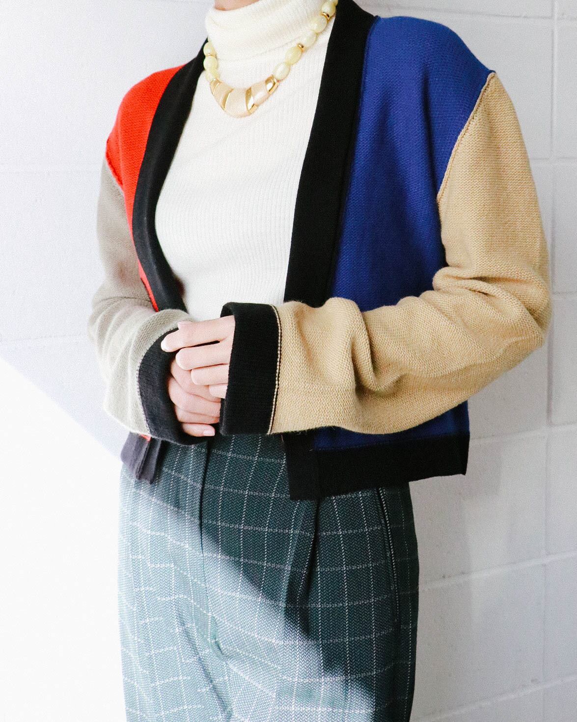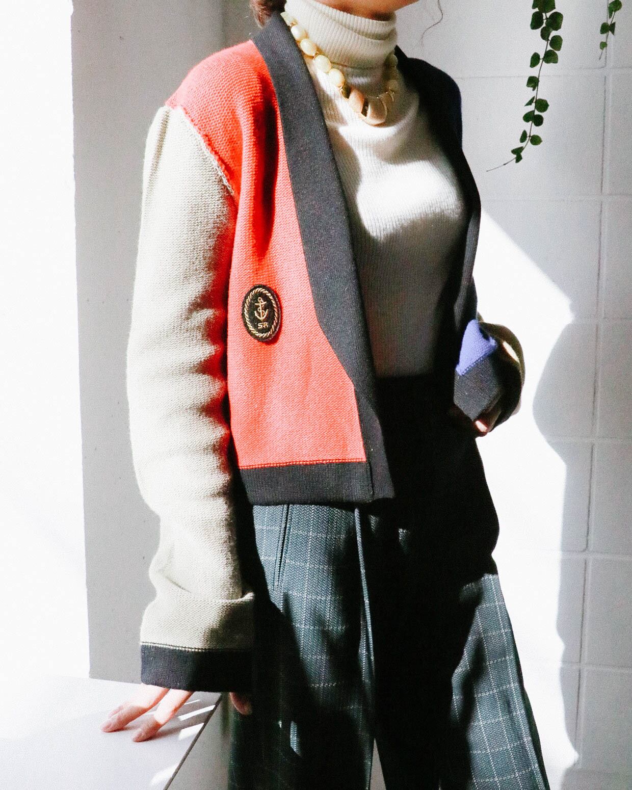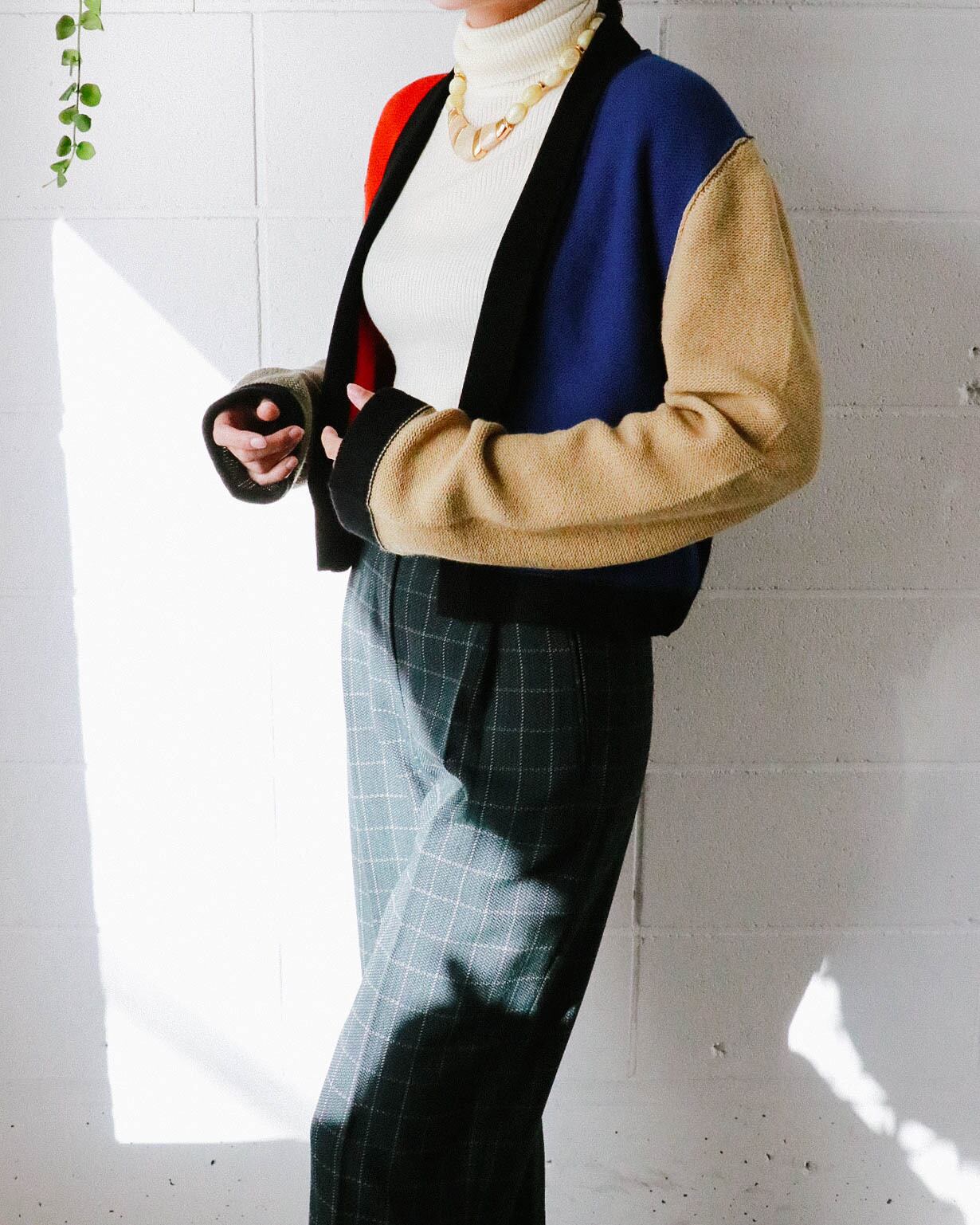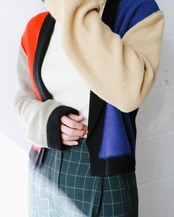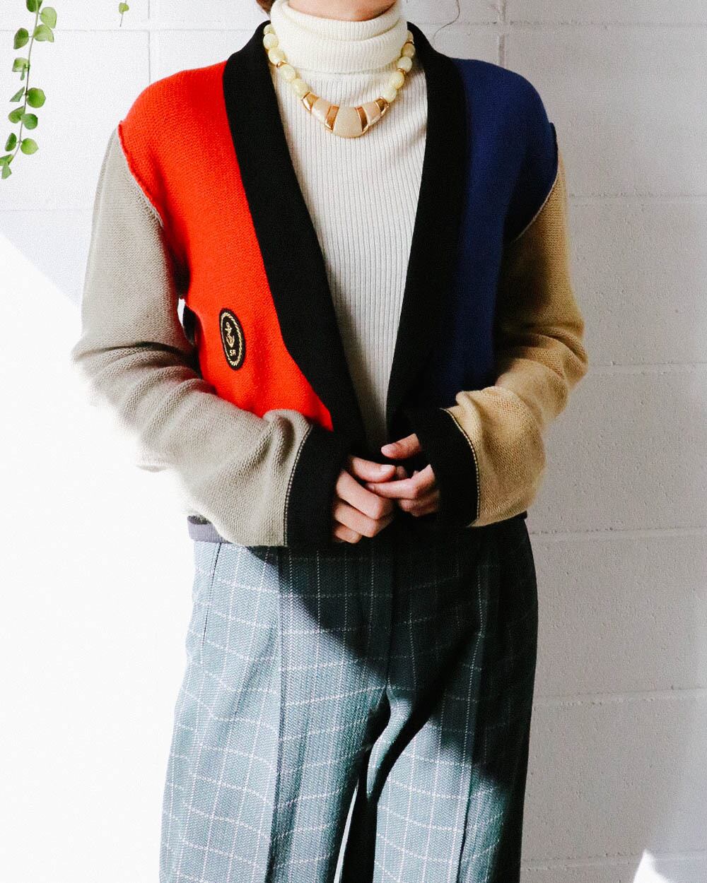 モンドリアンデザインのようなカラーブロックがかわいいニットカーディガン。