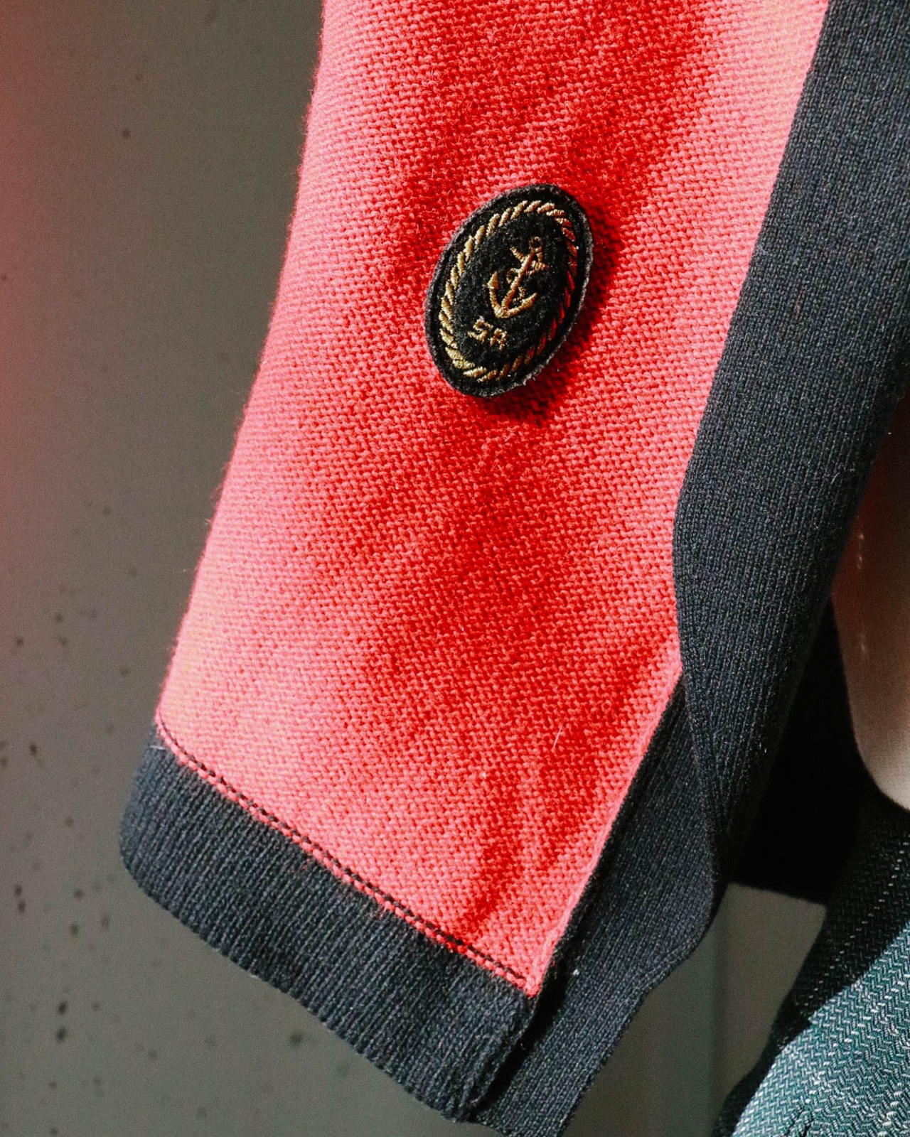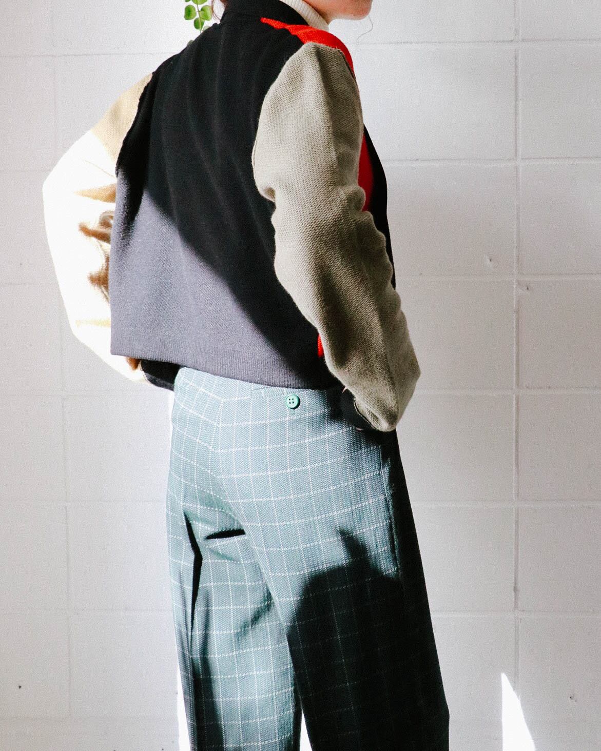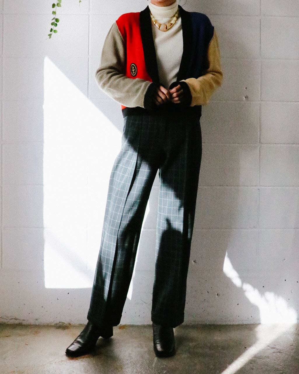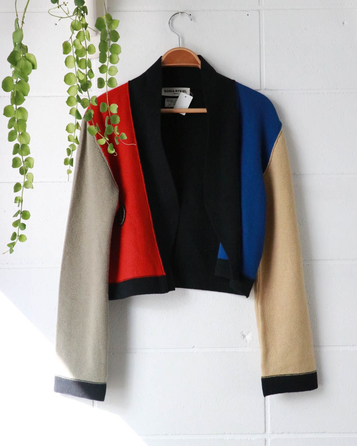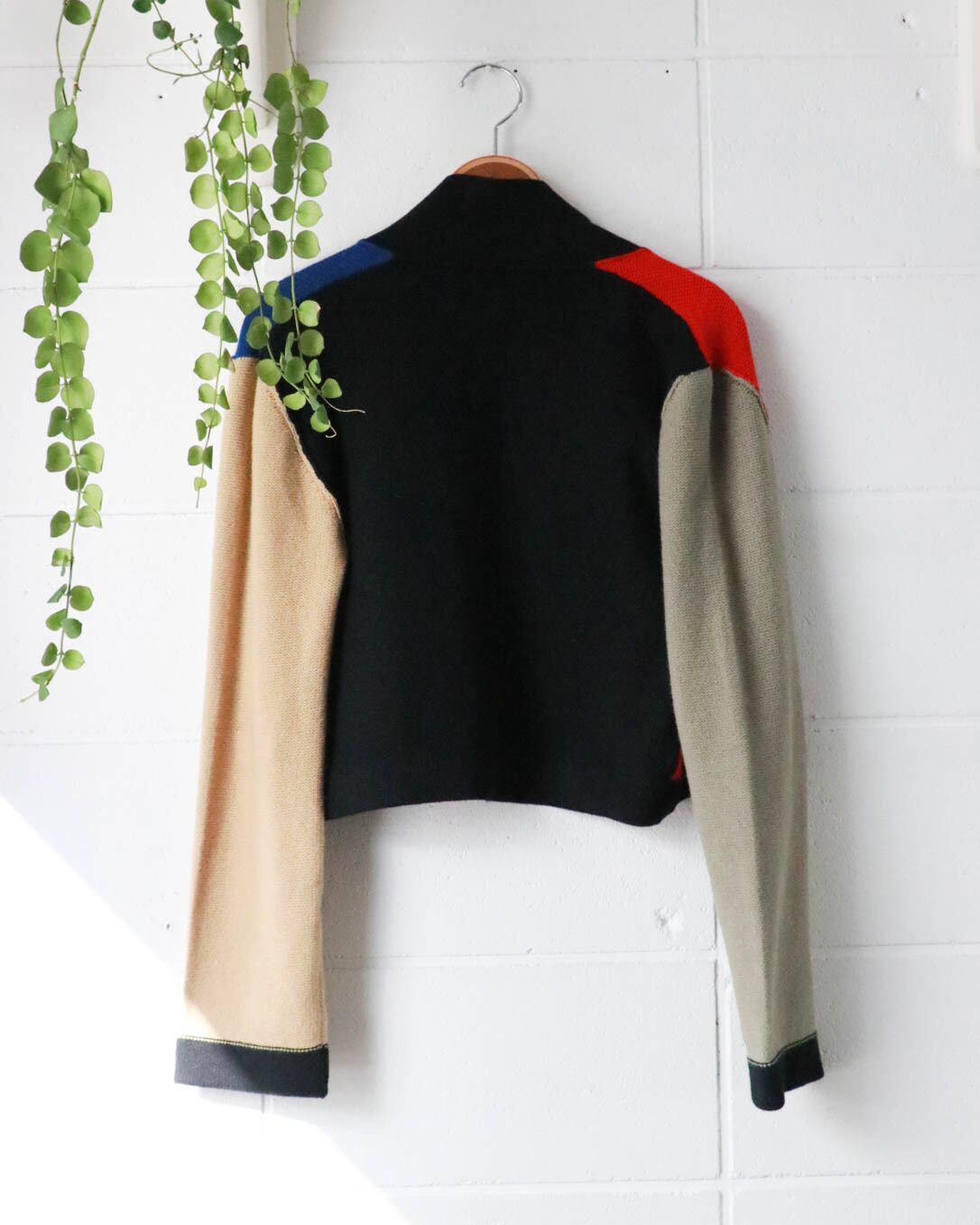 モンドリアンデザインのようなカラーブロックがかわいいニットカーディガン。