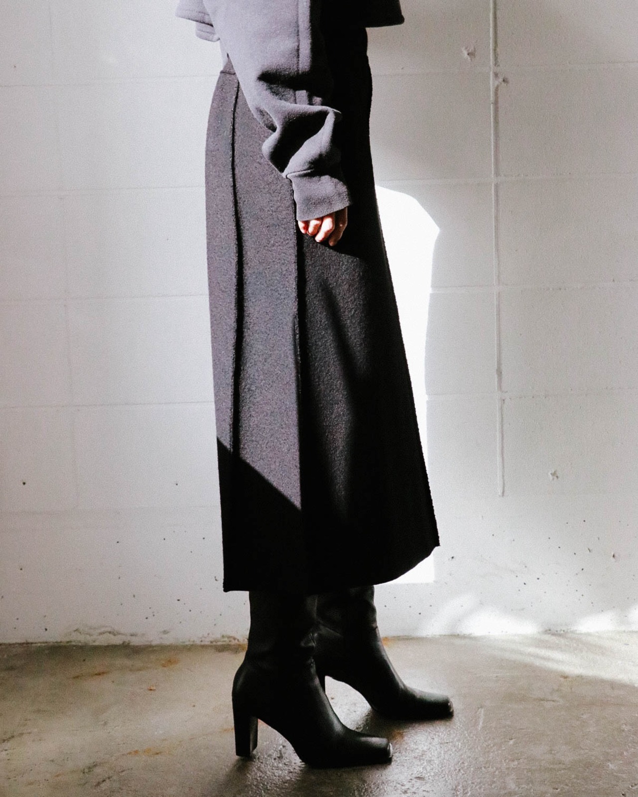 中厚手のウールだからこその形の美しさ、絶妙なAラインシルエットとあえて縫い目を表に出したデザインはシンプルに見えてしっかりとディテールに個性を感じる。