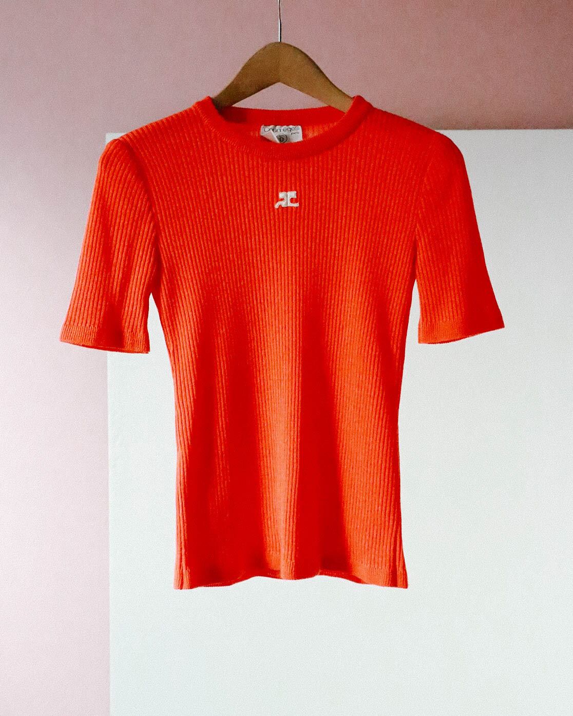 鮮やかなオレンジ色が目を引くクレージュニットが入荷。