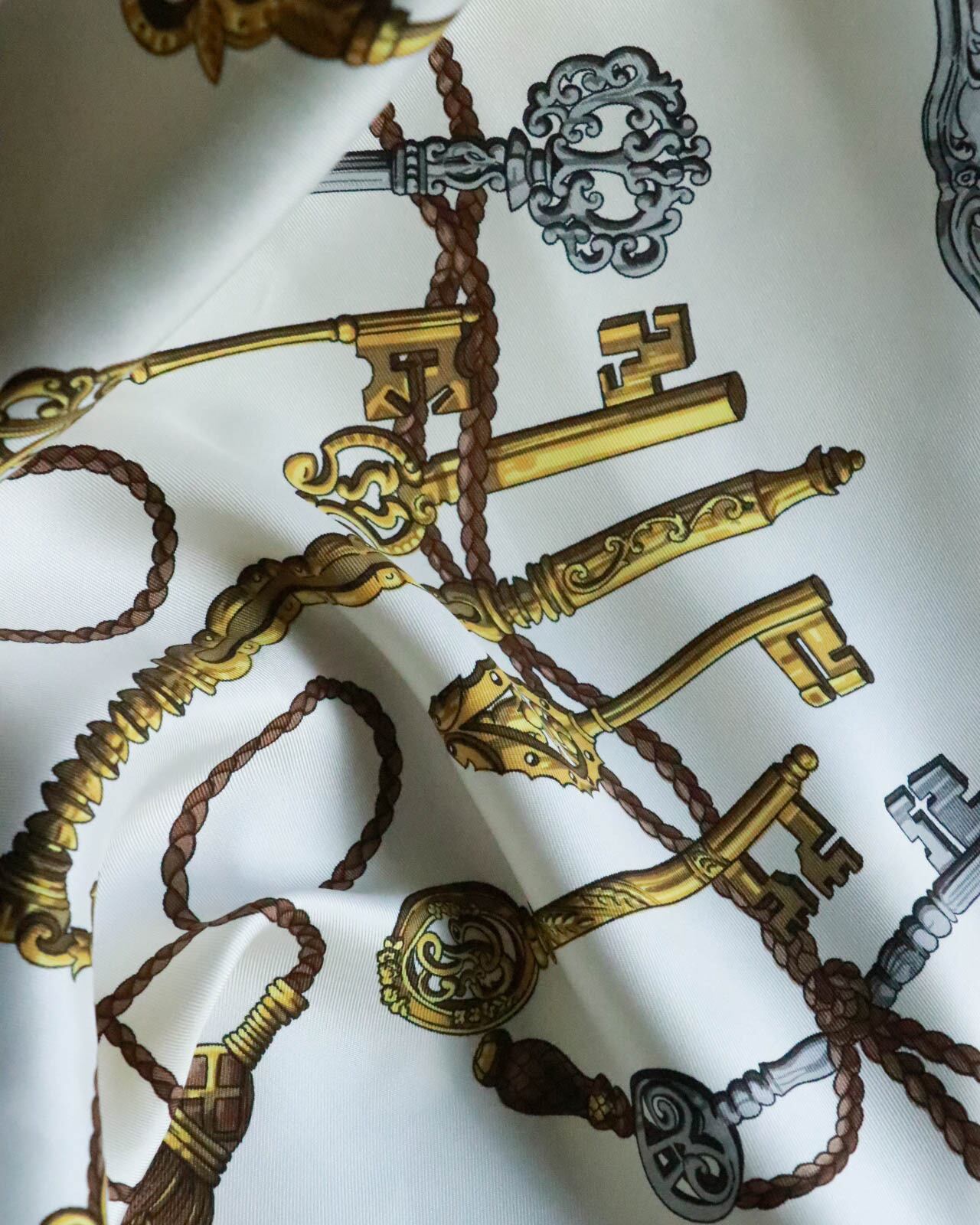 こちらは、鍵柄デザイン。白x茶ベースで服馴染みがいいスカーフです。