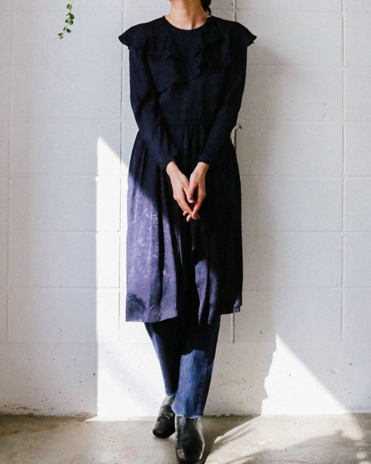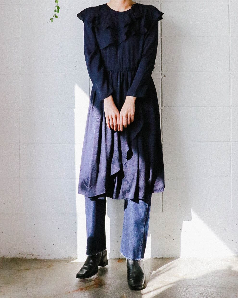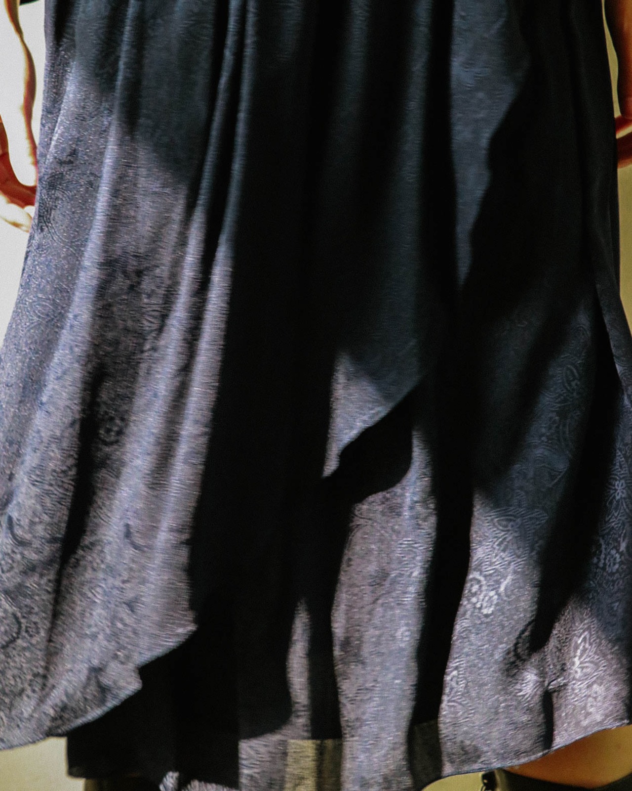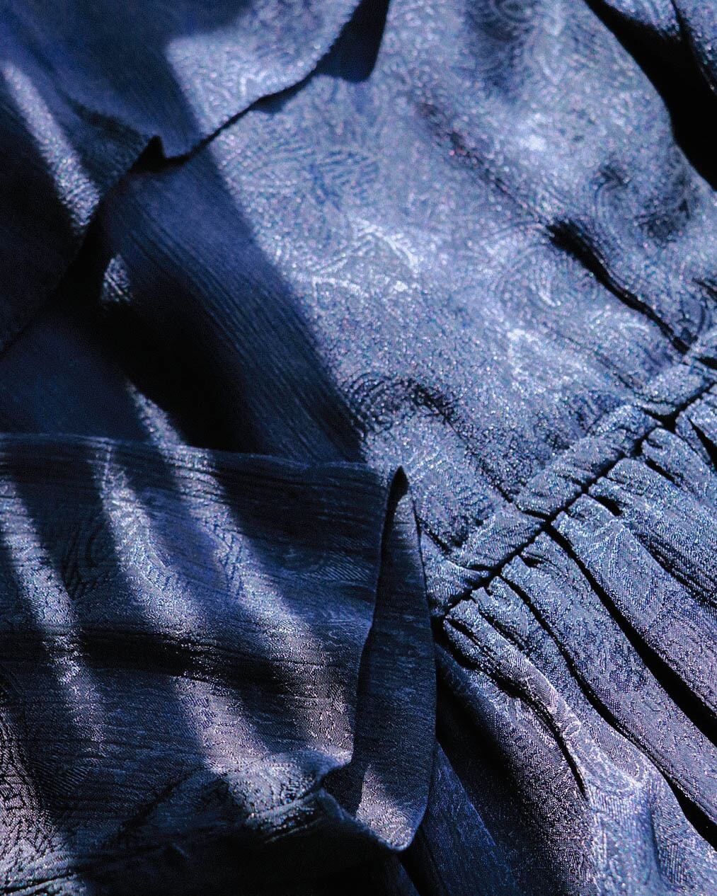 ランダムに構成されたティアードとうっすらプリントされたペイズリーが浮き上がるデザインです。ほんのり光沢感がありドレッシーな表情も添えます。あえて、デニムなどをレイヤードしてカジュアルダウンするのもオススメです。残り香を感じさせるようなそんなドレスです。