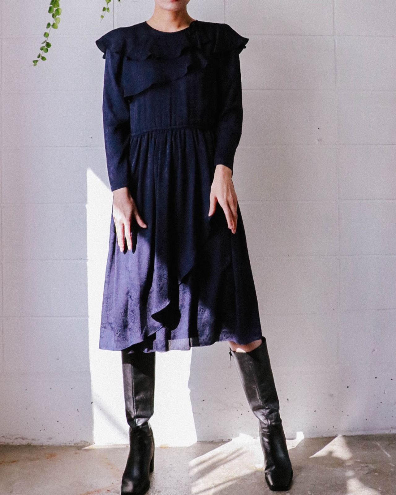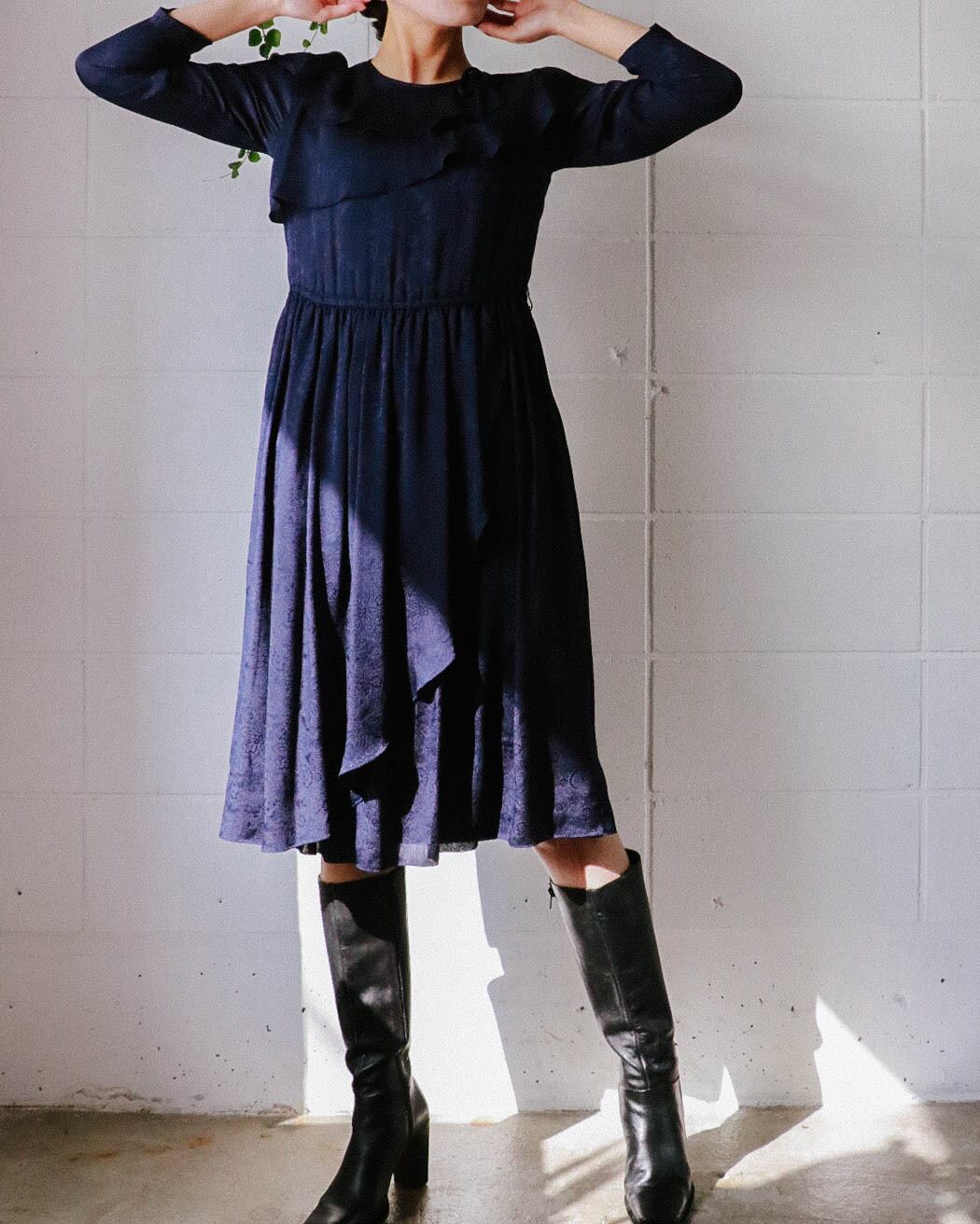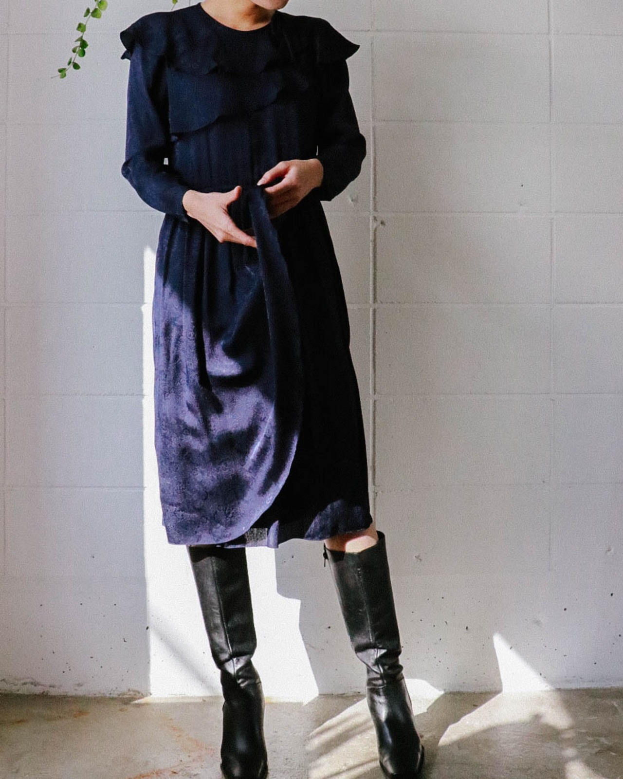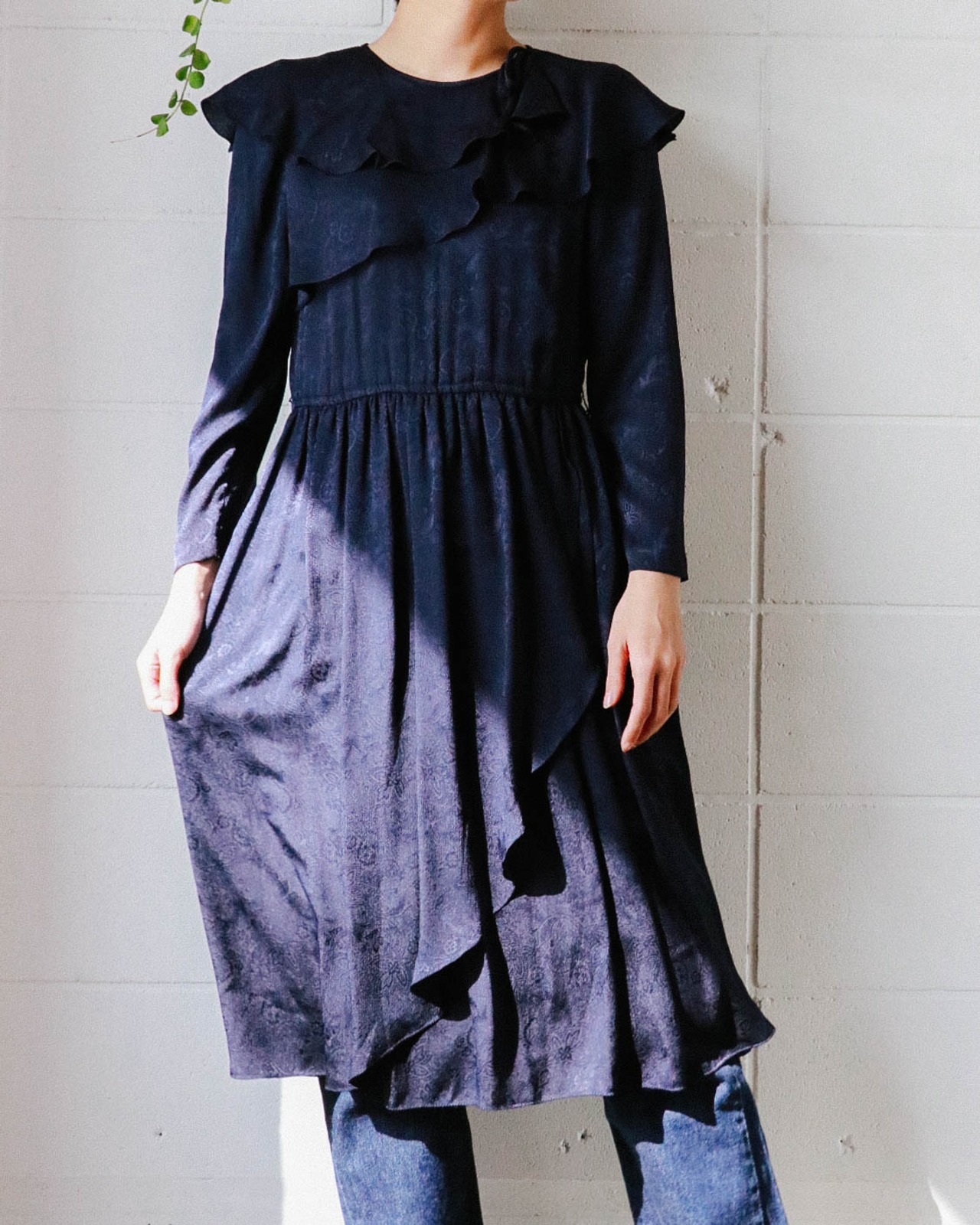 ランダムに構成されたティアードとうっすらプリントされたペイズリーが浮き上がるデザインです。ほんのり光沢感がありドレッシーな表情も添えます。あえて、デニムなどをレイヤードしてカジュアルダウンするのもオススメです。残り香を感じさせるようなそんなドレスです。