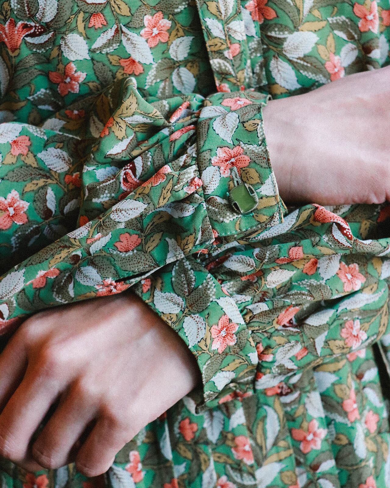 70年代の小花柄ワンピースはうぐいす色のベースカラーとピンク色の花模様が、春の訪れを感じさせます。背中のシャーリングや小ぶりのボウタイがフェミにティな雰囲気を醸し出す。