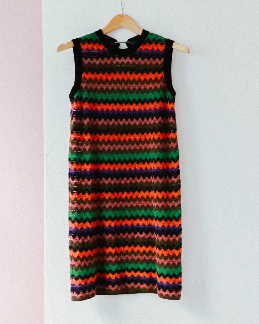 マルチカラーのとっても可愛いドレスはミッソーニのもの。全体的に上品なカラー使いで首元と袖口が詰まったボディー。バックスタイルに拘ったデザインで裏地もしっかりと付いてます。