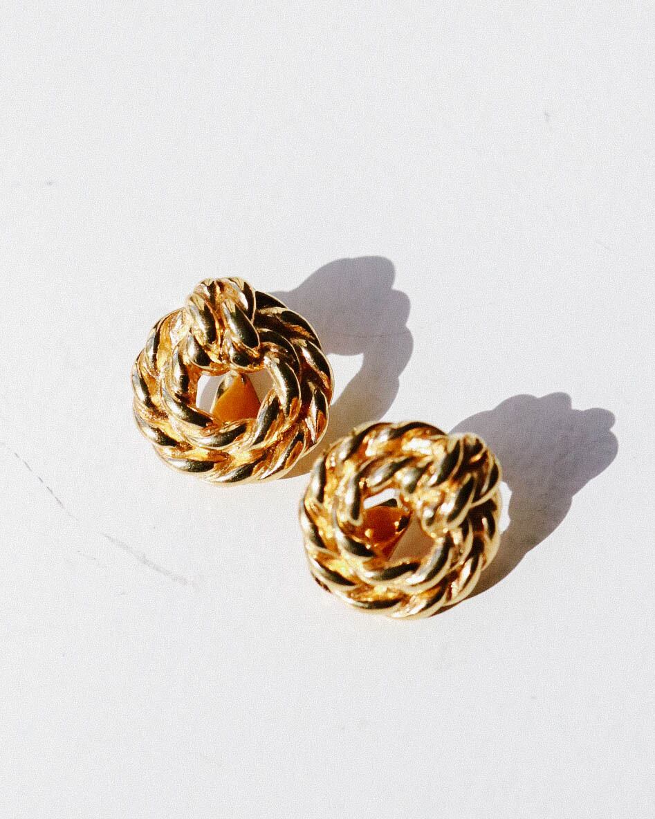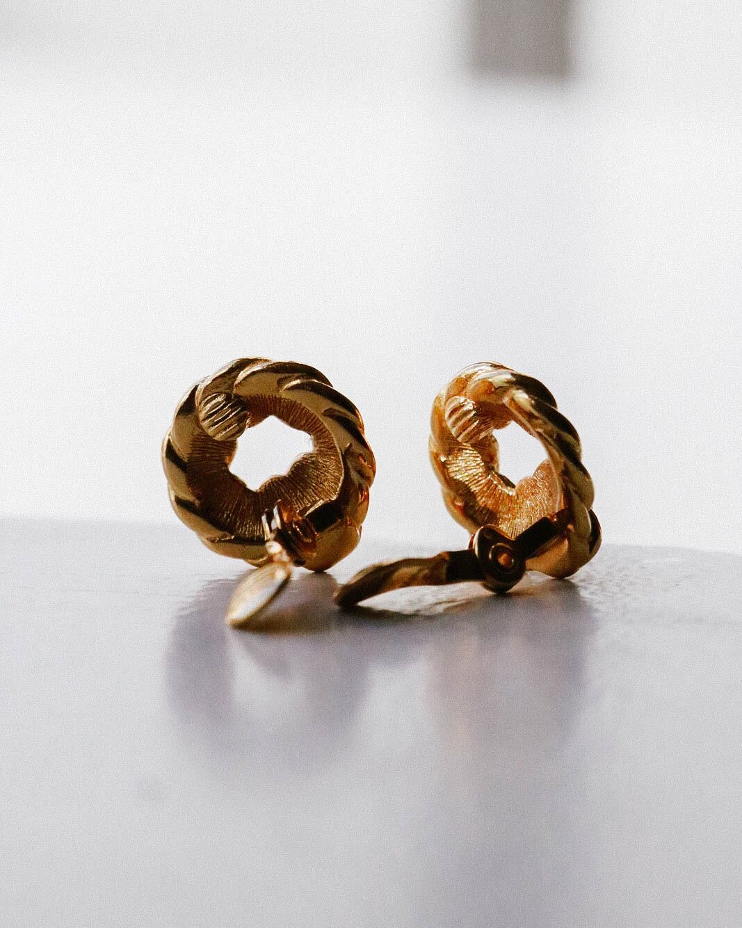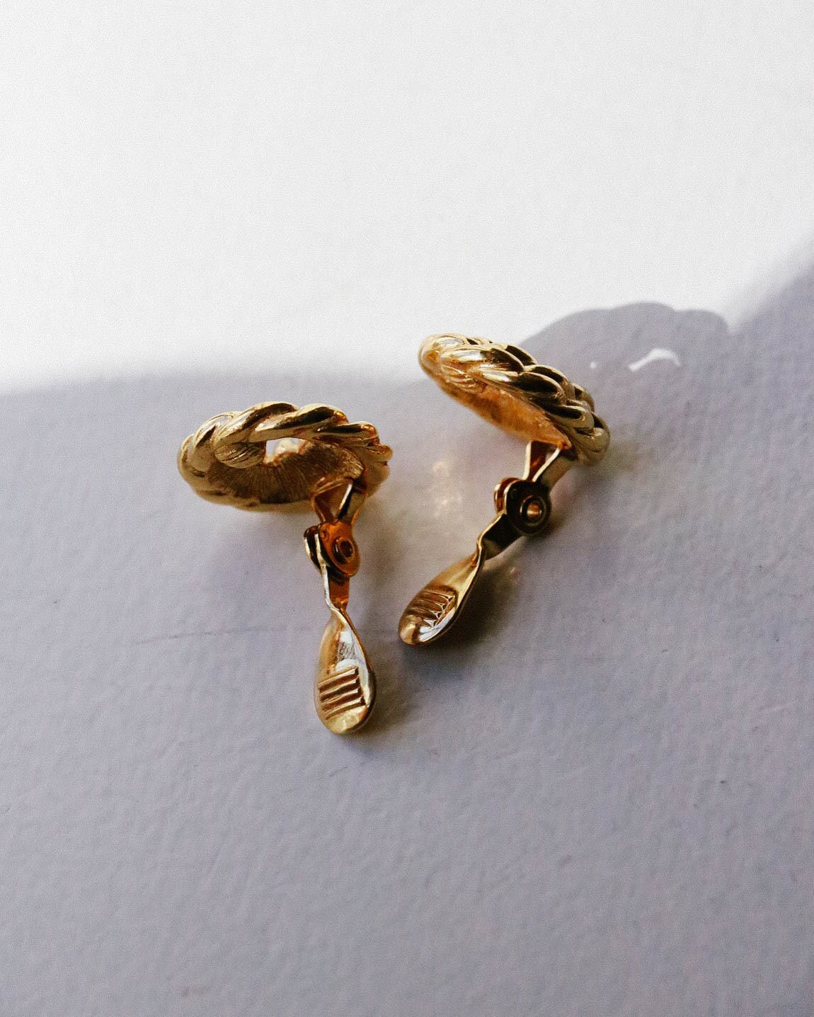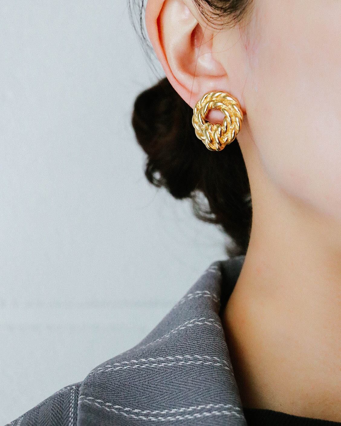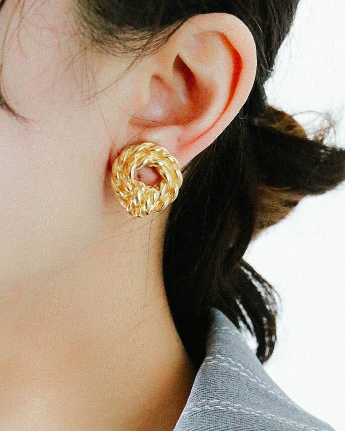 顔周りにモードなエッセンスを添えるゴールドイヤリング。