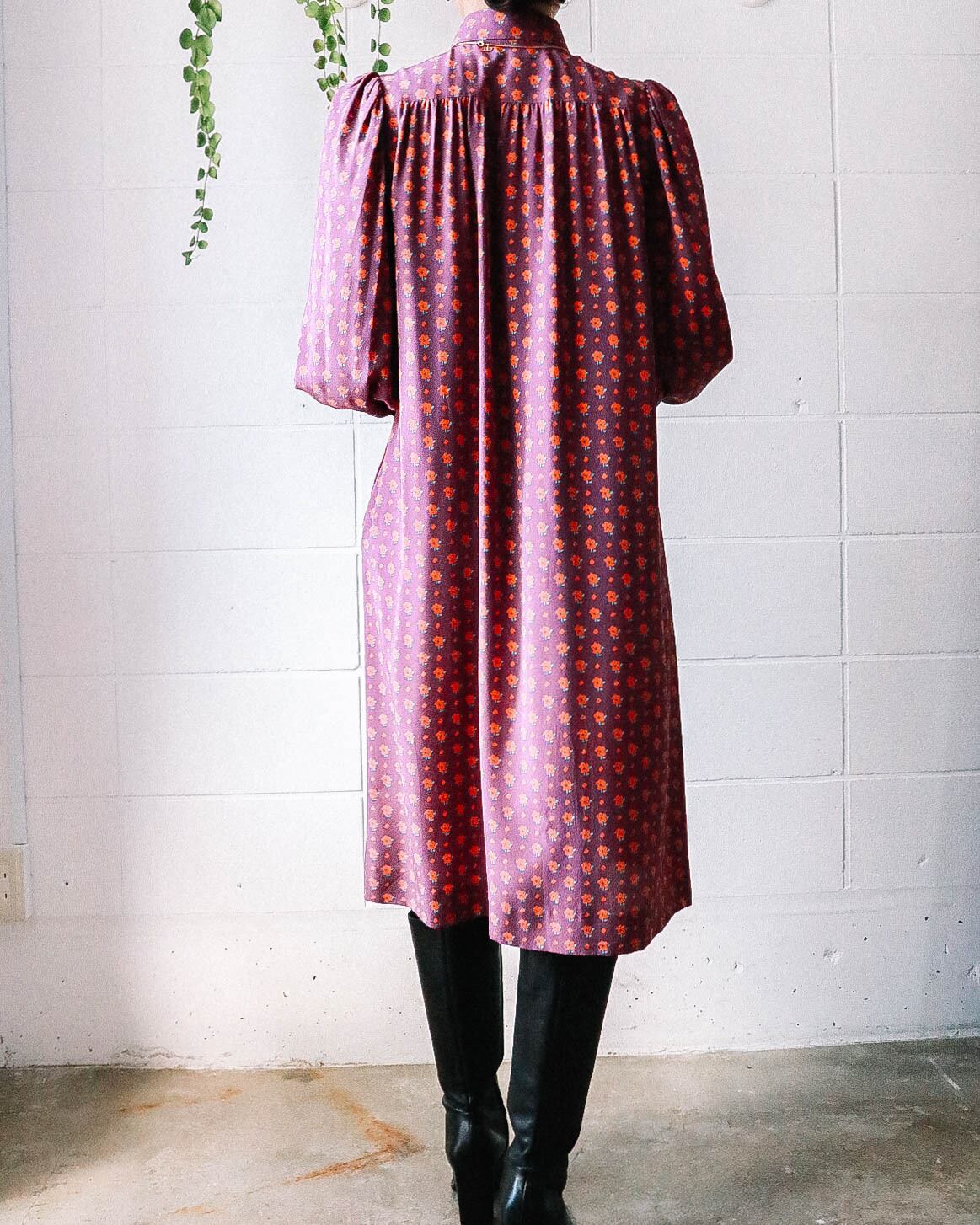 パープル×ピンクの花柄に、ギャザーやパフスリーブが大人フェミニンな印象。
