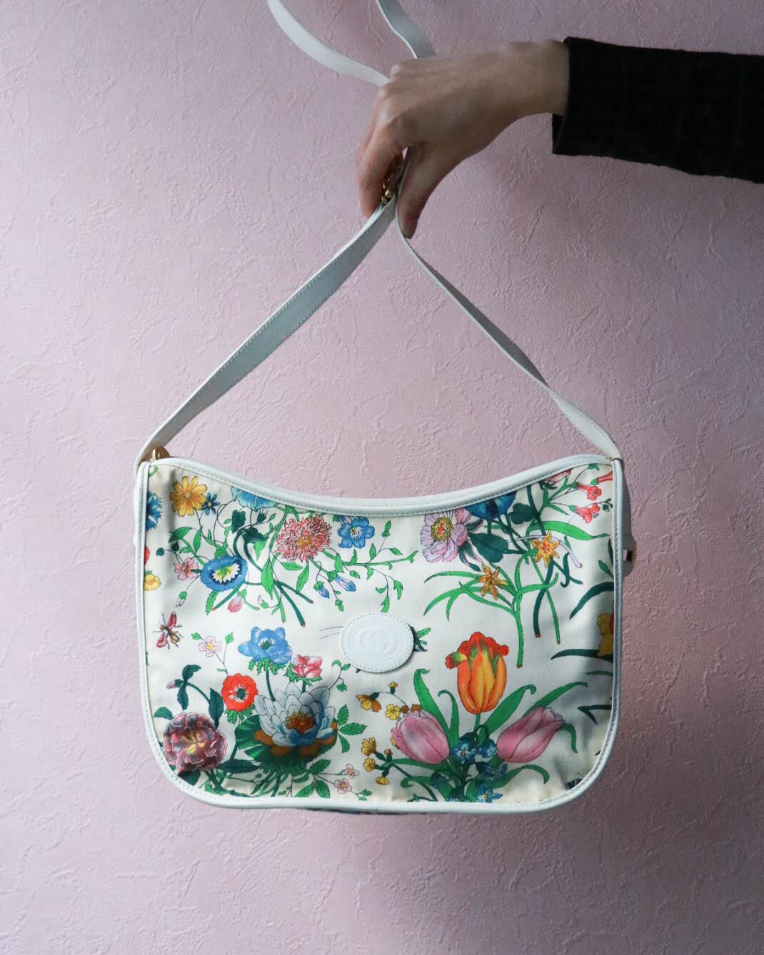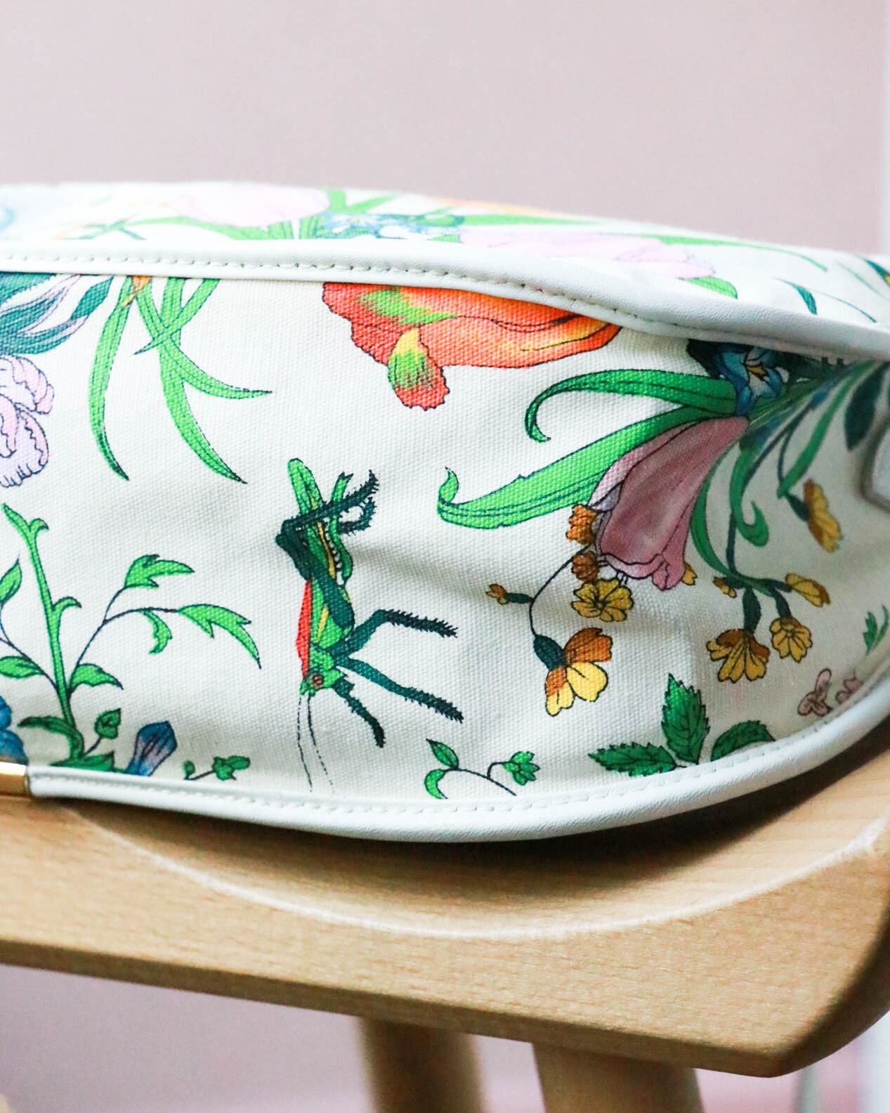 ホワイトレザーパイピングに色彩豊かな花や虫の絵柄は