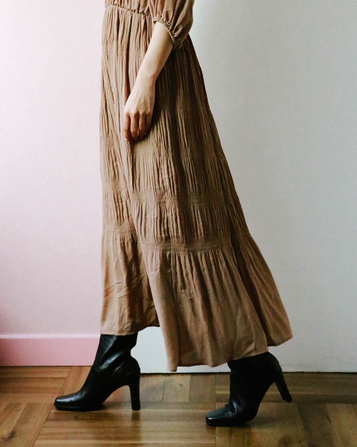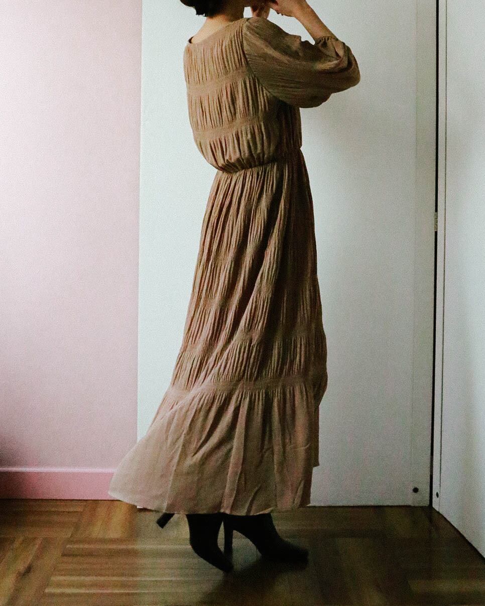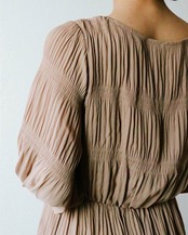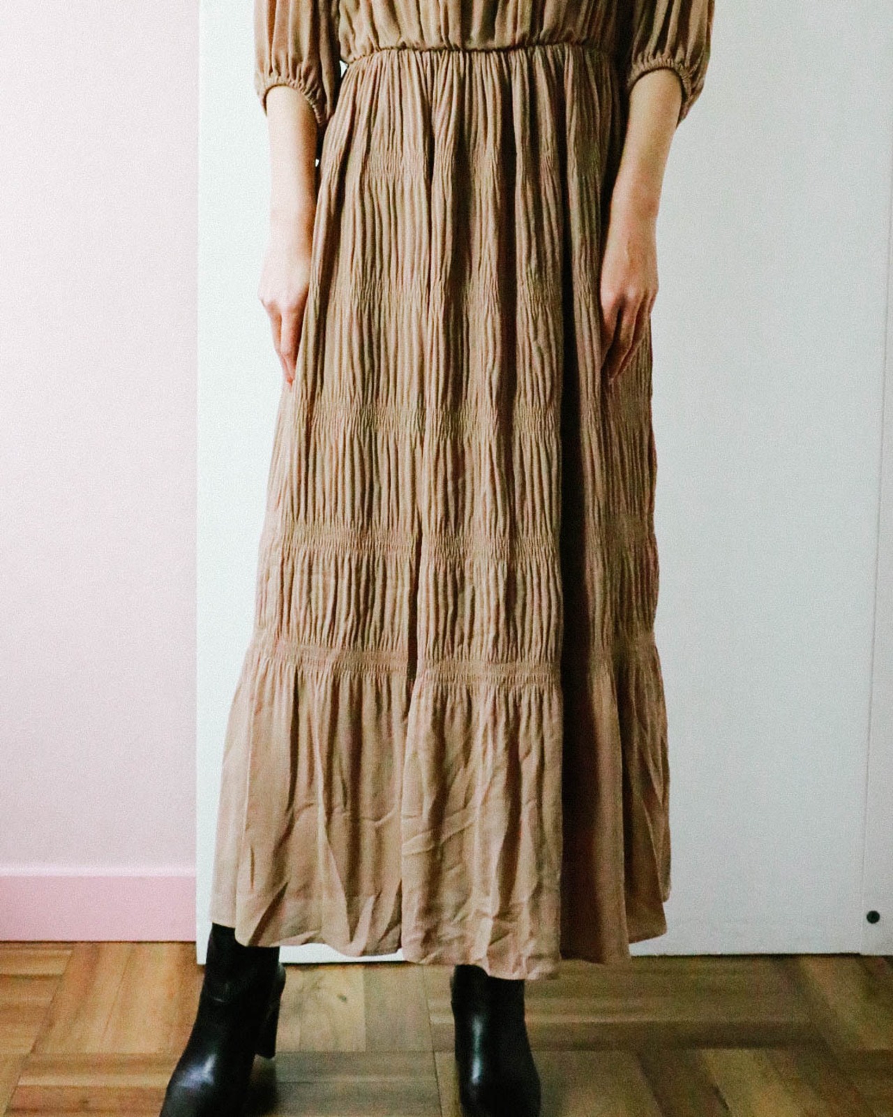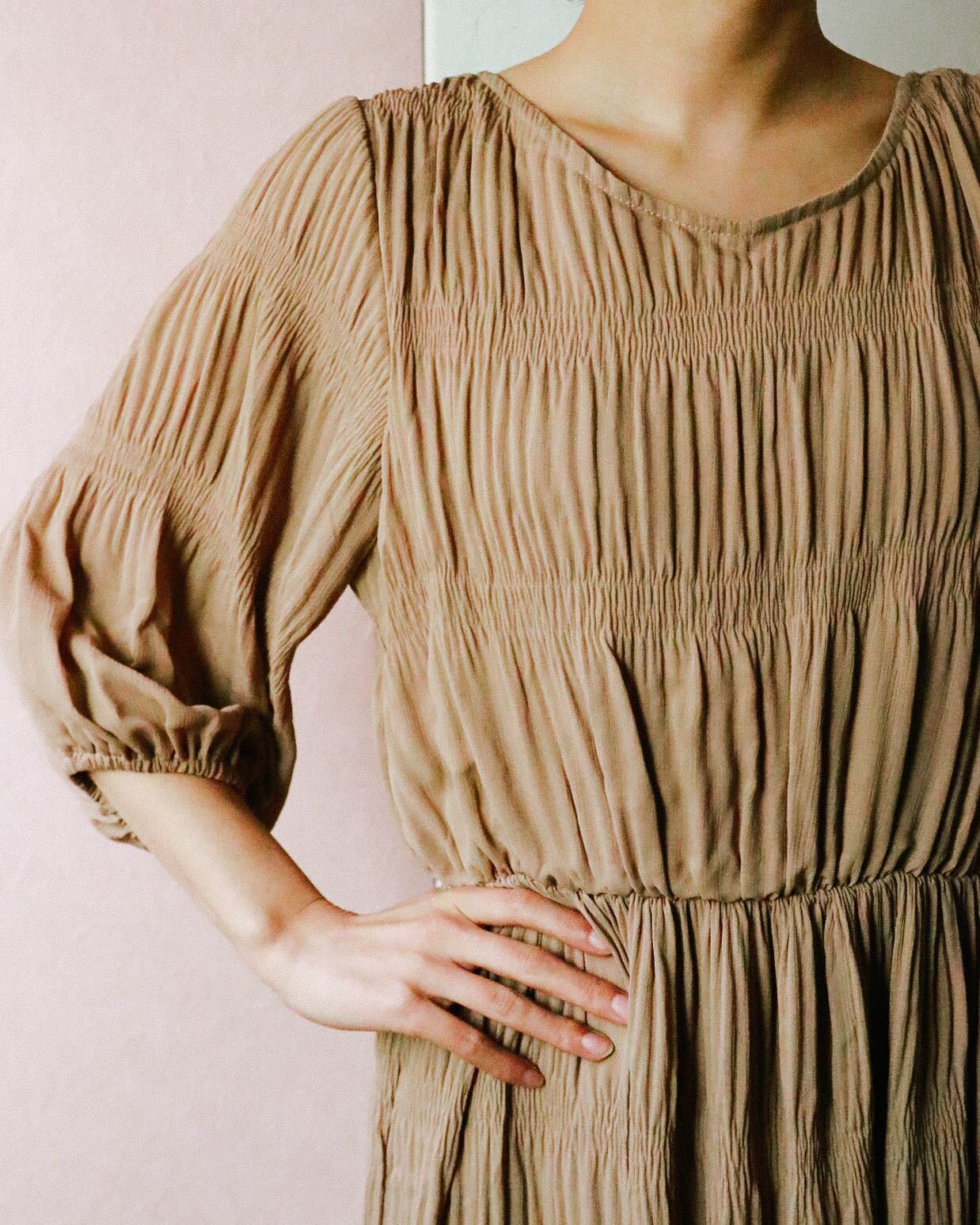ピンクベージュの優しい色味とシャーリングデザインが女性らしい一枚。