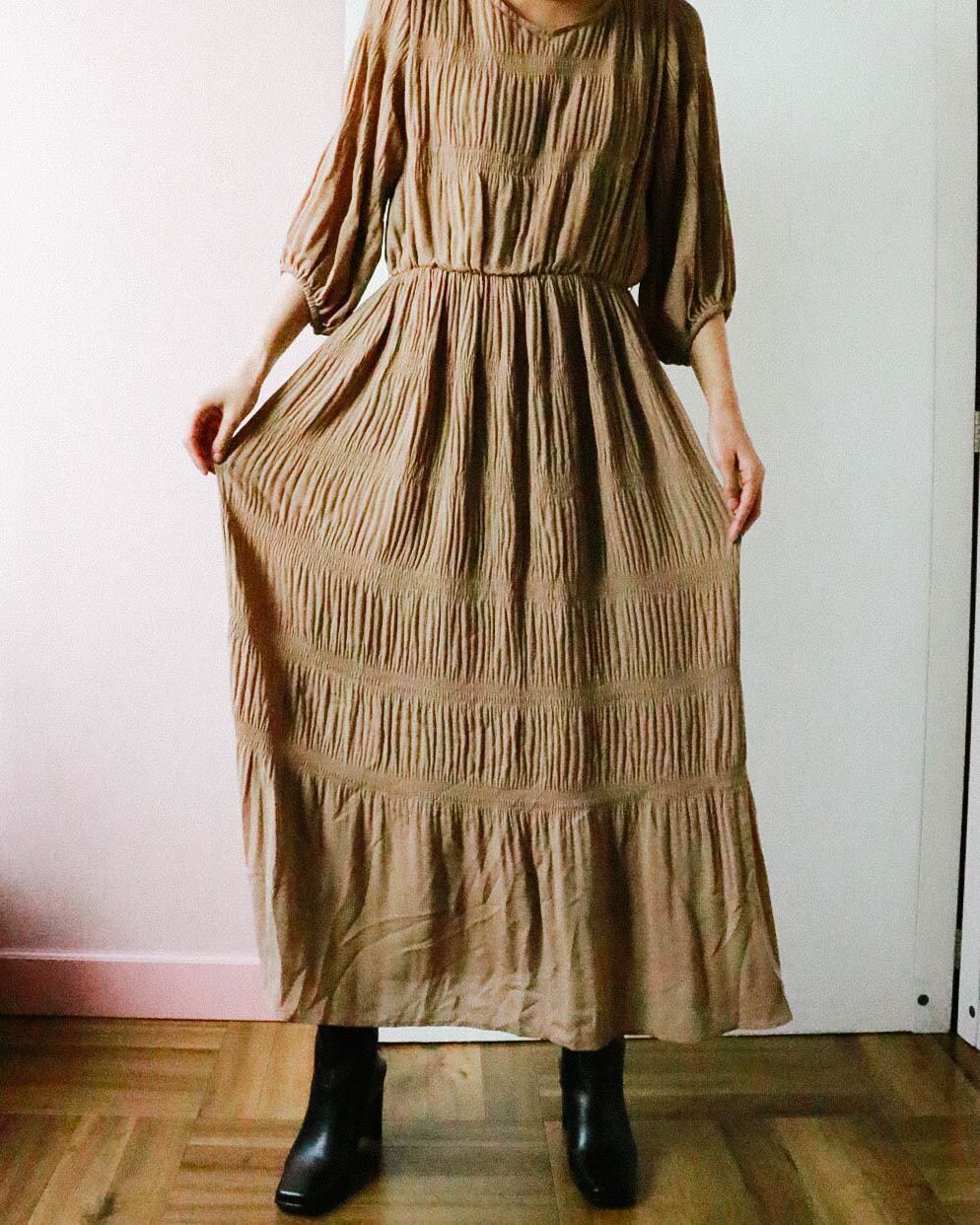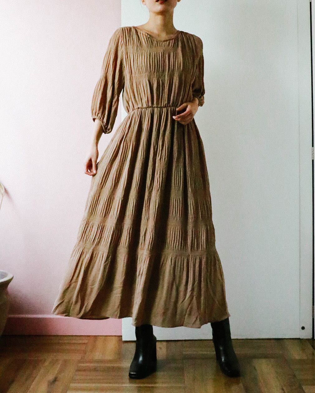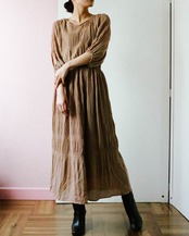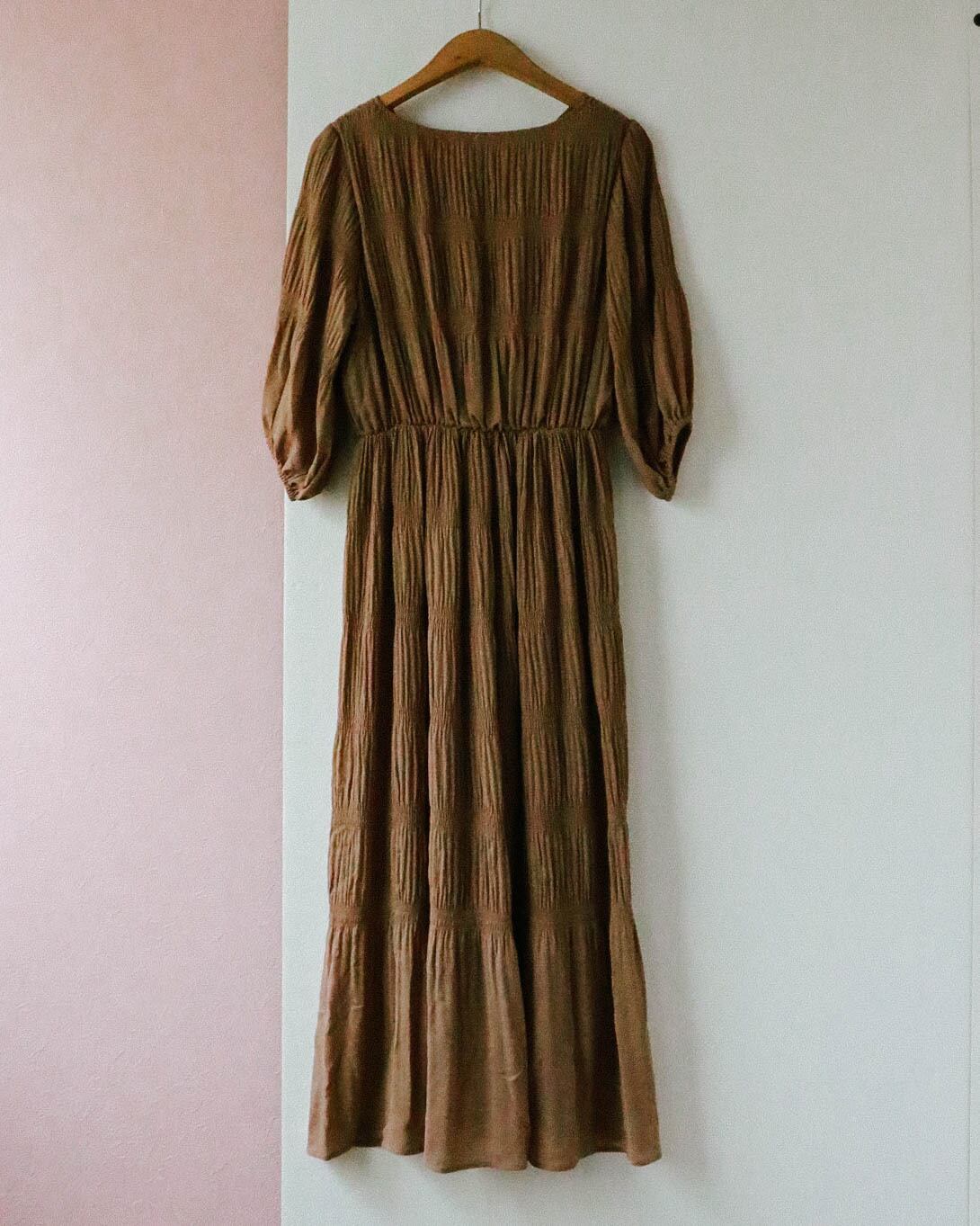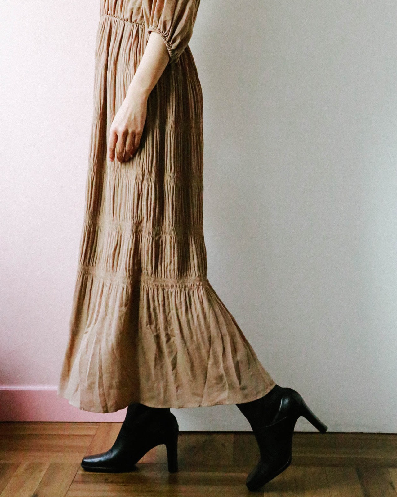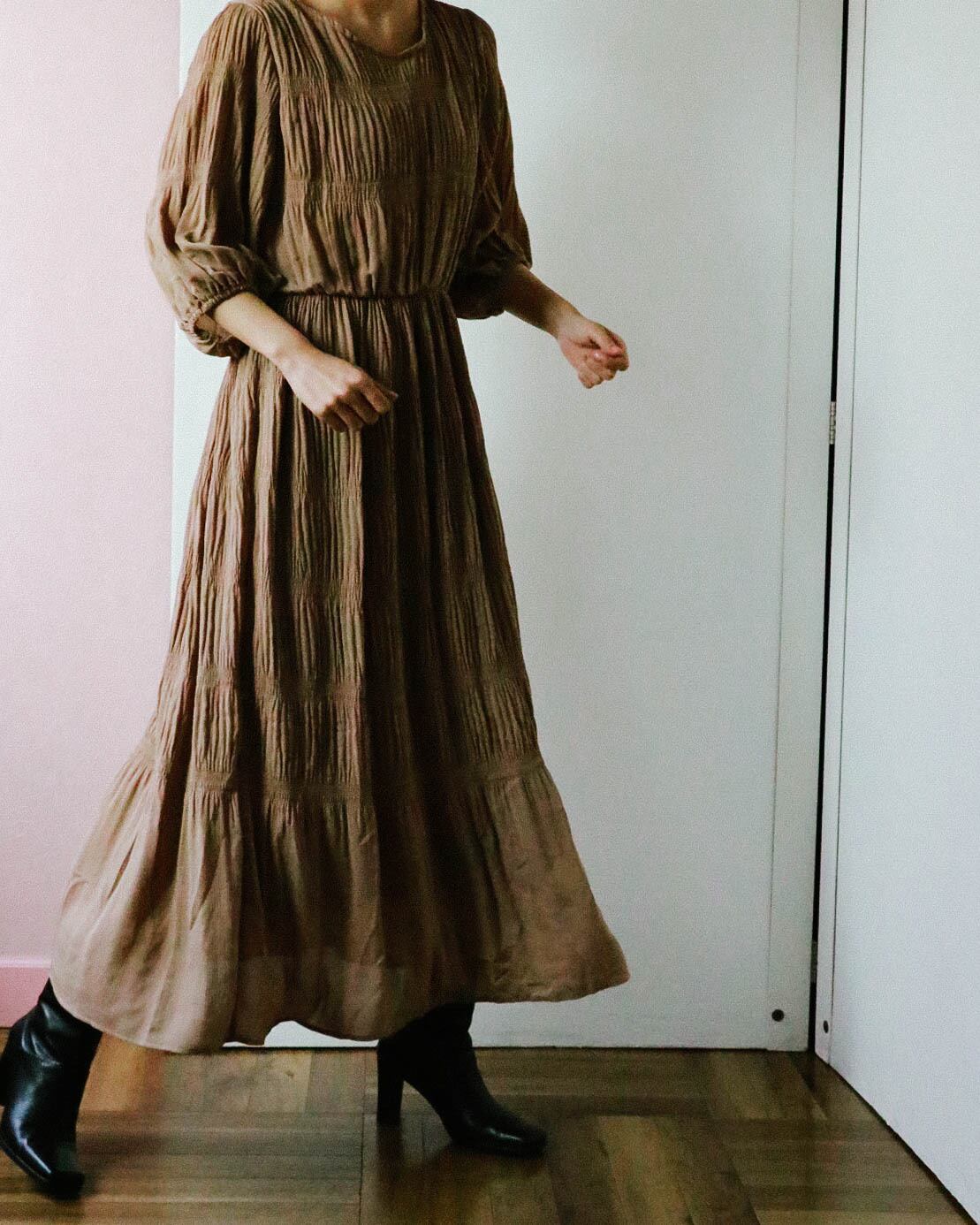 ピンクベージュの優しい色味とシャーリングデザインが女性らしい一枚。