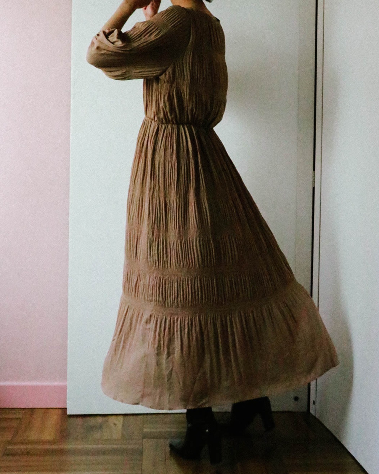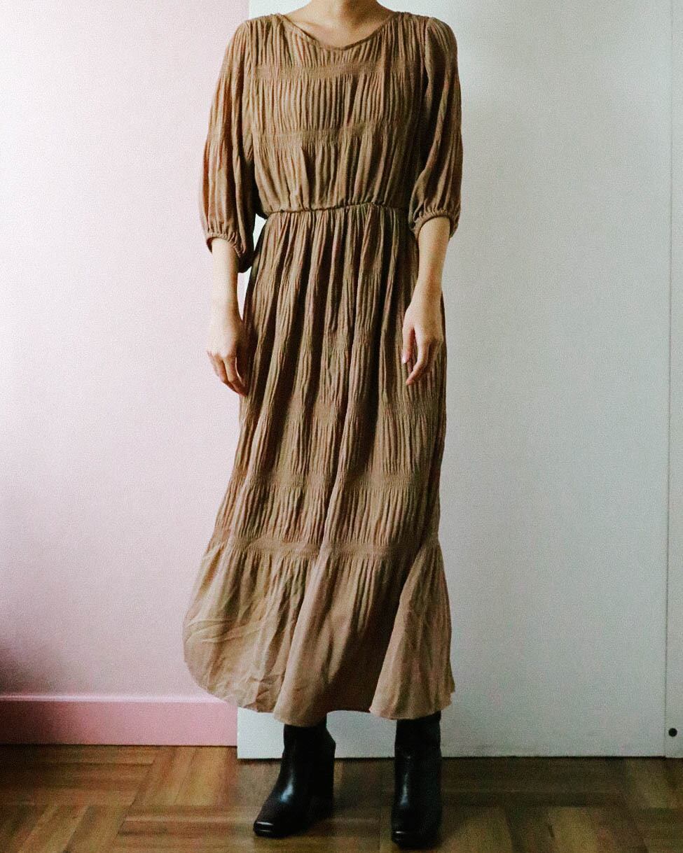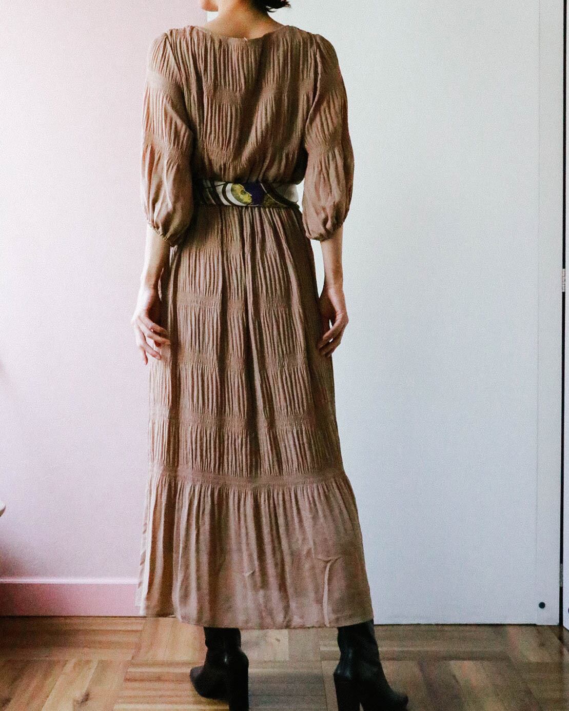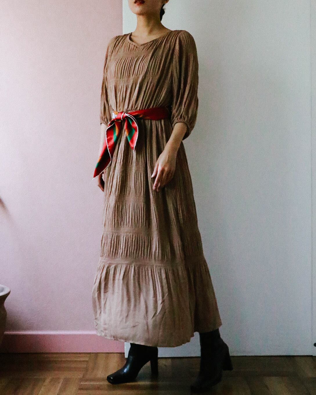 ピンクベージュの優しい色味とシャーリングデザインが女性らしい一枚。