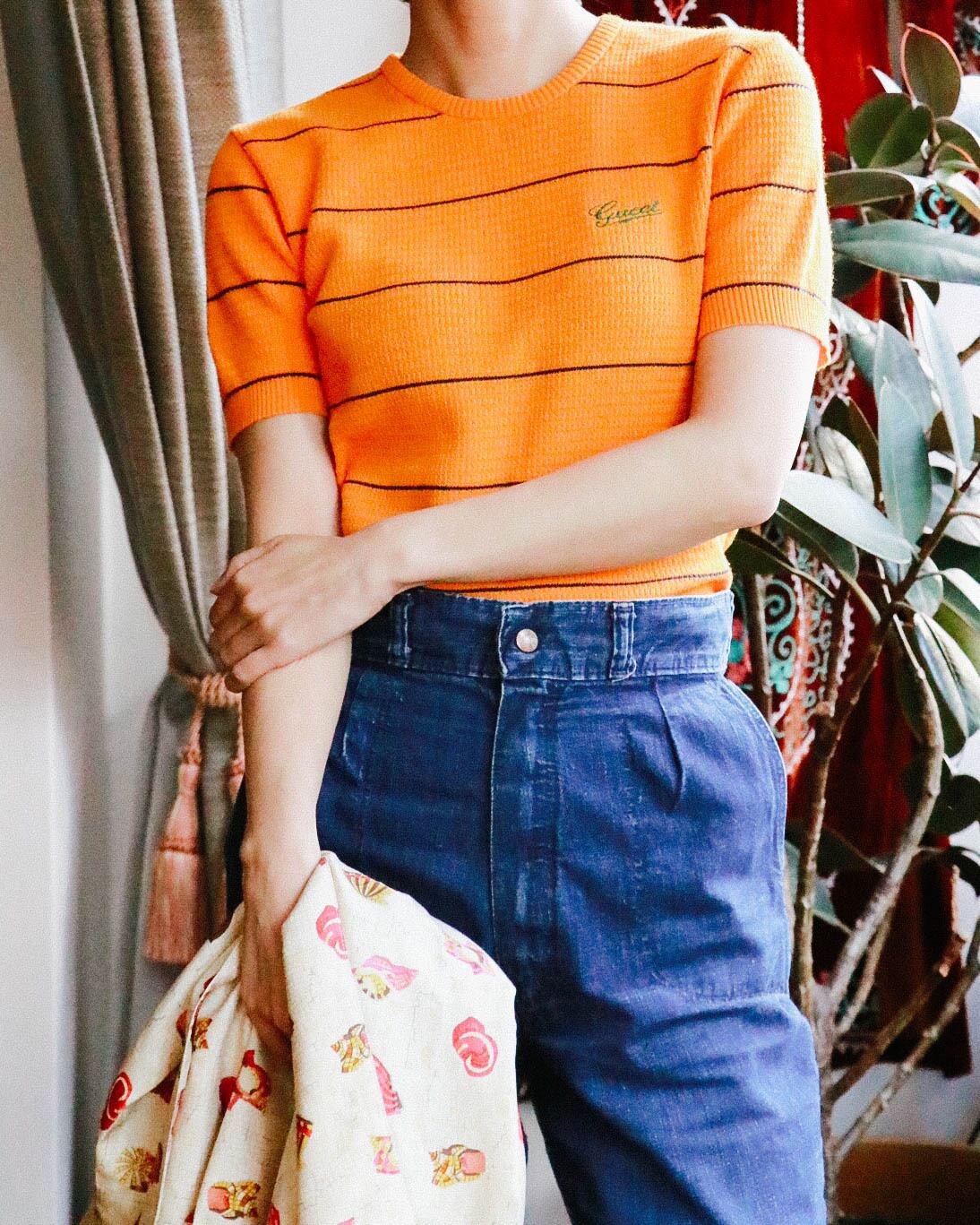 膨張しない細ボーダーにグリーンのロゴ、詰まった首元、程よくコンパクトなサイズ感でありながら気になる二の腕はカバーしバランス良く魅せてくれる。
