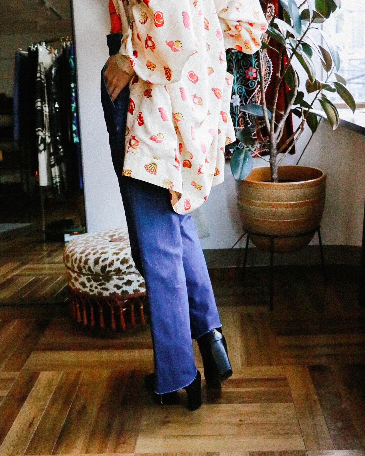 オーシャンモチーフのシルクブラウスはメゾンブランド、