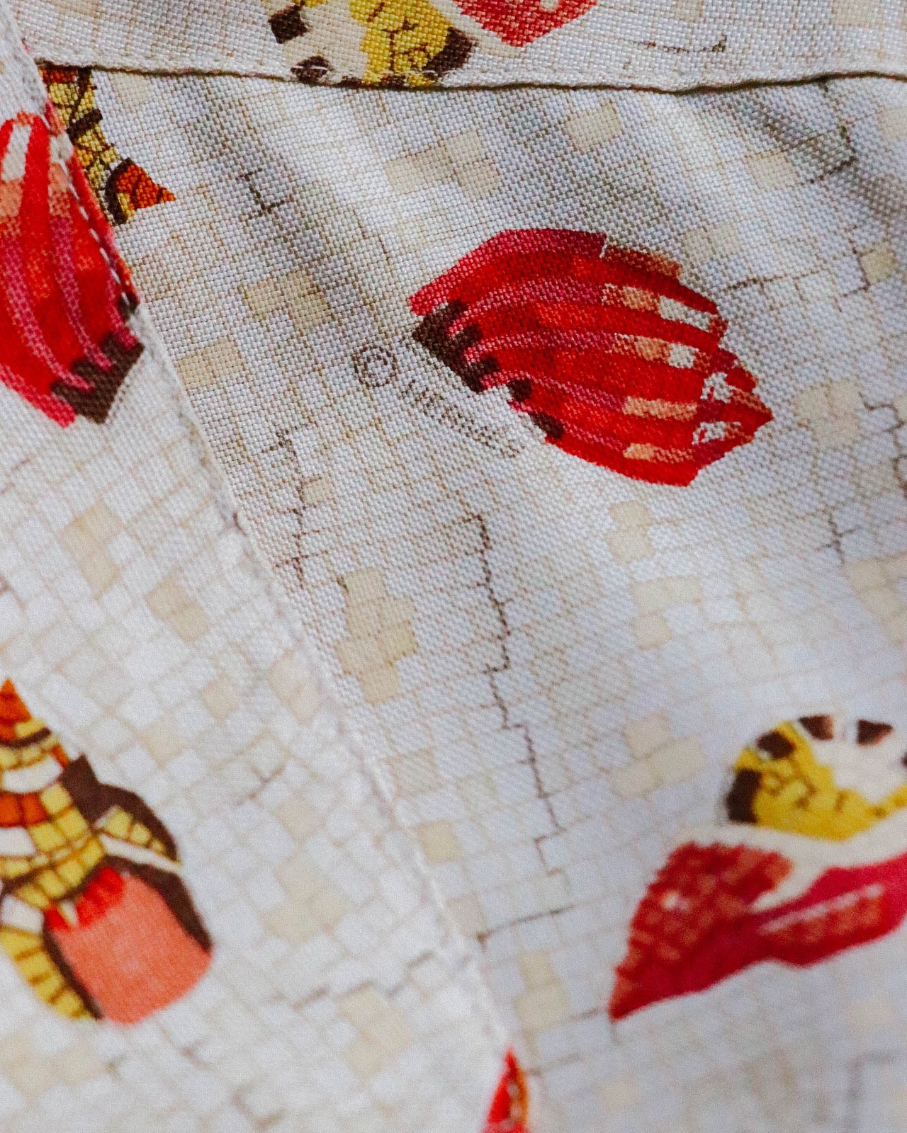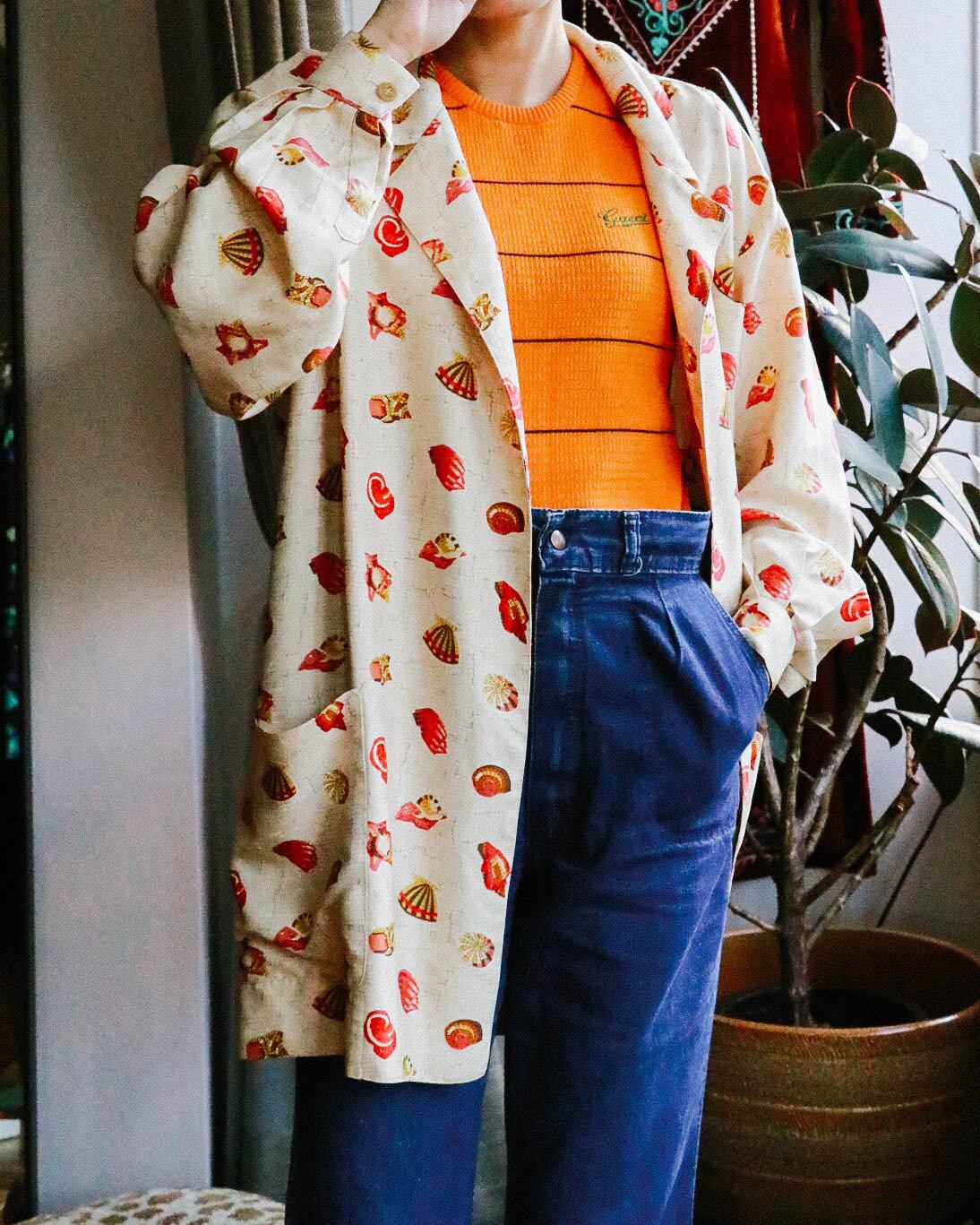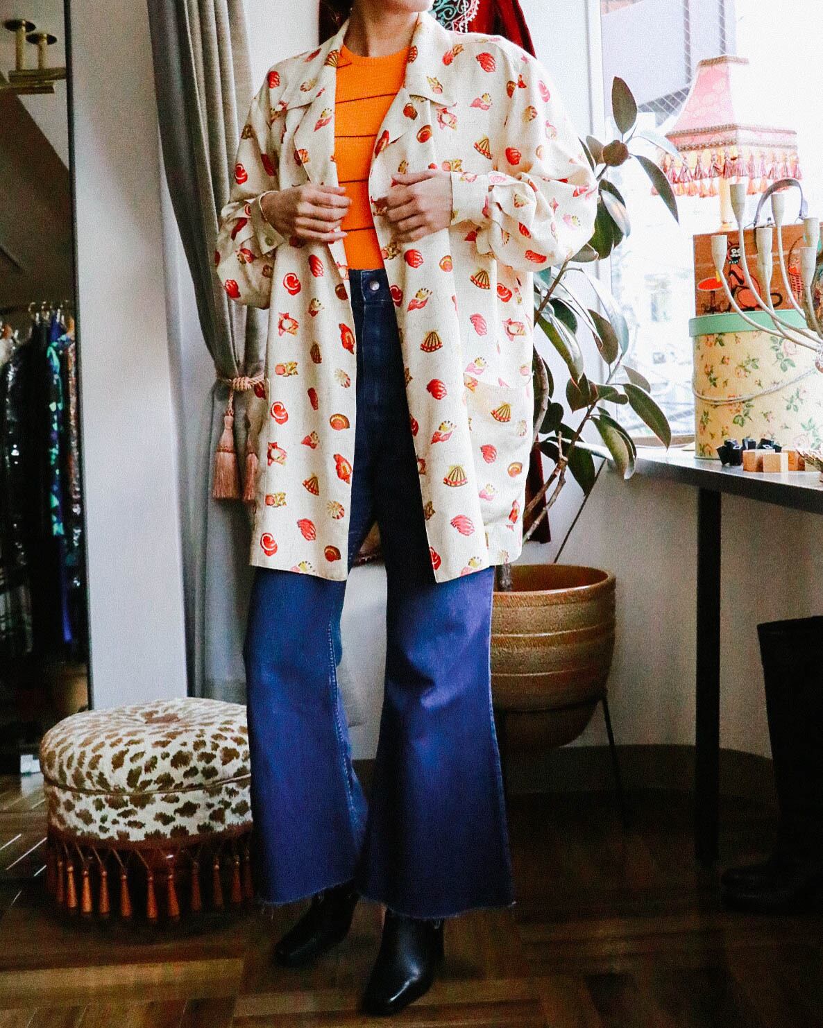 ベージュベースに描かれた貝殻のデザインと贅沢なシルク使いは遊び心のある大人の羽織り
