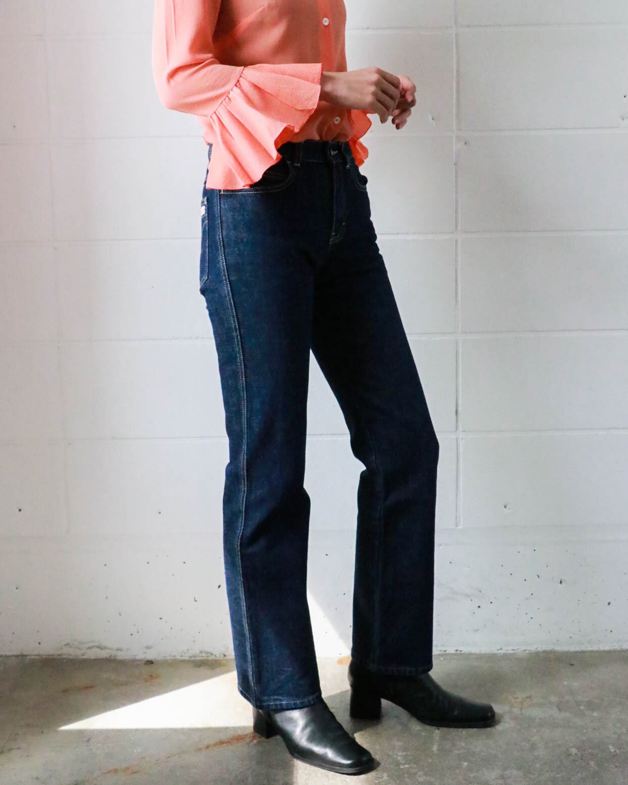 インディゴブルーとフィットする細身シルエットはデニムの中でもカジュアルになりすぎず品良くまとめてくれる。