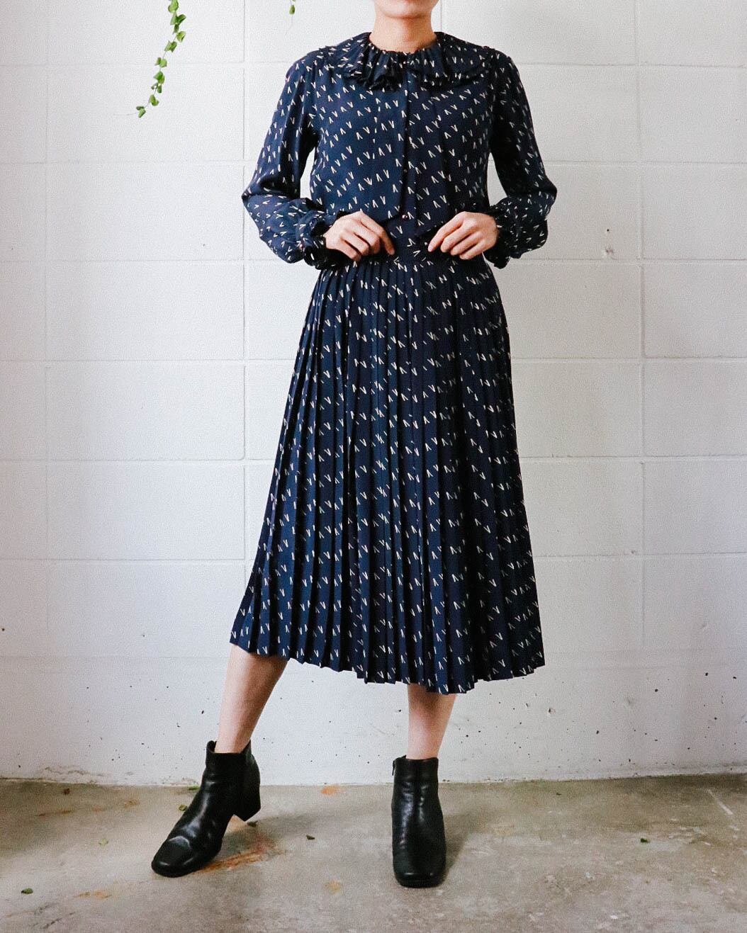 袖や首元のフリル、スカートのプリーツが愛らしく、ネイビーで落ち着いたトーンなので大人フェミニンを叶えてくれます。