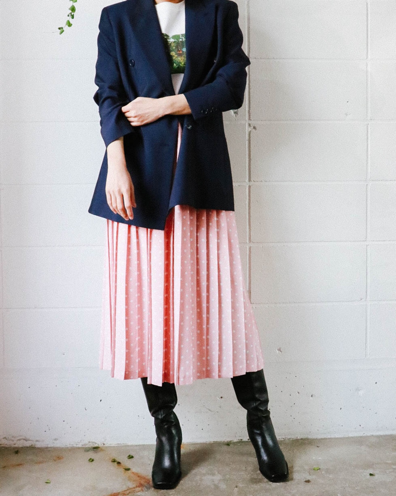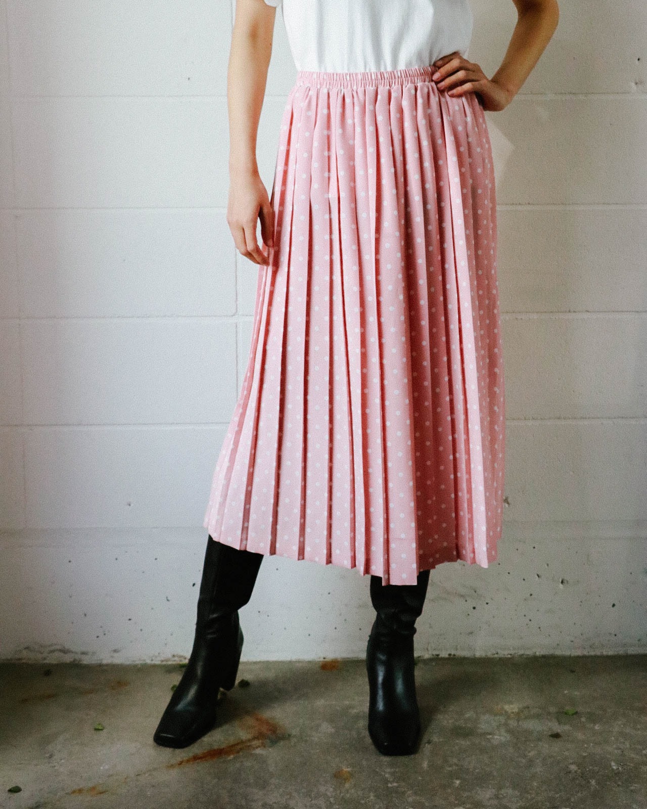 ドット柄は毎シーズン春夏のコーデにはかかせない。こちらはこれからのシーズン、明るい日差しによく似合うプリーツスカートです。