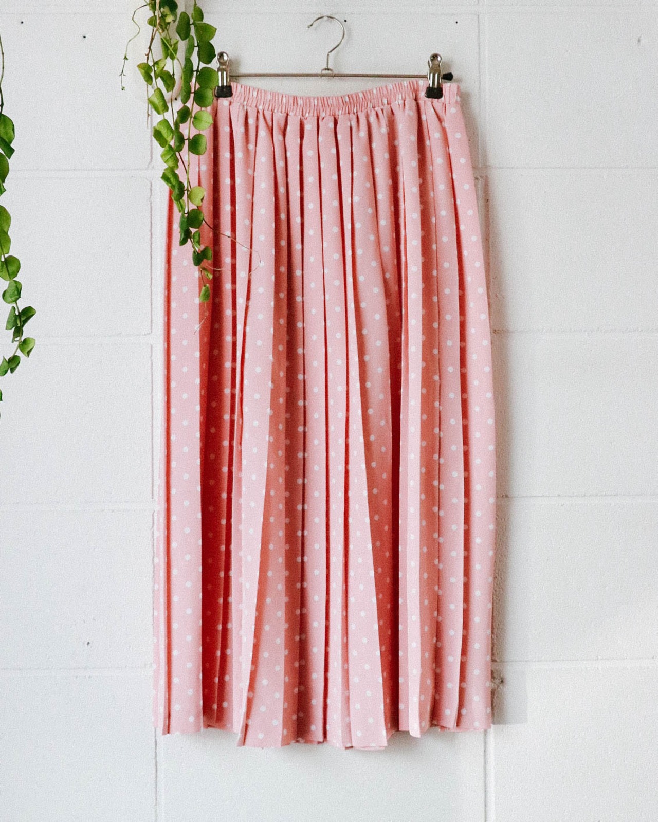 甘い香りが漂ってきそうなピンクと白のピンドット。露出控えめで細見えするミモレ丈がいい。