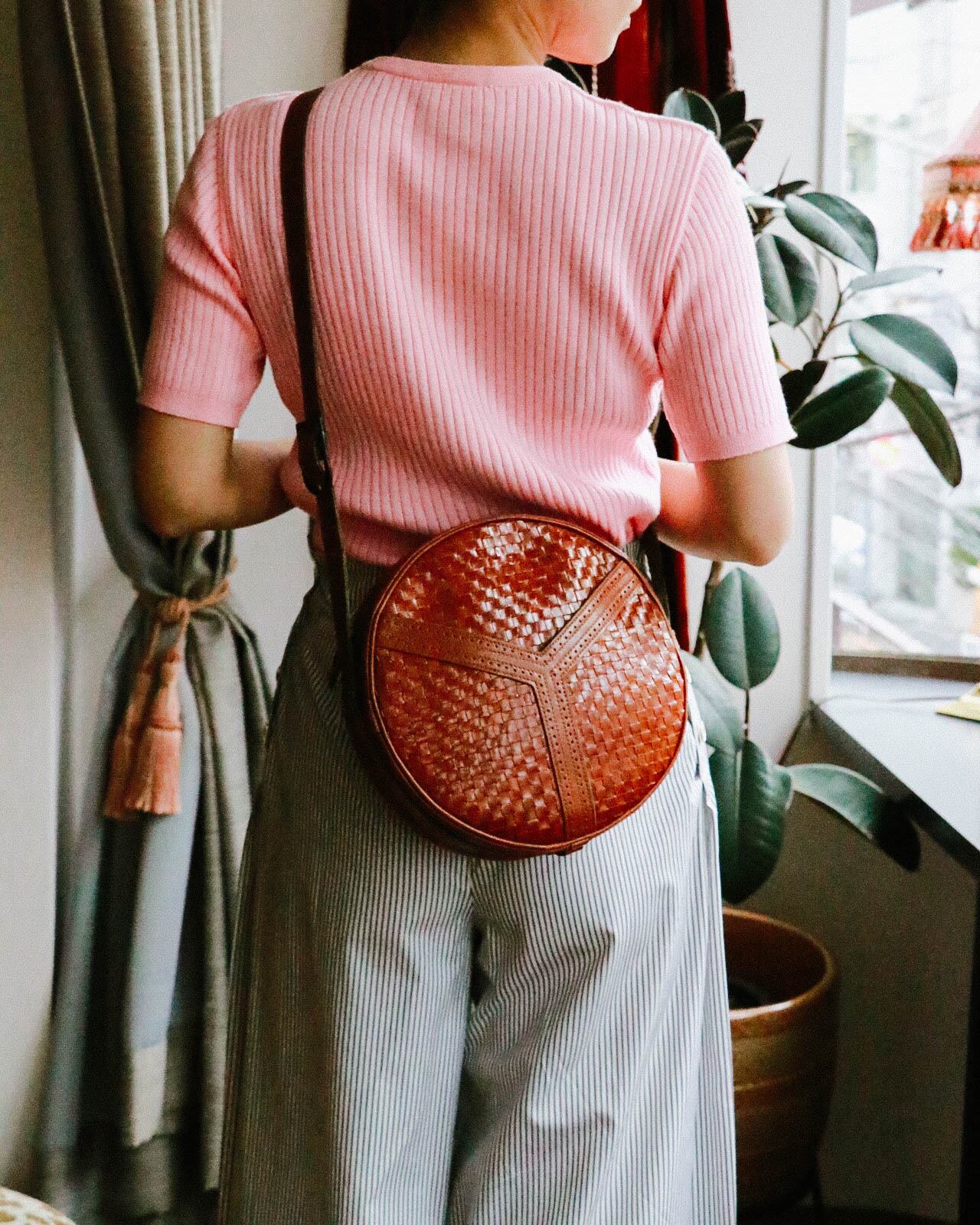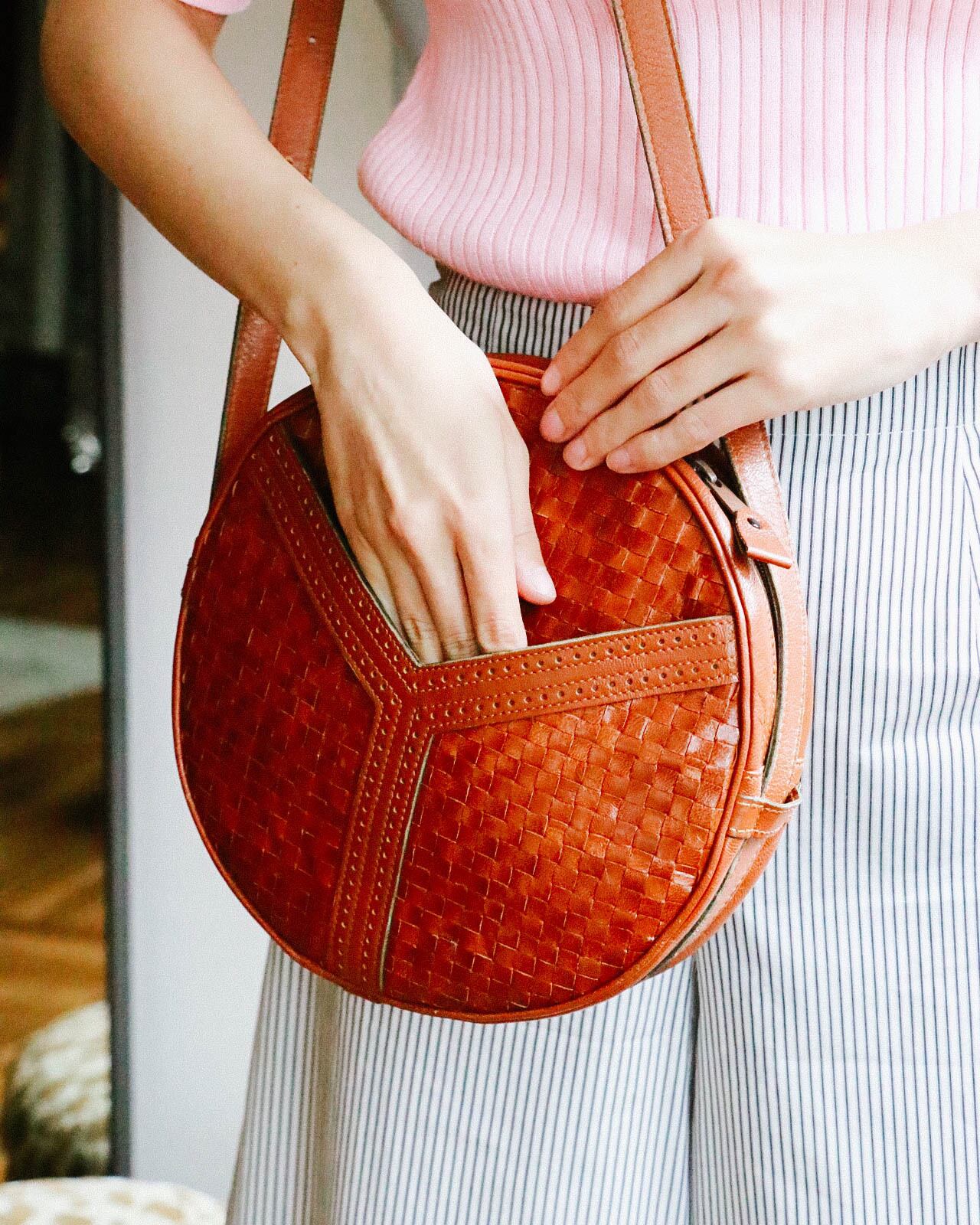 フランスのお菓子、ガレットブルトンヌを思わせるなんとも愛らしいルックスに乙女心がくすぐられるバッグはイヴ・サンローランのもの。さりげないY字ロゴはポケットに。使い勝手の良いカラーとサイズ感に珍しいデザインが遊び心ある大人のコーディネートに。
