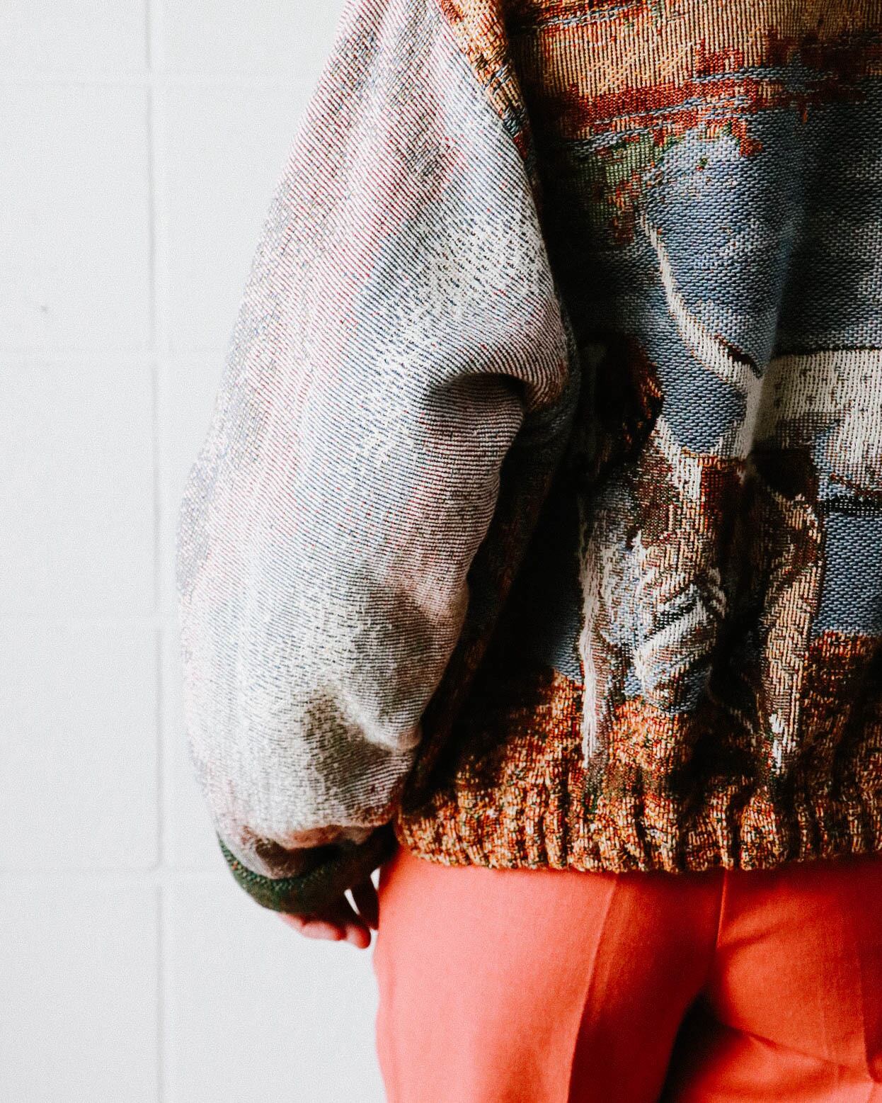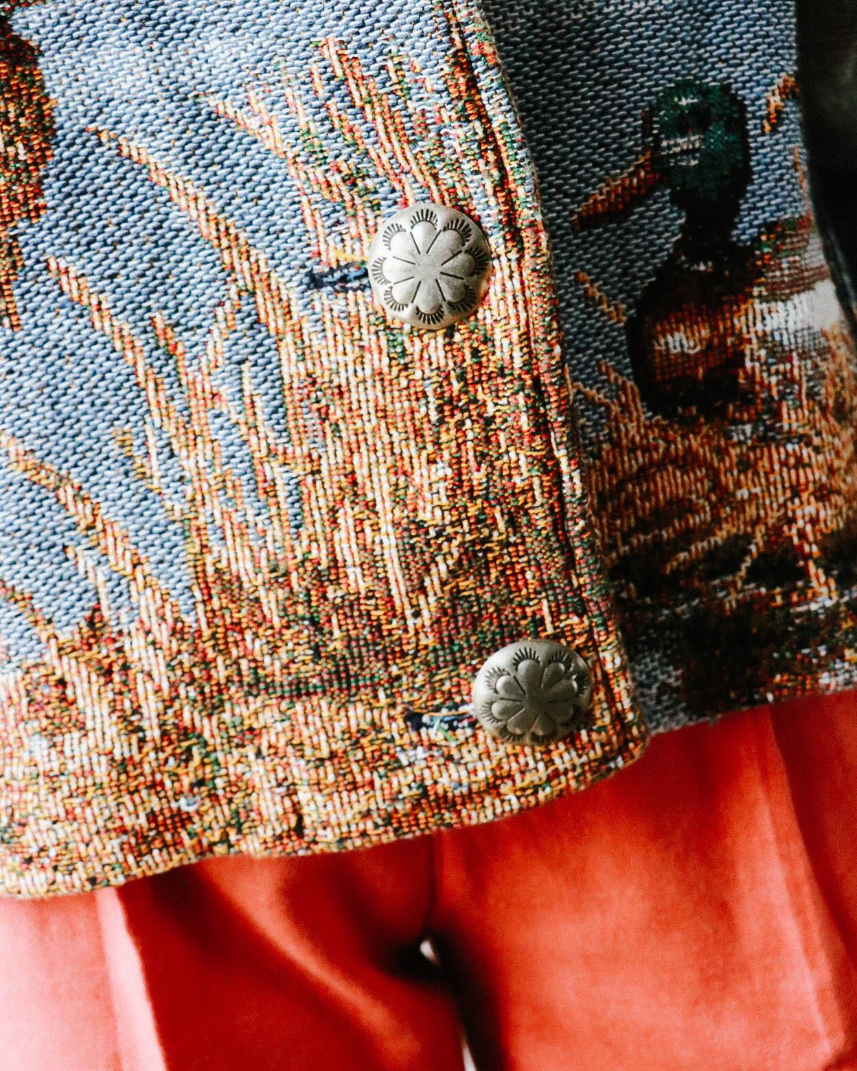 織り込まれた絵とコンチョボタン、ビッグシルエットのバランスがいい。デニムと合わせてバサッとカジュアルに羽織りたい。