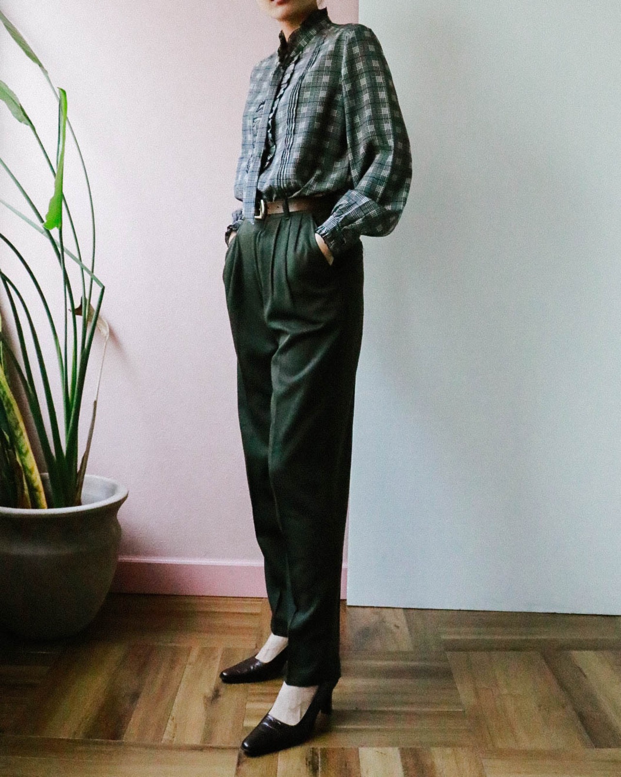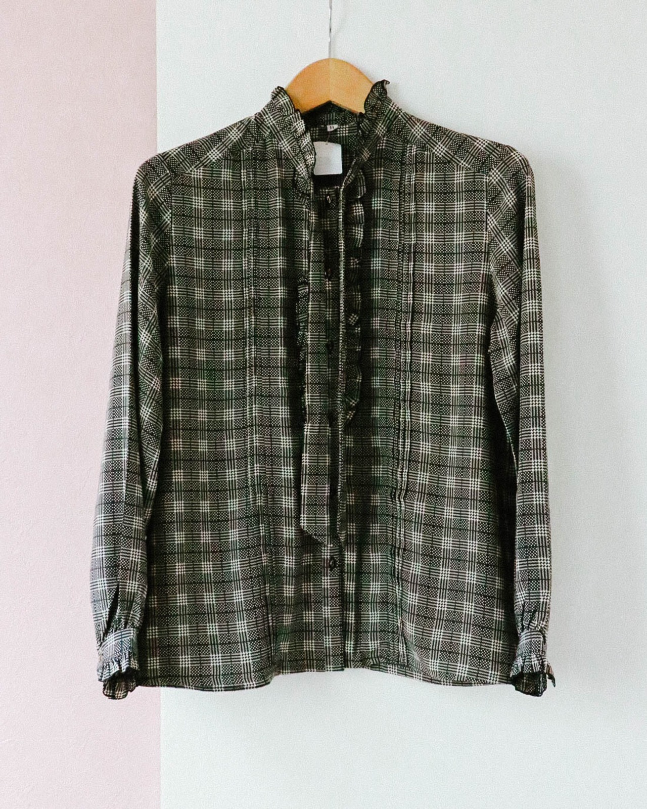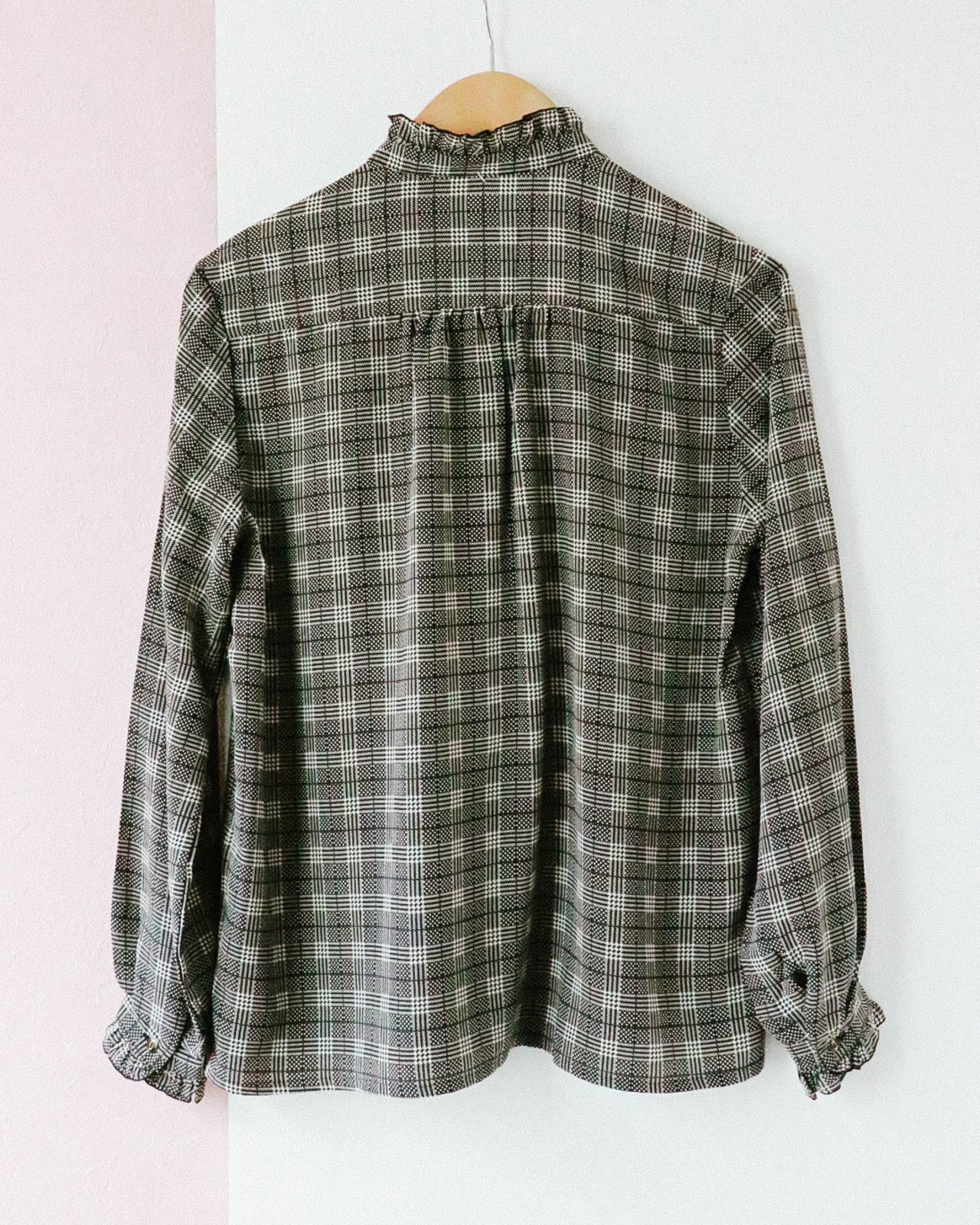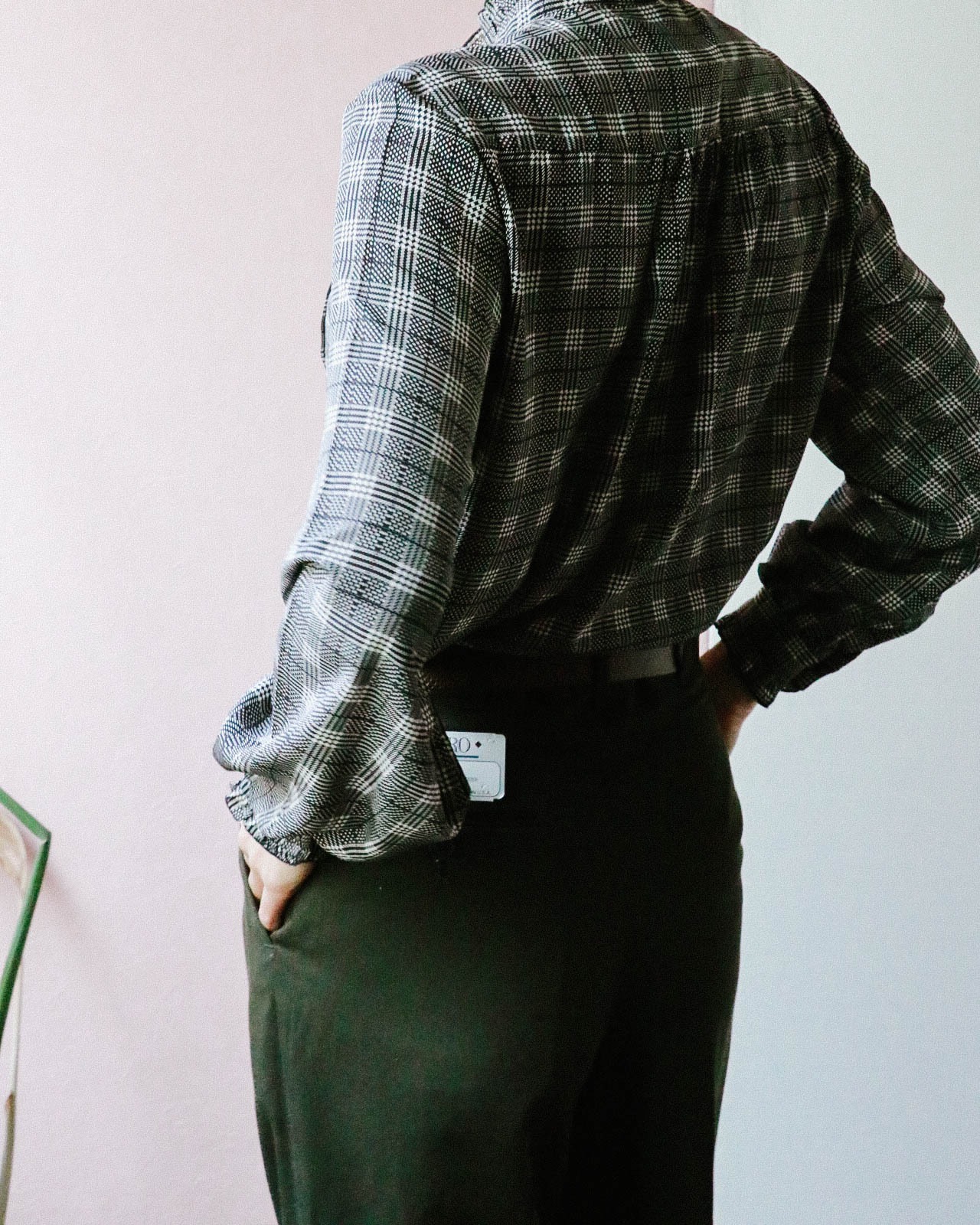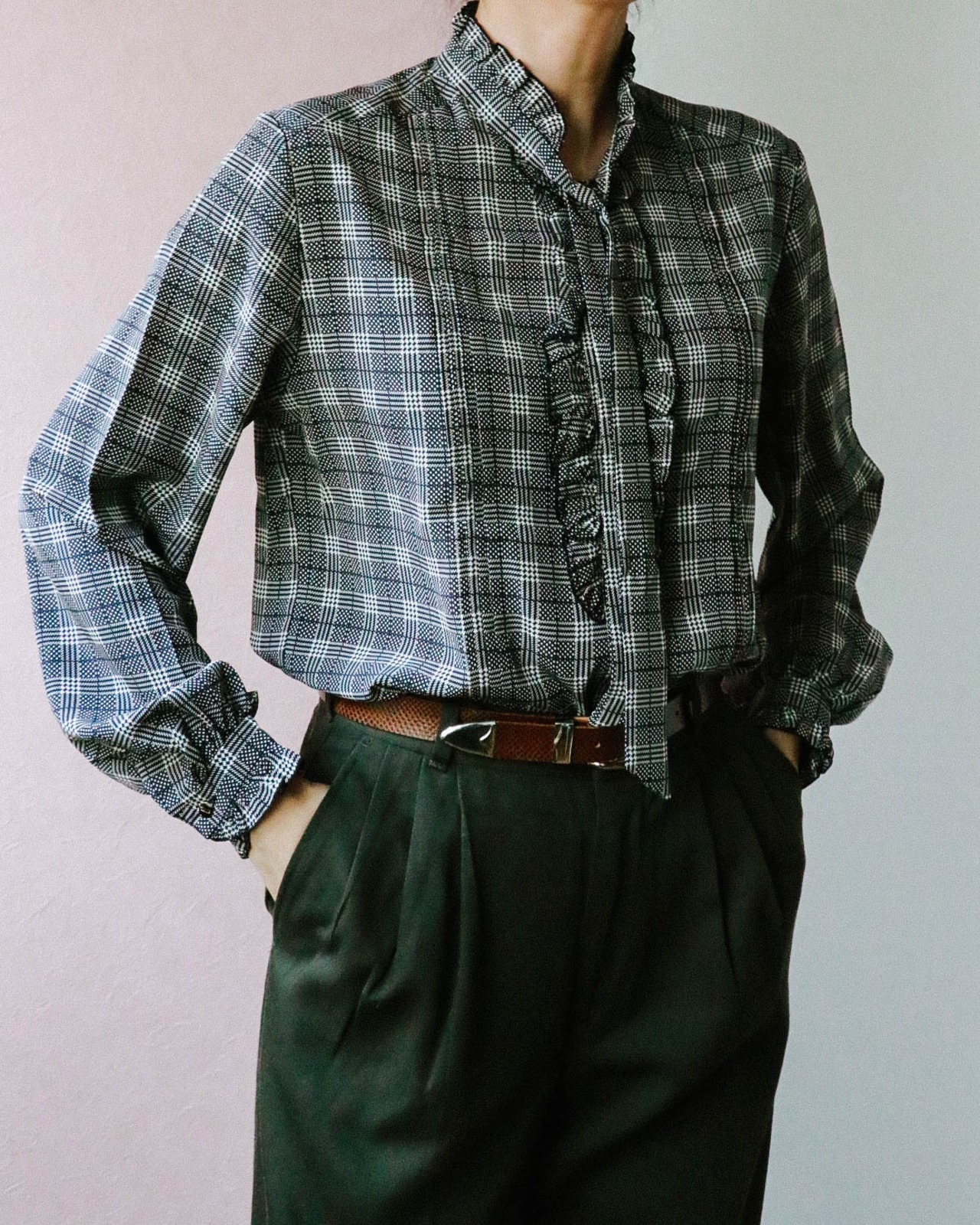 シンプルで上品なチェック柄は着回しやすい。どんなシーンにも活躍する女性らしさ際立つブラウスは揃えておきたいですね。