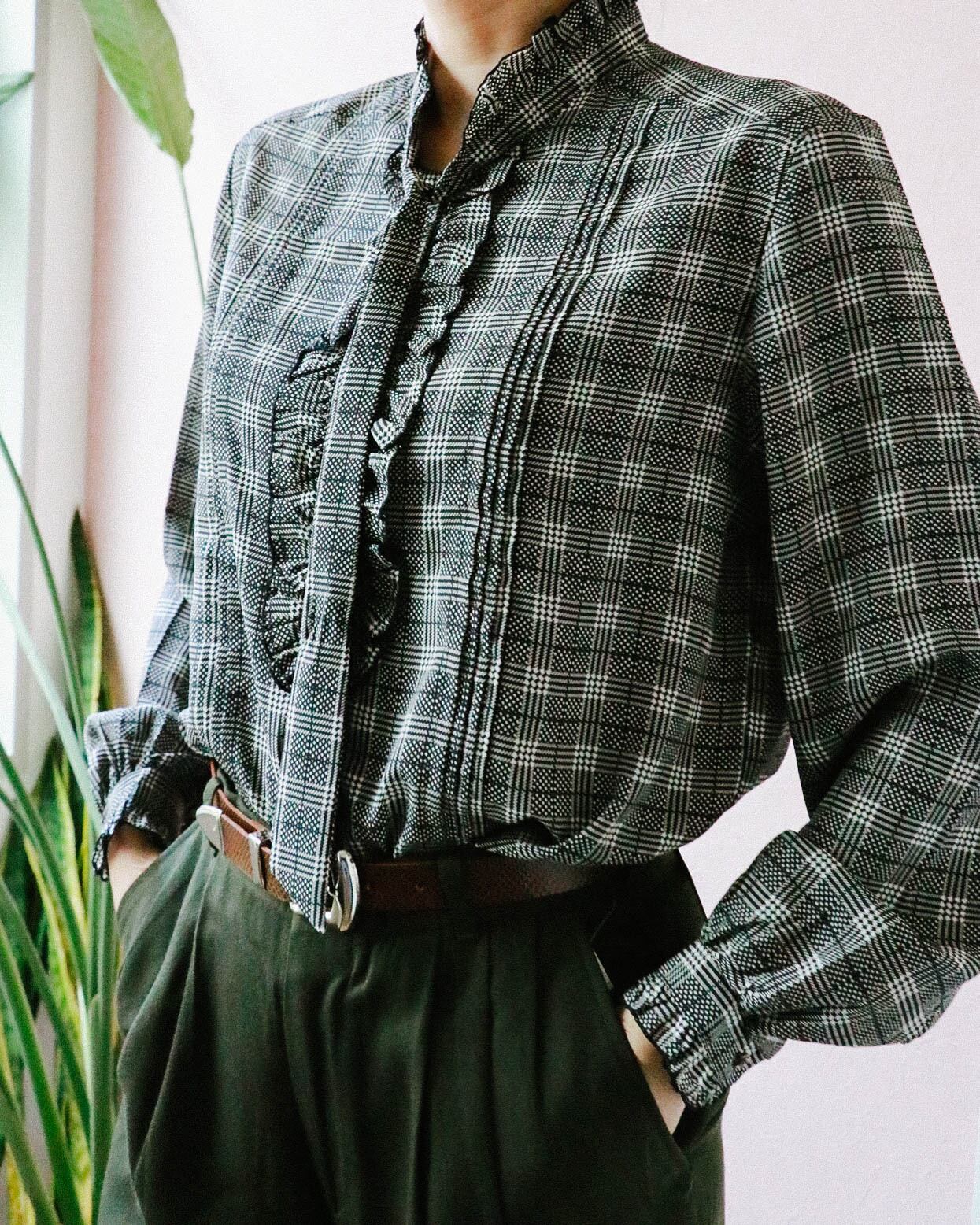 70s checked ribbon blouse