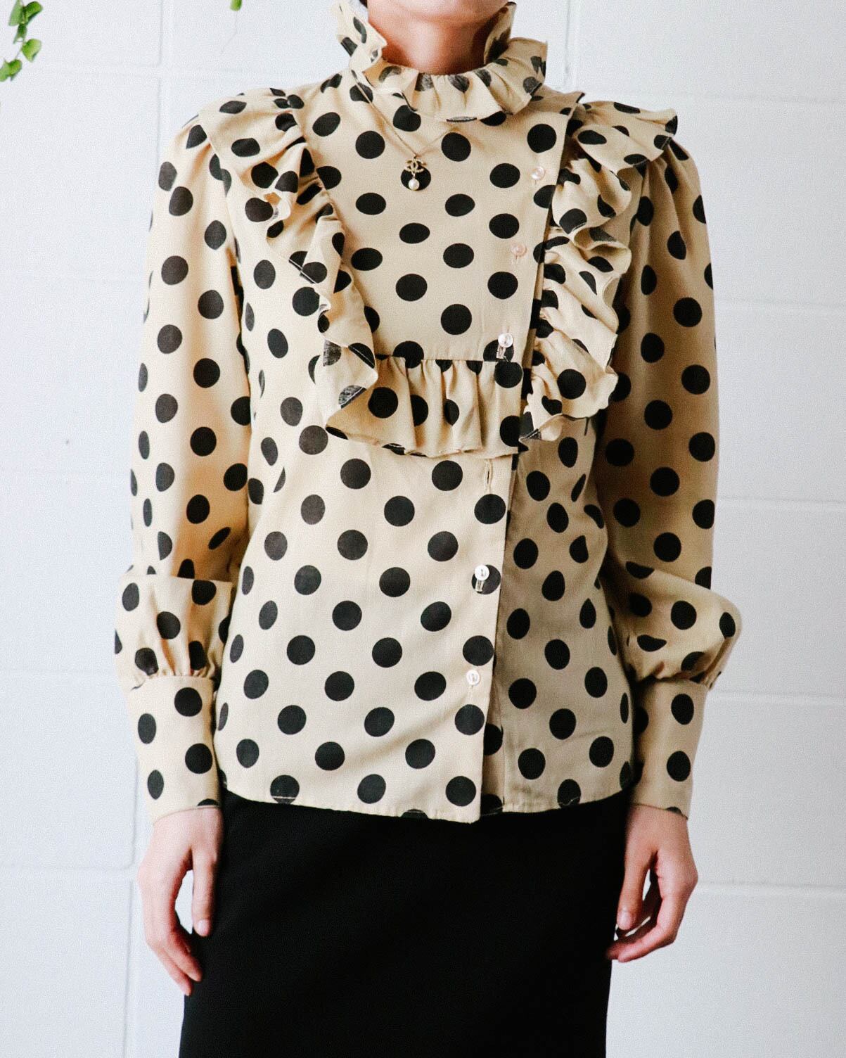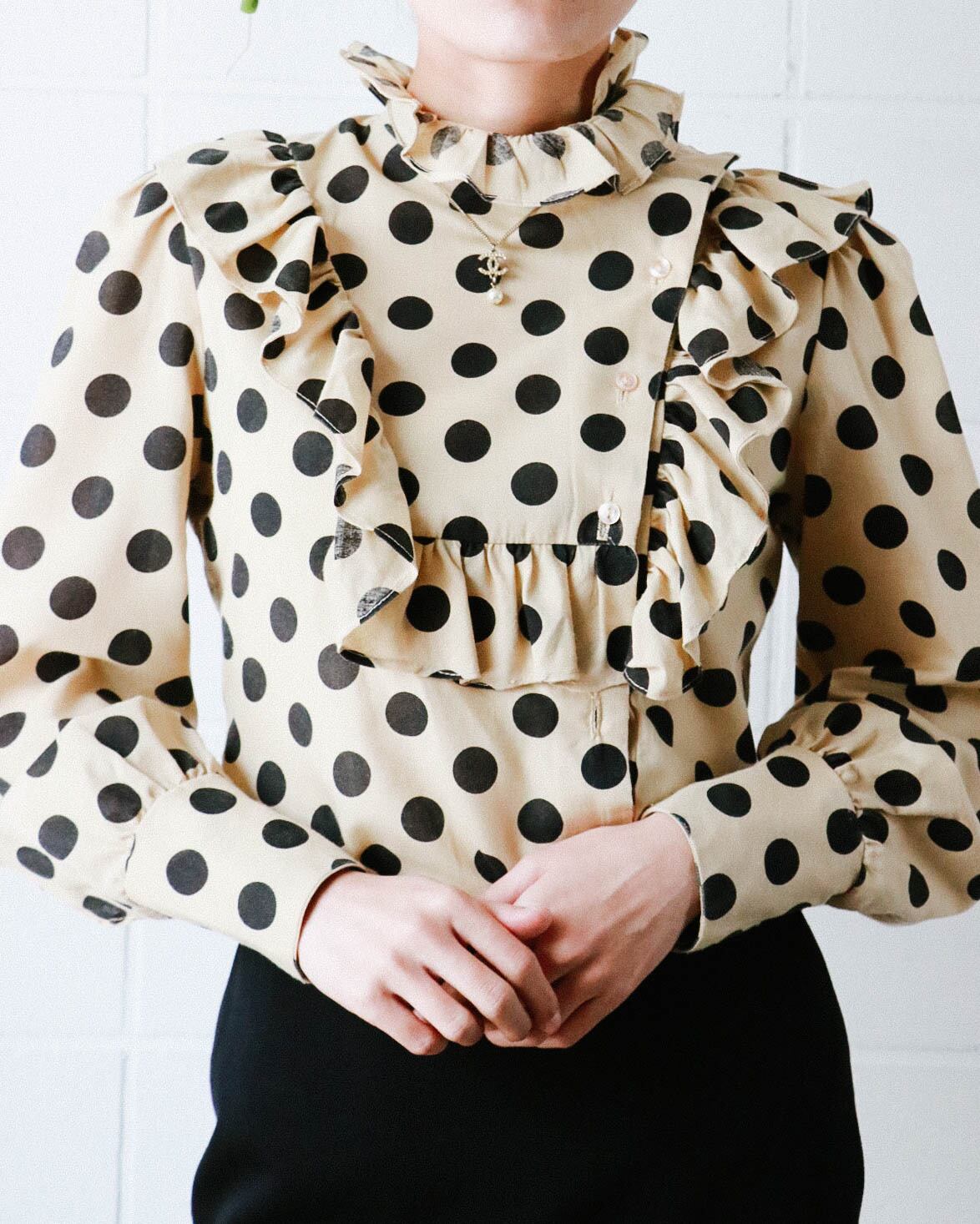 スタンドカラーにフリル、ドット柄と乙女心をくすぐるディテール満載な1970年代のブラウス。