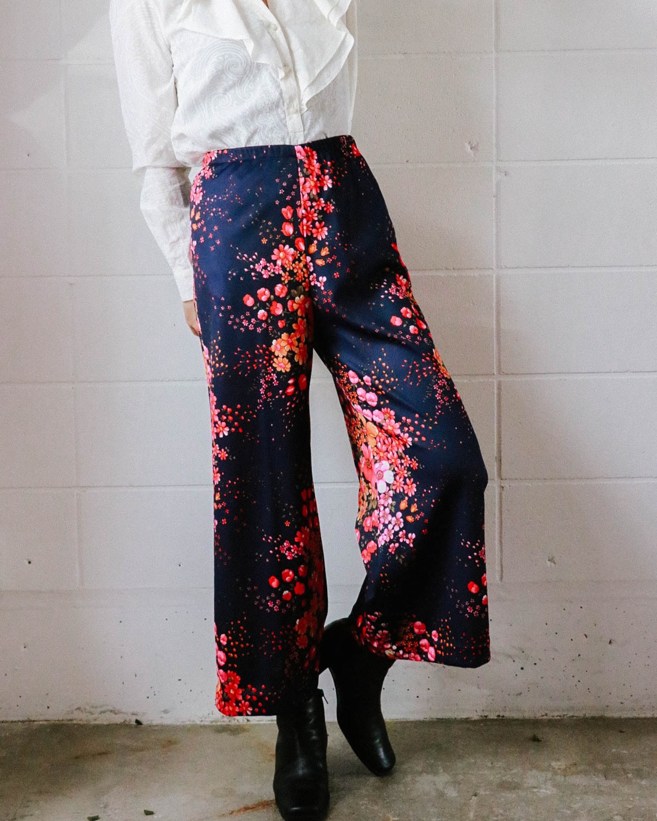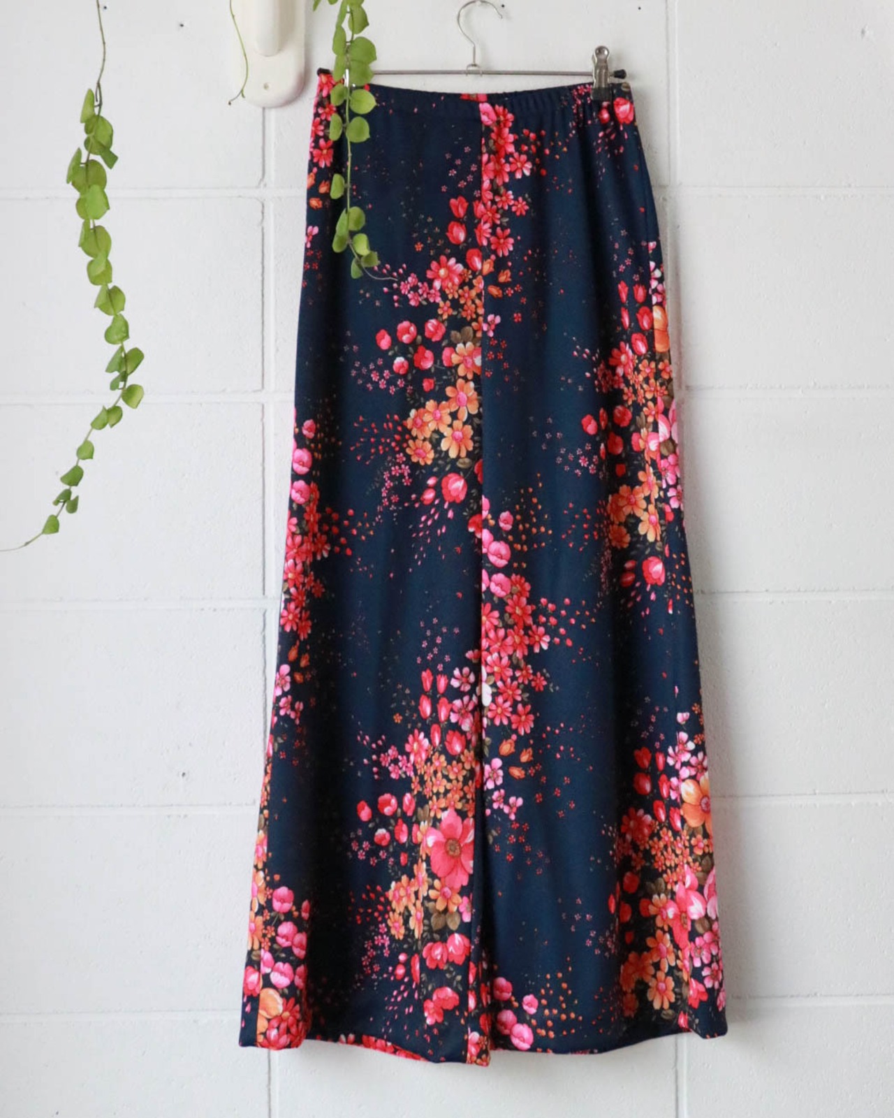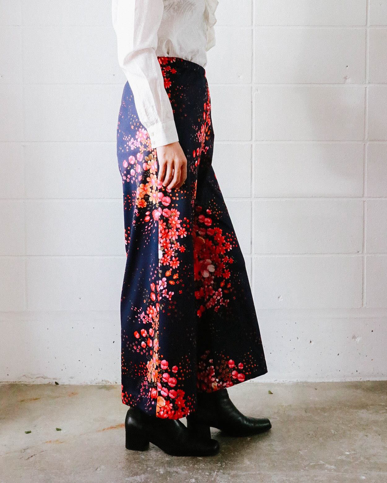 ロングスカート感覚で履けるちょっとフレアになったシルエットにオレンジとピンクの美しい色とりどりのフラワー達が今の気分にハマる。ウエストゴムの光沢あるストレッチ素材。気分からハッピーにさせてくれる1着です。お早めにどうぞ。