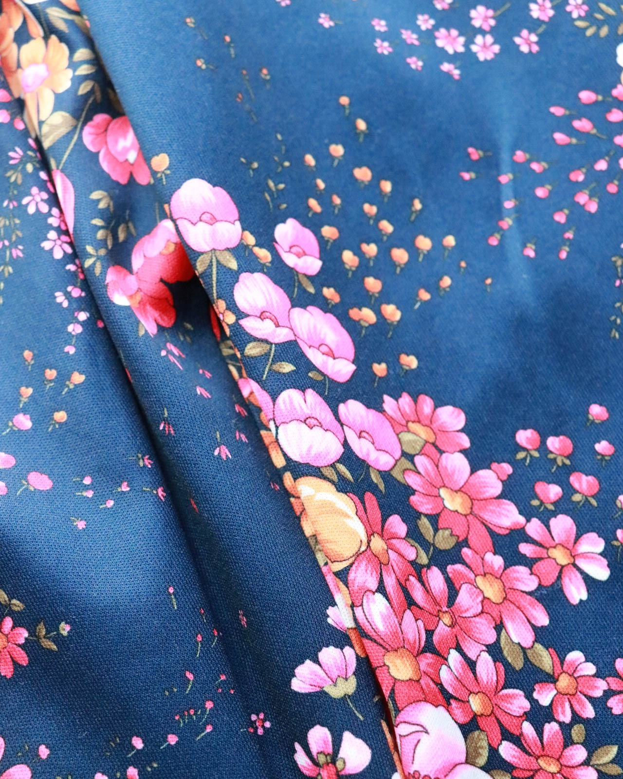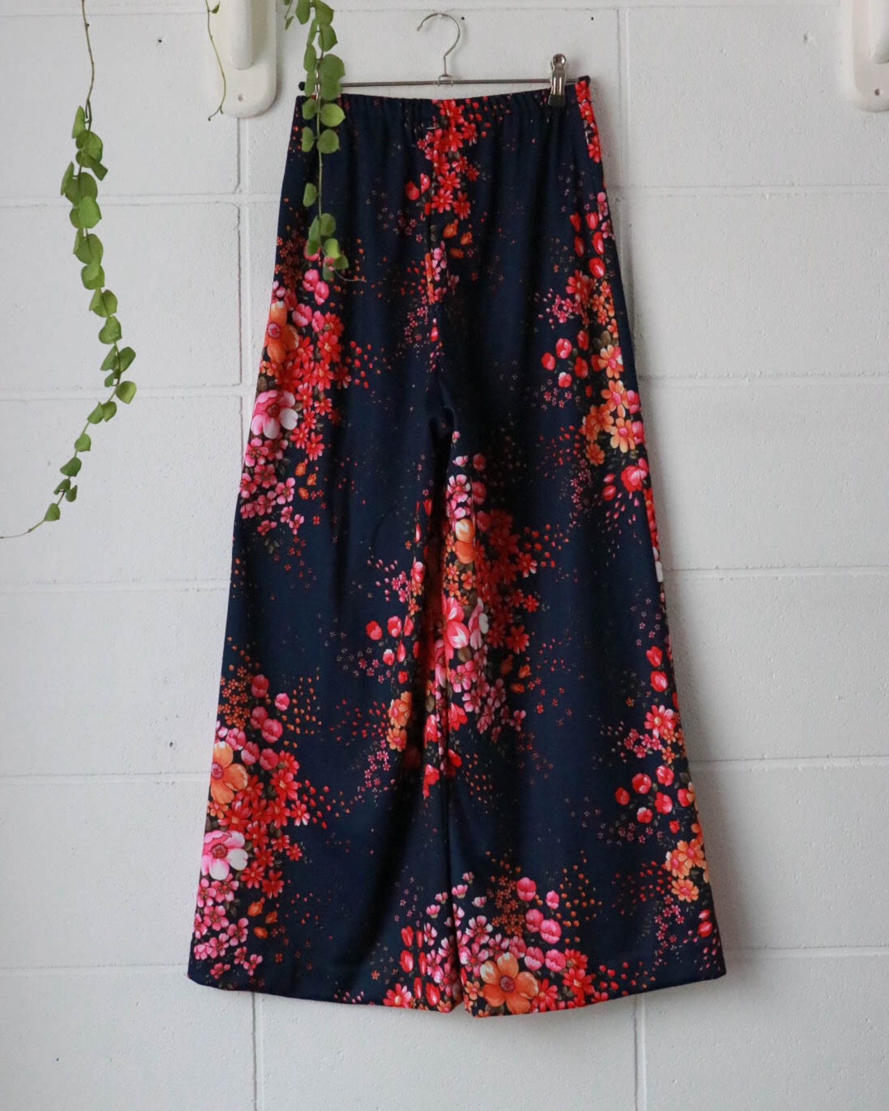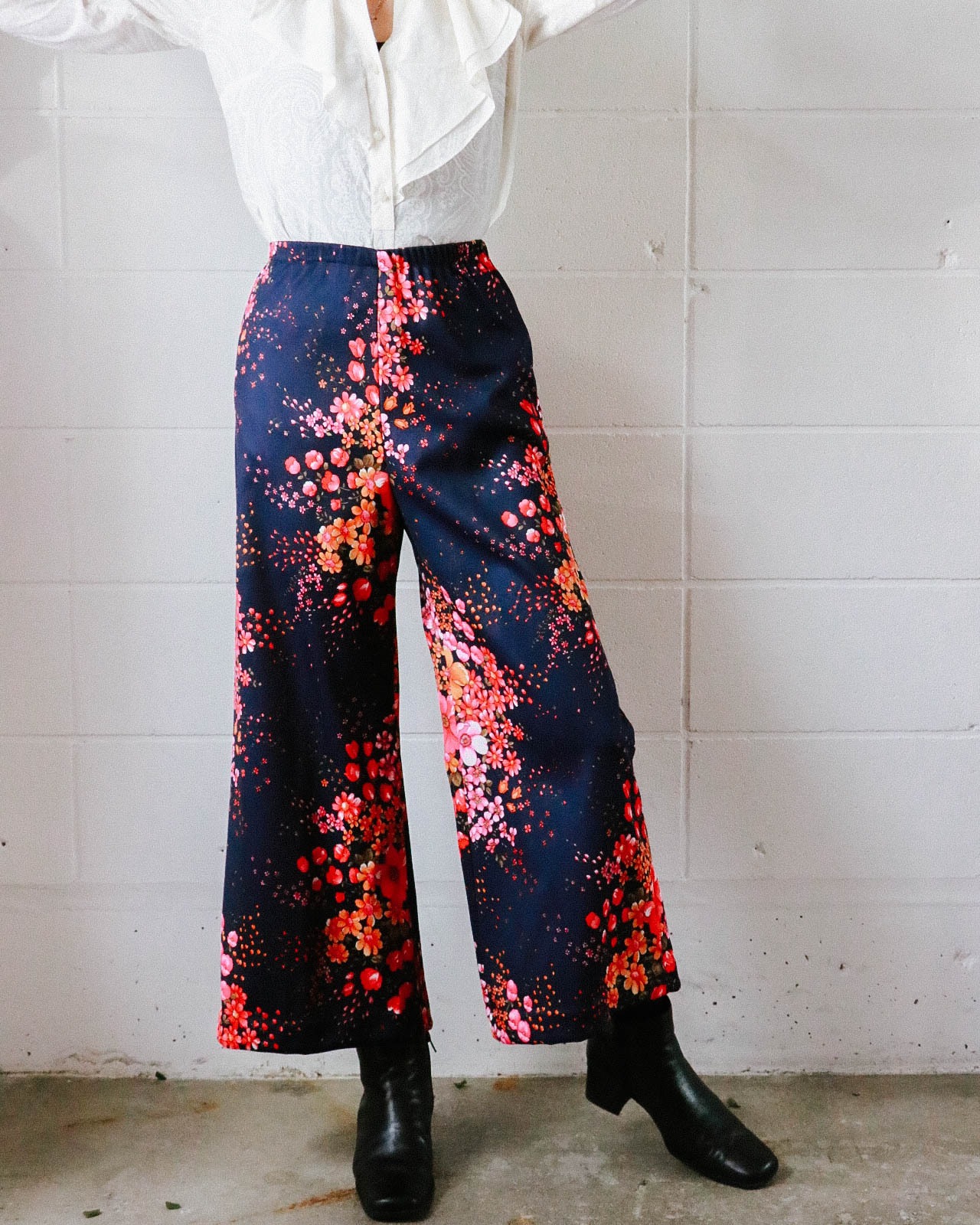 ロングスカート感覚で履けるちょっとフレアになったシルエットにオレンジとピンクの美しい色とりどりのフラワー達が今の気分にハマる。ウエストゴムの光沢あるストレッチ素材。気分からハッピーにさせてくれる1着です。お早めにどうぞ。