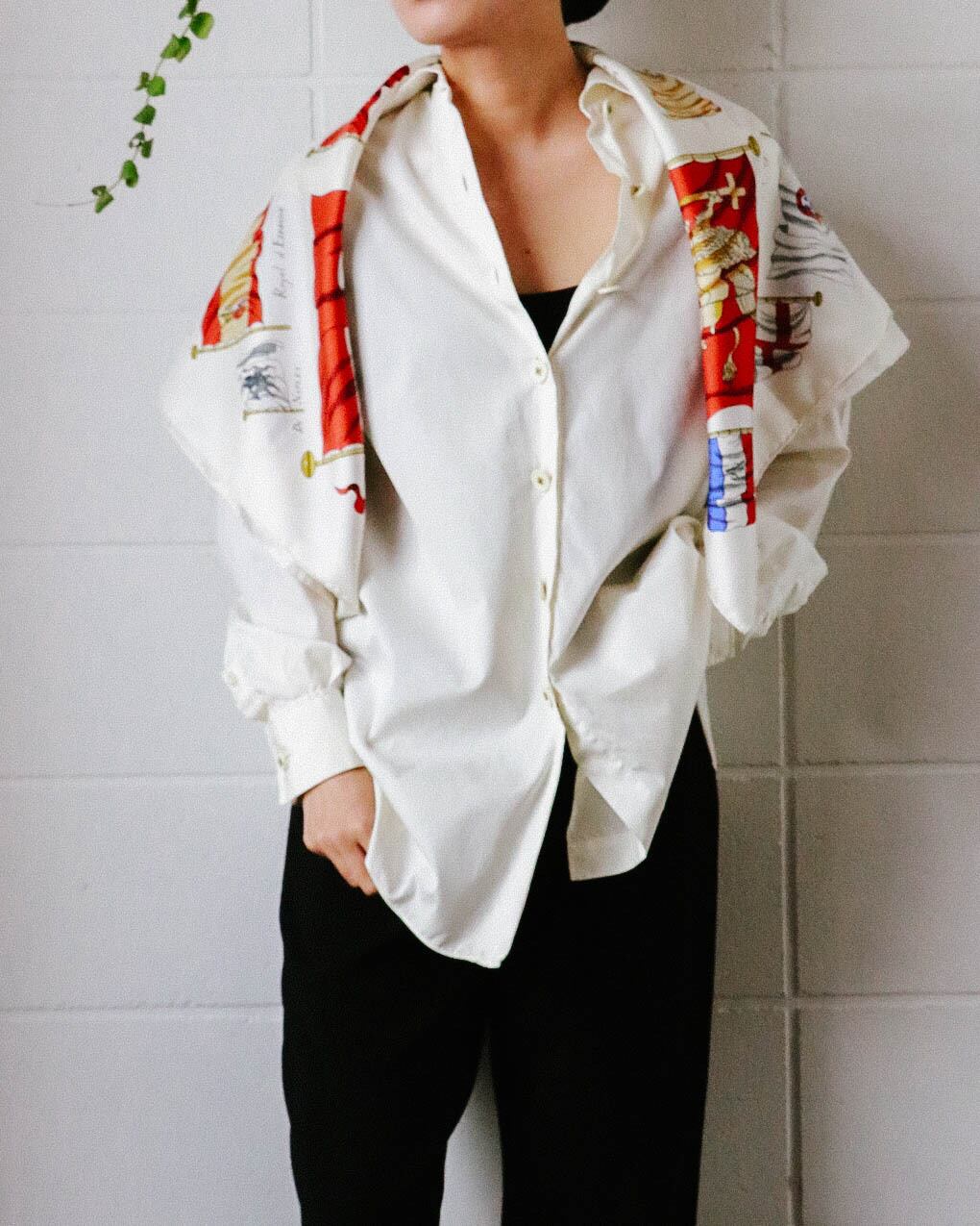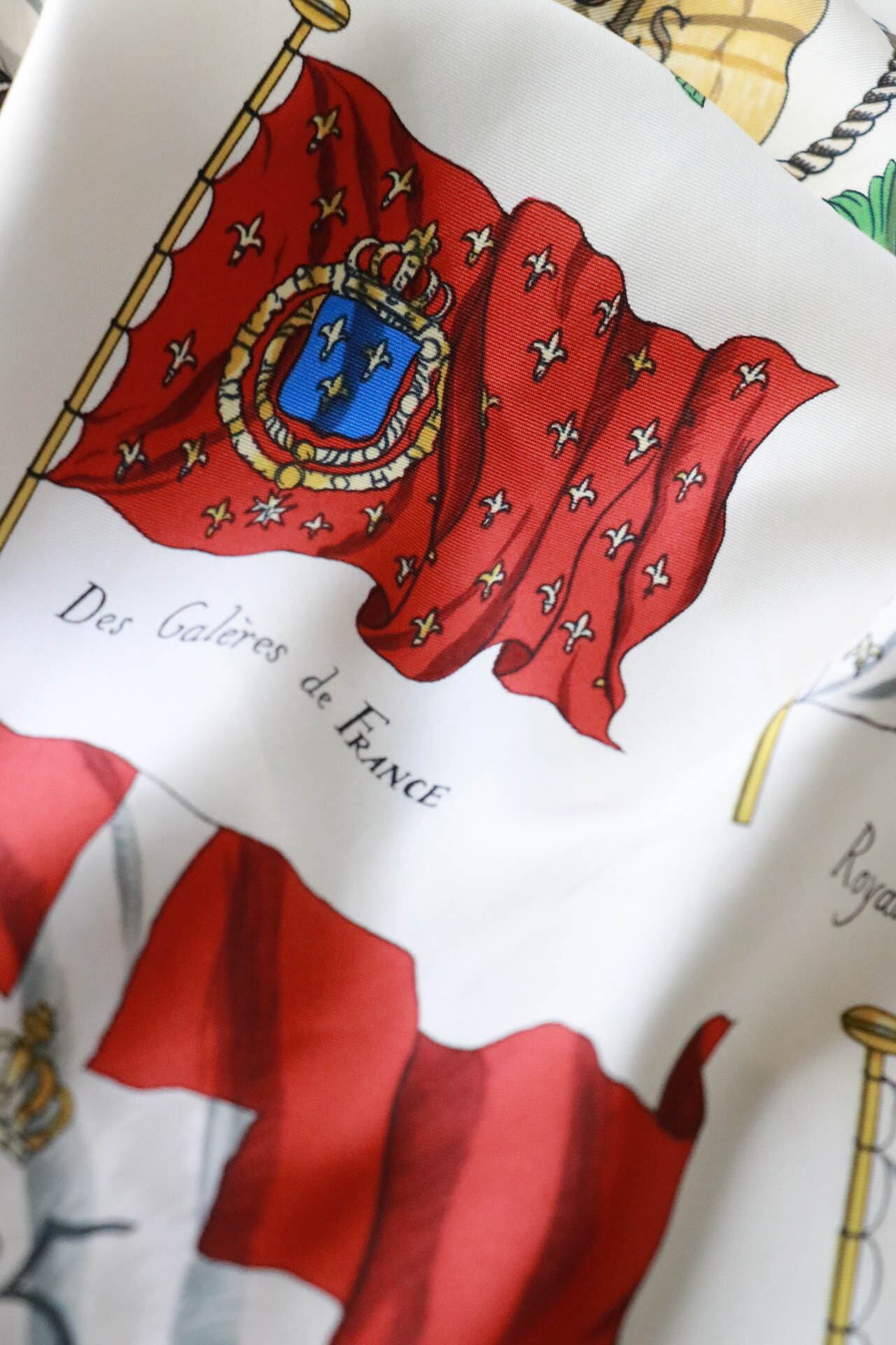 上質なシルク素材や絵柄が素敵なヴィンテージスカーフは、ついつい集めたくなってしまいます。こちらはHERMESの大判スカーフ。