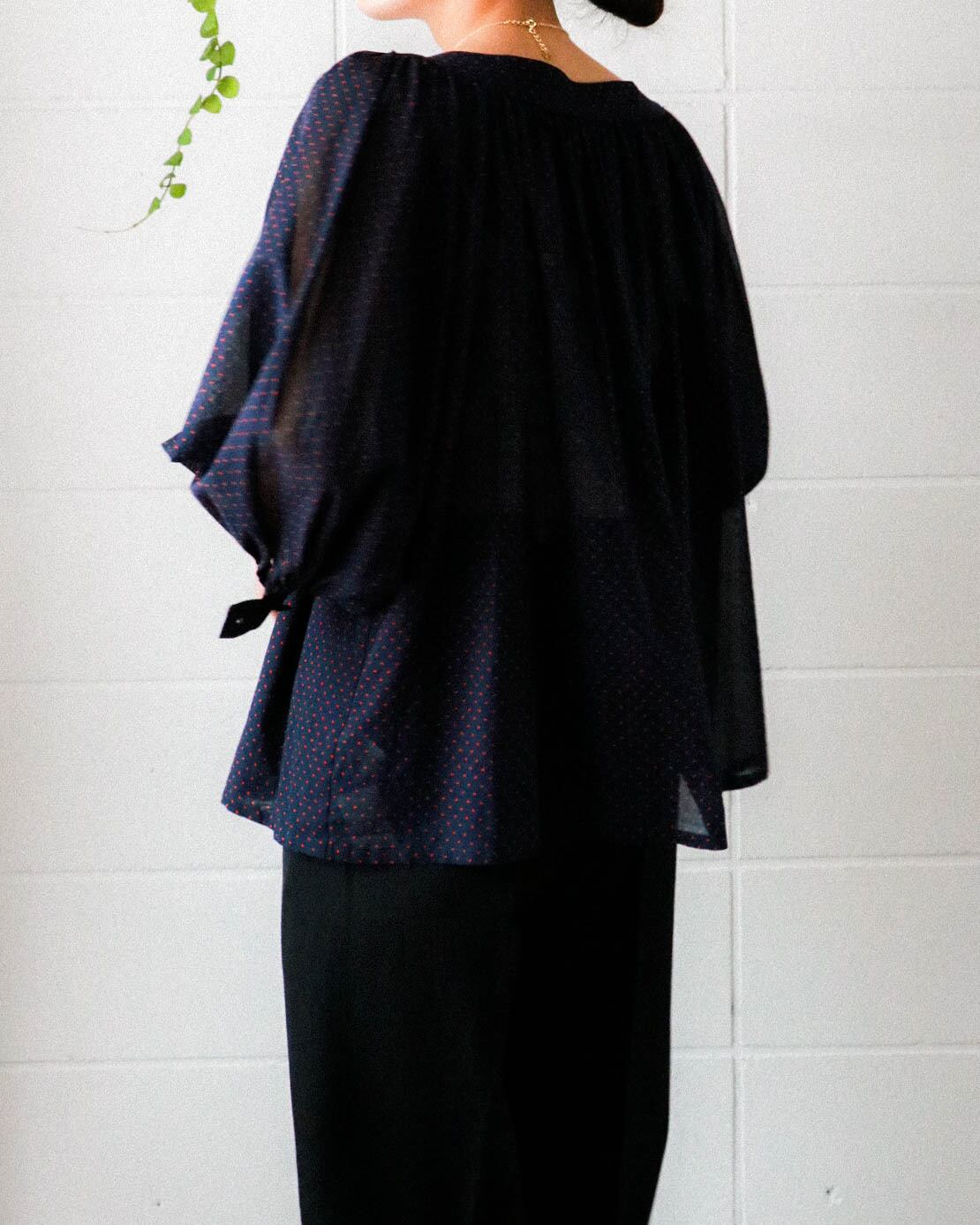 気品溢れるダークネイビーにピンドット、重厚なカラーを爽やかに魅せるシアーな素材。ディテール自体はガーリーなものの、そうは見せない仕上がりがきちんとした大人の春夏スタイルに。生地を贅沢に使用することによって気になる部分を隠しながら胸元や袖、バックスタイルまでエアリーで柔らかな女性像を演出してくれる。
