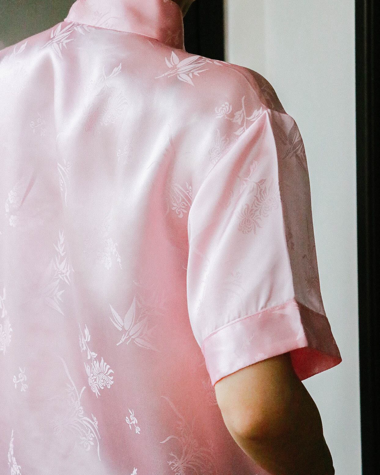 もはやオリエンタルムードが定番になっている昨今、欠かせないアイテムなのがチャイナブラウス。こちらは、爽やかな薄ピンク地と特有のチャイナボタンの装飾がうつくしい。
