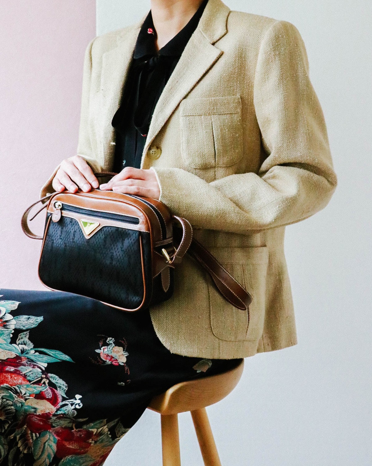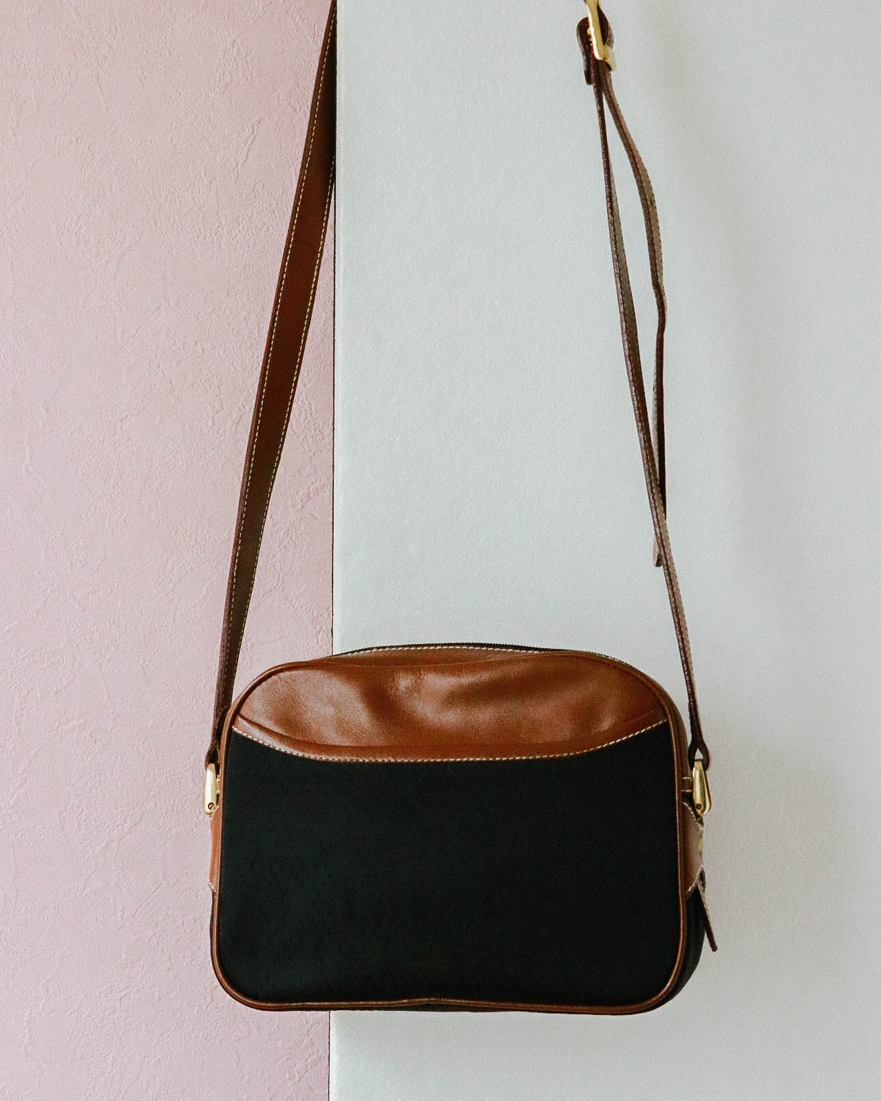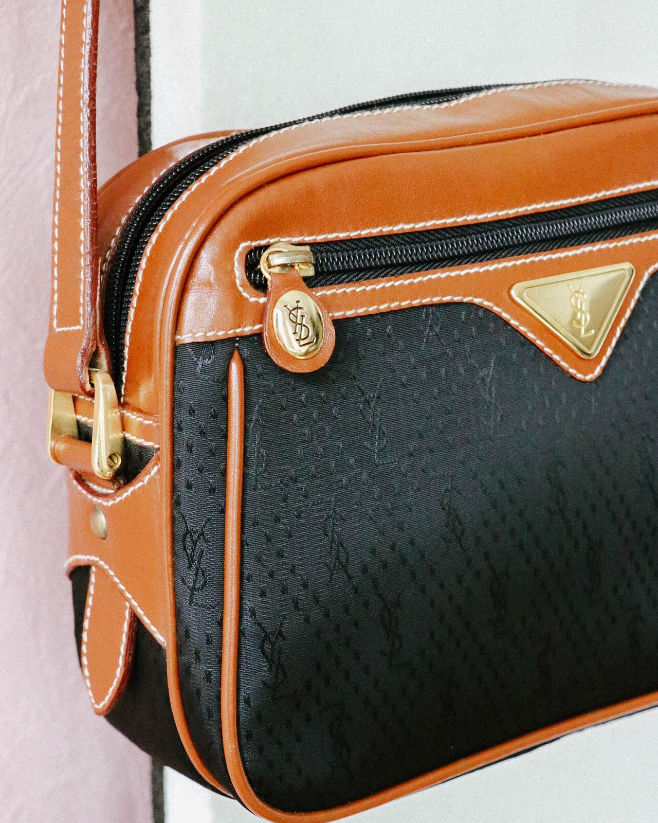 イヴサンローランのブラウンxブラックショルダーバッグ。かっちりとしたデザインながら、レザーとPVCのコンビで上品なカジュアルさと軽量さが魅力的。外側、内側共にジップ付きのポケットで安心感も抜群。