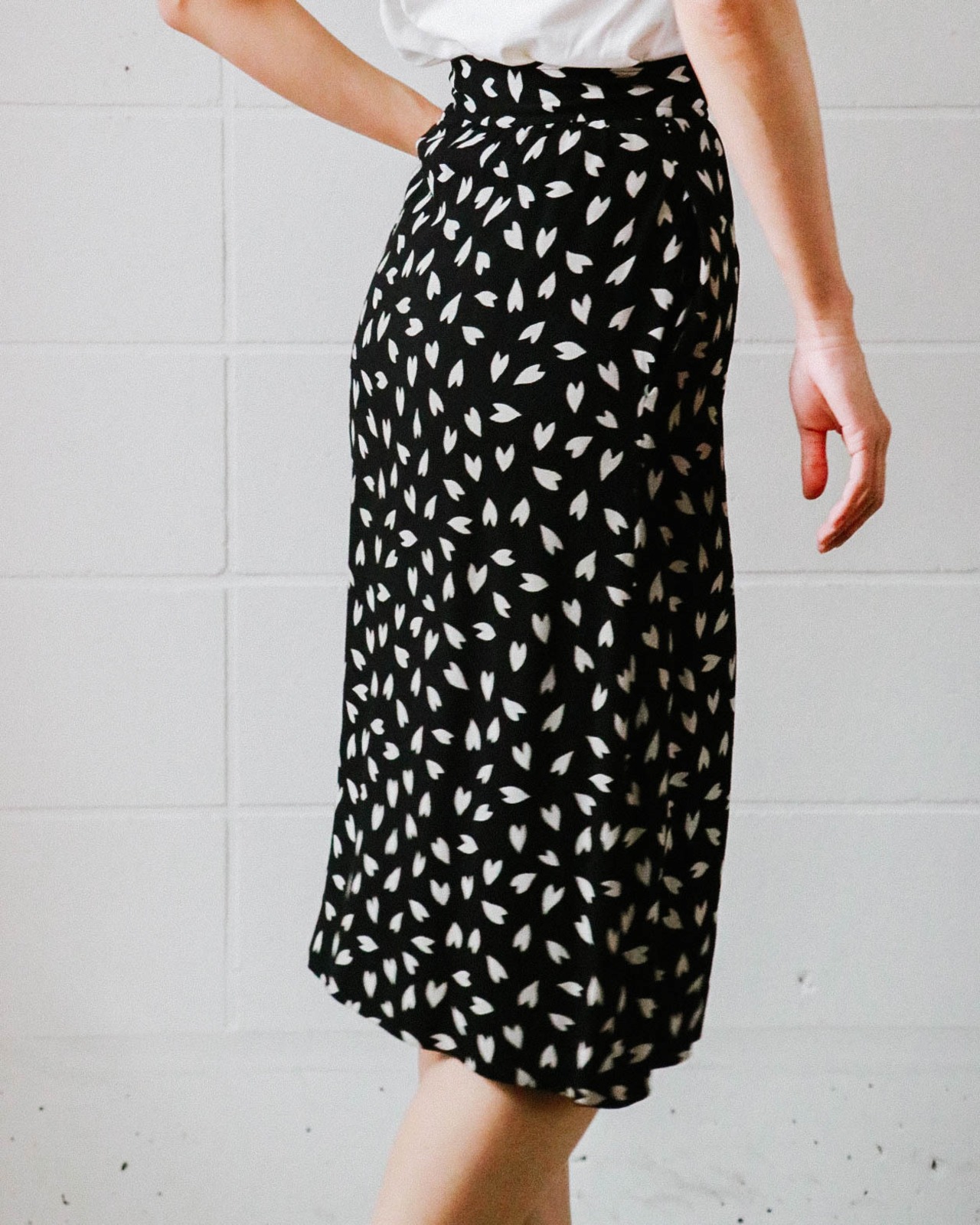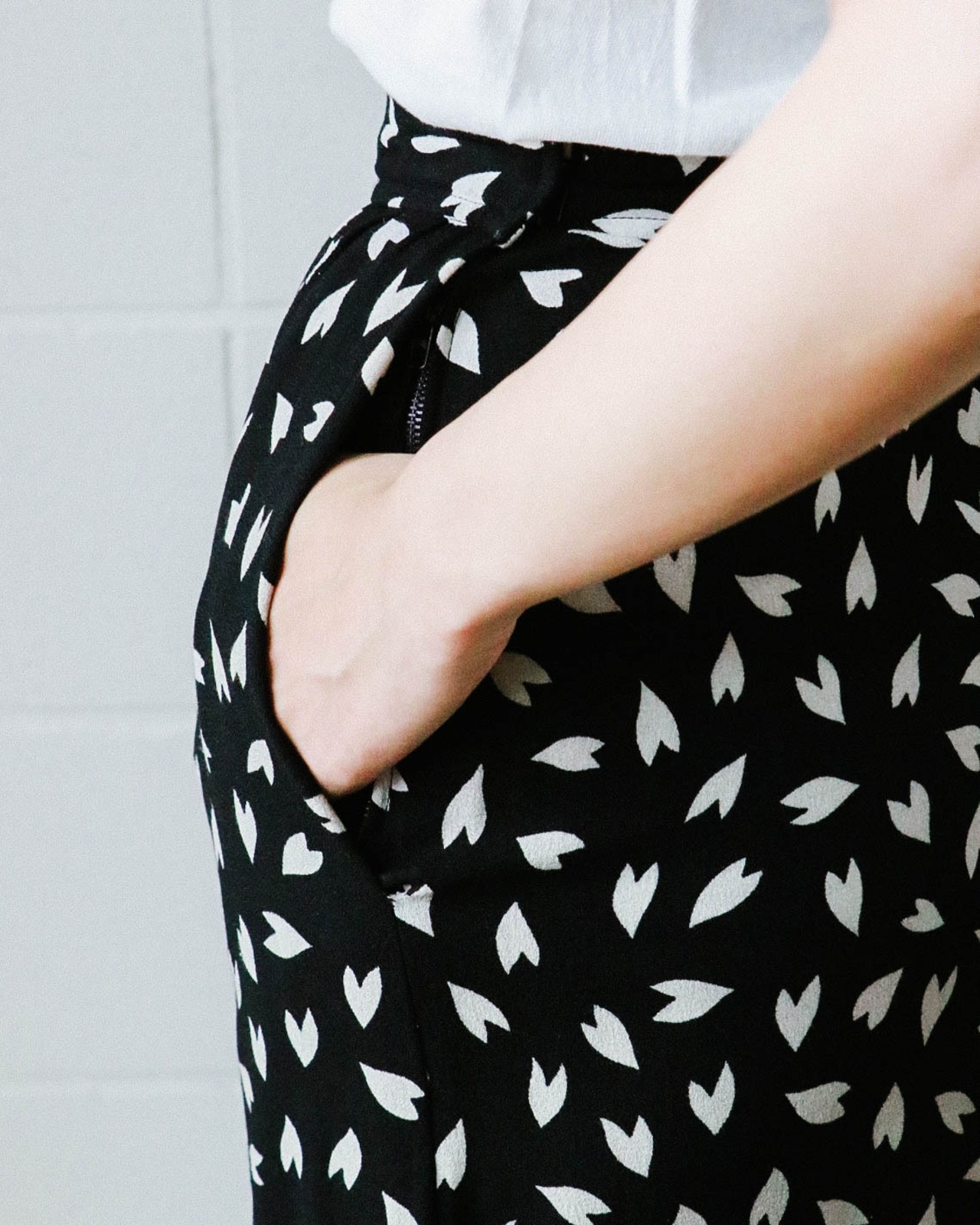 重くなりがちな黒ベースですが、レーヨンの風合いで涼しげな印象に。